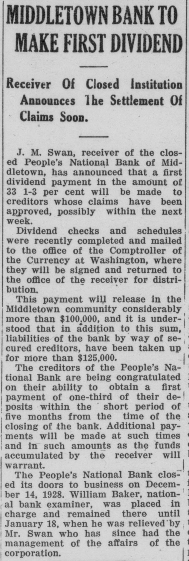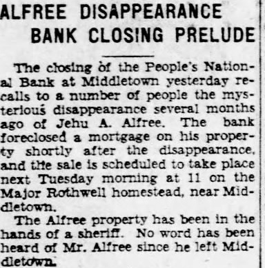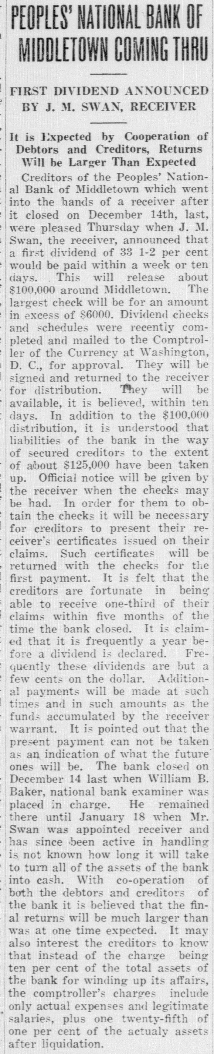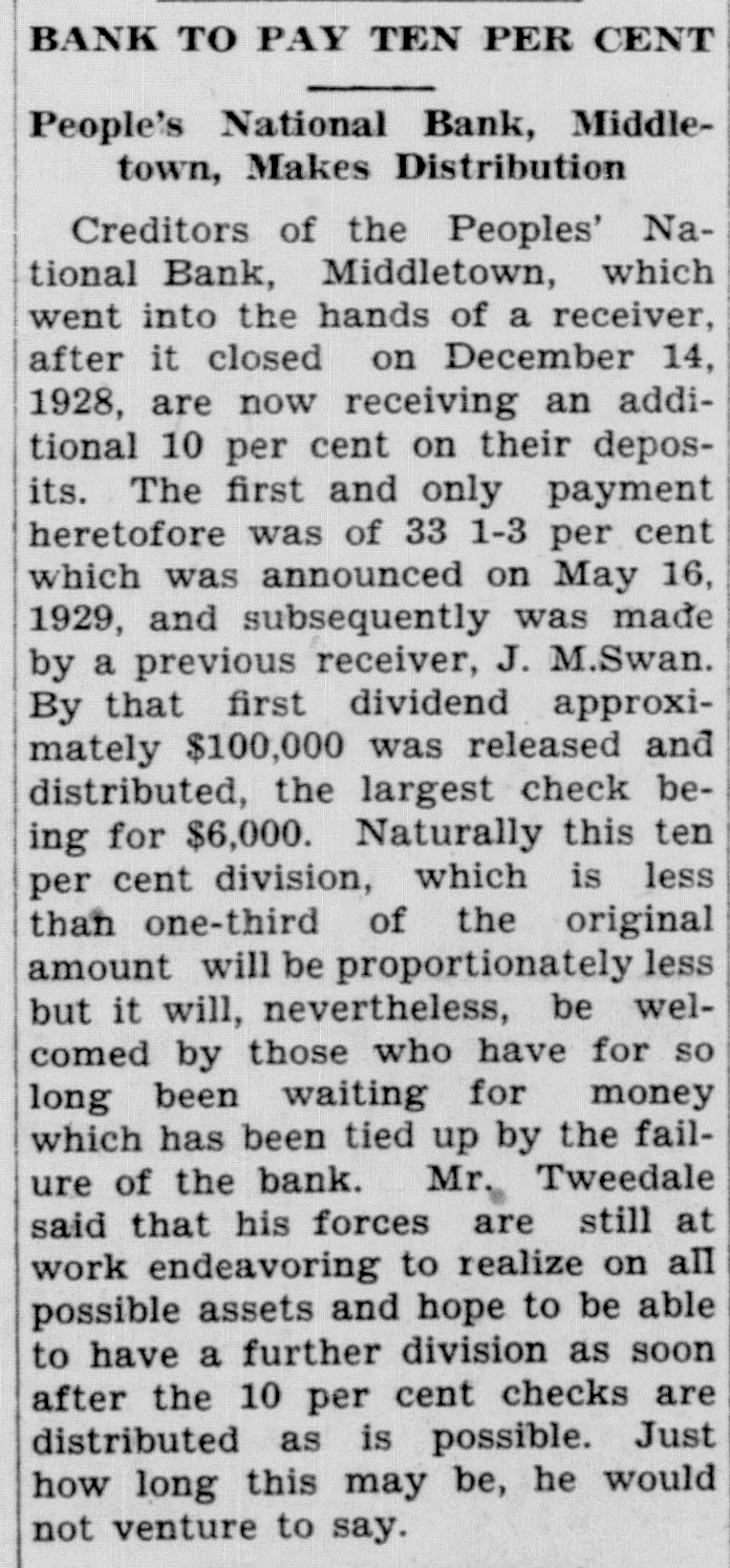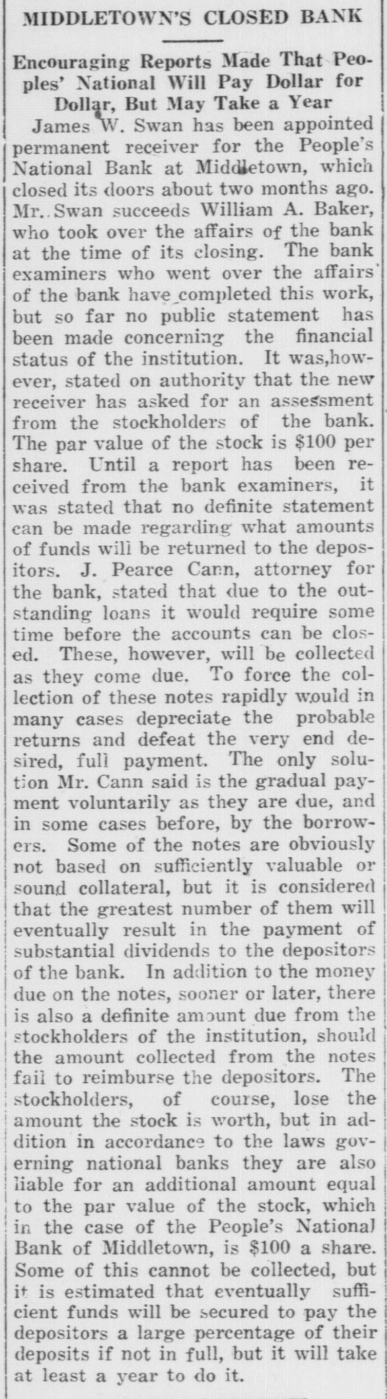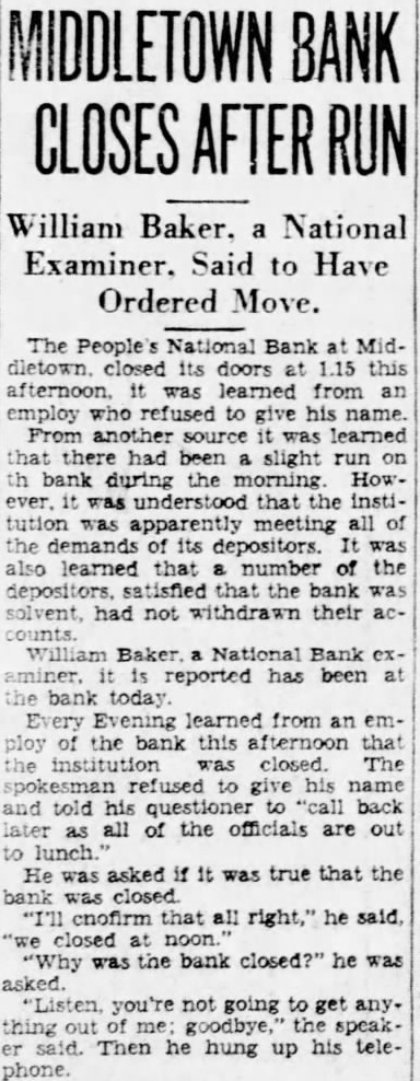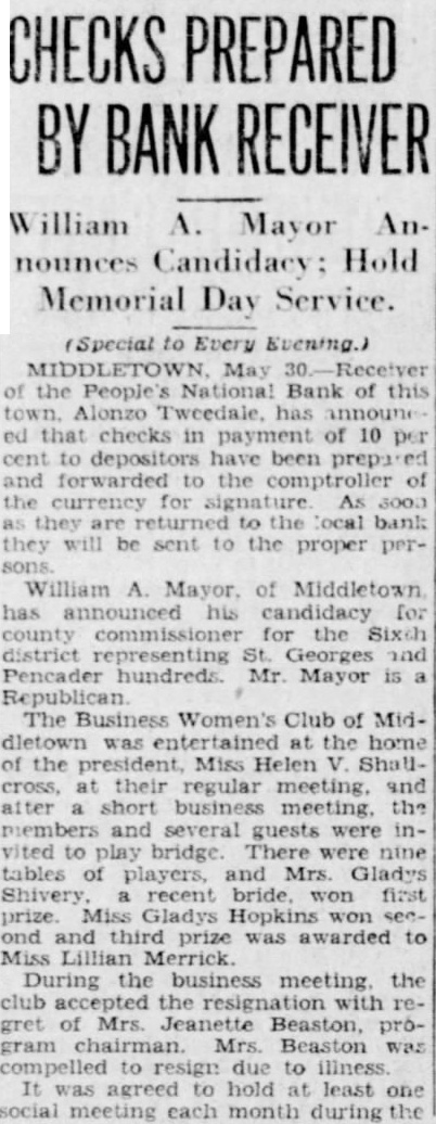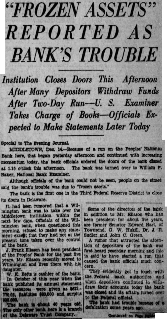 (Continued from page 1) not thought that the man with foul play. However, there were some who believed that Betts committed suicide. Believed Result of Accident. Dr. Warren Coombs, dentist John both Middletown, visited the scene the accident this morning, and expressed themselves of the opinion that Mr. Betts' death was unquestionably the result of an accident. There heavy fog at the time and is likely, in their opinion, that in driving across the causeway at Drawyers', his car skidded, or he failed control properly, with the crash into the tree result. Members of Betts' family and bank workers said that they observed nothing in the man's conduct yesterday. He arose at the usual hour said, had his breakfast, got his mail and then took his dog out for an airing. He the adjoining his home, M. and few minutes saying he would be about Betts come to Middletown from Milford about 10 years He married the father of one Winfield. 19 years old, medical student at the University of Pennsylvania. Betts member the Rotary Club and the Methodist EpiscoChurch. He was officer of loan association here. Meanwhile, the People's National accounts still being der the direction of Chief Examiner Stephen Neumhan, of the Third Federal Reserve District, Philadelphia. During the morning Neumham William Baker, the Federal Reser ve, receiver for the bank. He declined to comment on the but from source was learned that such was an that the People's National was not At the undertaking establishment Tobin. to which the body was taken for the autopsy, was said that the when found, was frozen would be to thaw the before it could be whether had entered the lungs, was for Real Thriller. the finding of the body less than 24 hours after the run on the bank in which Betts as ier. quiet little town today was stirred fever pitch Farmers and residents for miles around trooped Middletown and stood street corners speculating over the unusual chain of events of the past contained all of the ingredients for best-seller mystery story. This was the way it was pieced together: Betts left the bank before regular opening hour yesterday, saying he would back about M. Several hours later his automobile was found, partly the edge Drawyers Creek, miles from here. His hat lay on the floor the car there were stains, apparently formed by human blood. on the steering wheel and ignition switch. Discovery the wrecked automobile on the bank of the creek. where it had crashed into willow tree, was made by boy. An examination the revealed that the front of the automobile damaged, that the windshield was broken. Evidently this damage resulted when the car crashed into the tree. The motor of the was not running. quantity of salt was scattered on the floor the car. This discovery led the belief Betts, who known to carry first-aid kit in his automobile, had attempted stop the flow of blood after he had been injured. The car was parked on the bank near the deepest part of the creek, and thought that its drivhad stepped out of the car, dazed shock, look for help and had fallen into the creek and drowned. Later. State Highway police said they had found footprints leading from the the edge of the creek. During the night was reported that missing man had gone Philadelphia, This report originated from telephone message Mrs. Everett Lewis, friend of the Betts family. Mrs. Lewis believed that the message came from Harry Grabos ki, Philadelphia salesman, who said that "was right." The telephone connection with Philadelphia faulty, Mrs. Lewis said, and that reason was that she had understood the message. Mrs. Lewis said she questioned the person on the other of the phone about the accident which Betts' was "Oh, he is around all the assured her in reply, Mrs. Lewis Run On Bank Began on Thursday. run the Thursday. It until the close of business that was resumed again yesterday. During the morning hours, steady stream disregarding the rain and heavy fog, the and by noon of the cash on hand yesterday to $30,000 had At 1.15 P. M. the bank was closed and check of the counts begun by Federal bank examiners. Officials of the bank issued statement in the form of notice that was posted on the of the institution saying that the had suspended business by order of the board of directors, that was in the hands of of the They refused to on this notice. They however, that Betts' in order, that there had been no defalcation and that the institution solvent. Later, formal statement isby Pearce Cann, counsel for the bank. It read: "There was talk of merger with another bank, and this gave to rumors concerning the soundness the bank caused great number withdrawals. The institution closed in order to avoid Reorganization now progress, and all depositors are Chief Examiner Neumham refused issue a statement to newspapermen.