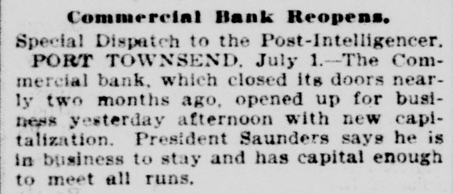 Commercial Bank Reopens. Special Dispatch to the Post-Intelligencer, PORT TOWNSEND July 1.-The Commercial bank. which closed its doors nearly two months ago, opened up for business yesterday afternoon with new capitalization. President Saunders says he is in business to stay and has capital enough to meet all runs,