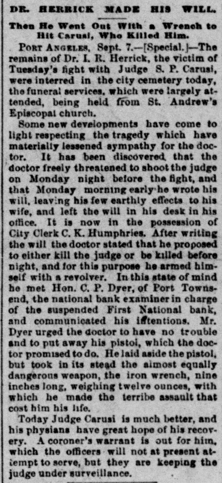 DR. HERRICK MADE HIS WILL. Then He Went Out With a Wrench to Hit Carusi, Who Killed Him. PORT ANGELES, Sept. 7.-[Special.|-The remains of Dr. I. R. Herrick, the victim of Tuesday's fight with Judge S. P. Carusi, were interred in the city cemetery today, the funeral services. which were largely attended, being held from St. Andrew's Episcopal church. Some new developments have come to light respecting the tragedy which have materially lessened sympathy for the doctor. It has been discovered that the doctor freely threatened to shoot the judge on Monday night before the fight, and that Monday morning early he wrote his will, leaving his few earthly effects to his wife, and left the will in his desk in his office. It is now in the possession of City Clerk C. K. Humphries. After writing the will the doctor stated that he proposed to either kill the judge or be killed before night, and for this purpose he armed himself with a revolver. In this state of mind he met Hon. C.P. Dyer, of Port Townsend, the national bank examiner in charge of the suspended First National bank, and communicated his intentions. Mr. Dyer urged the doctor to have no trouble and to put away his pistoi, which the doctor promised to do. Helaid aside the pistol, but took in its stead the almost equally dangerous weapon, the iron wrench, nine inches long, weighing twelve ounces, with which he made the terribe assault that cost him his life. Today Judge Carusi is much better, and his physians have great hope of his recovery. A coroner's warrant is out for him. which the officers will not at present attempt to serve, but they are keeping the judge under surveillance.