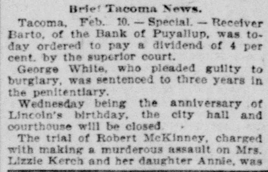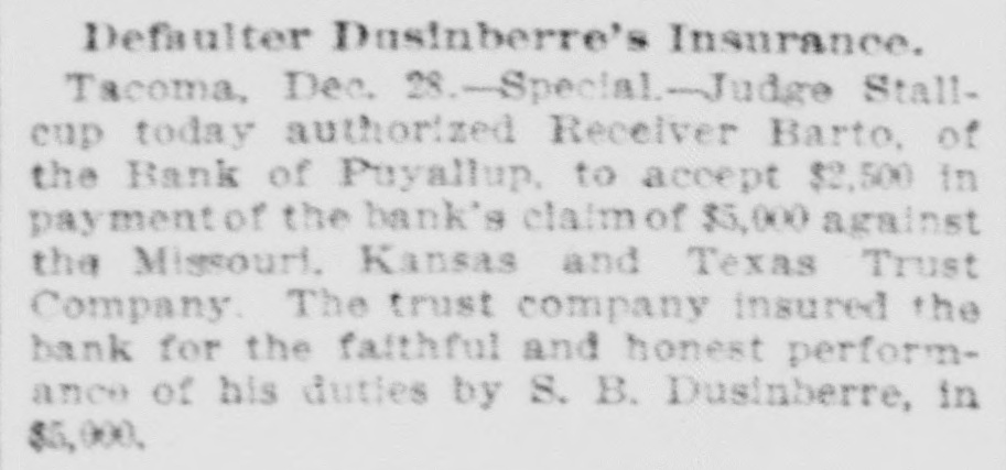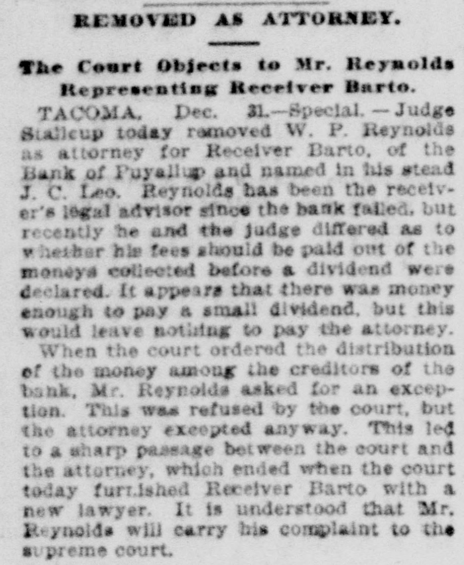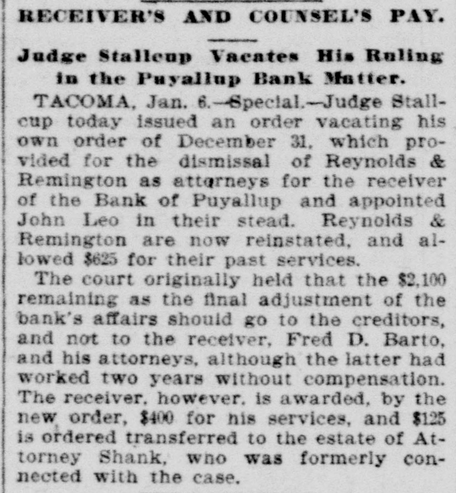 RECEIVER'S AND COUNSEL'S PAY. Judge Stalleup Vacates His Ruling in the Puyallup Bank Matter. TACOMA, Jan. 6.-Special.Judge Stallcup today issued an order vacating his own order of December 31, which provided for the dismissal of Reynolds & Remington as attorneys for the receiver of the Bank of Puyallup and appointed John Leo in their stead. Reynolds & Remington are now reinstated, and allowed $625 for their past services. The court originally held that the $2,100 remaining as the final adjustment of the bank's affairs should go to the creditors, and not to the receiver, Fred D. Barto, and his attorneys, although the latter had worked two years without compensation. The receiver. however. is awarded, by the new order, $400 for his services, and $125 is ordered transferred to the estate of Attorney Shank, who was formerly connected with the case.