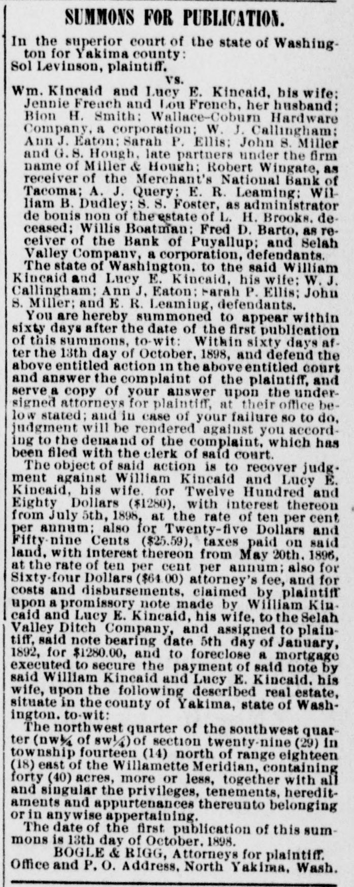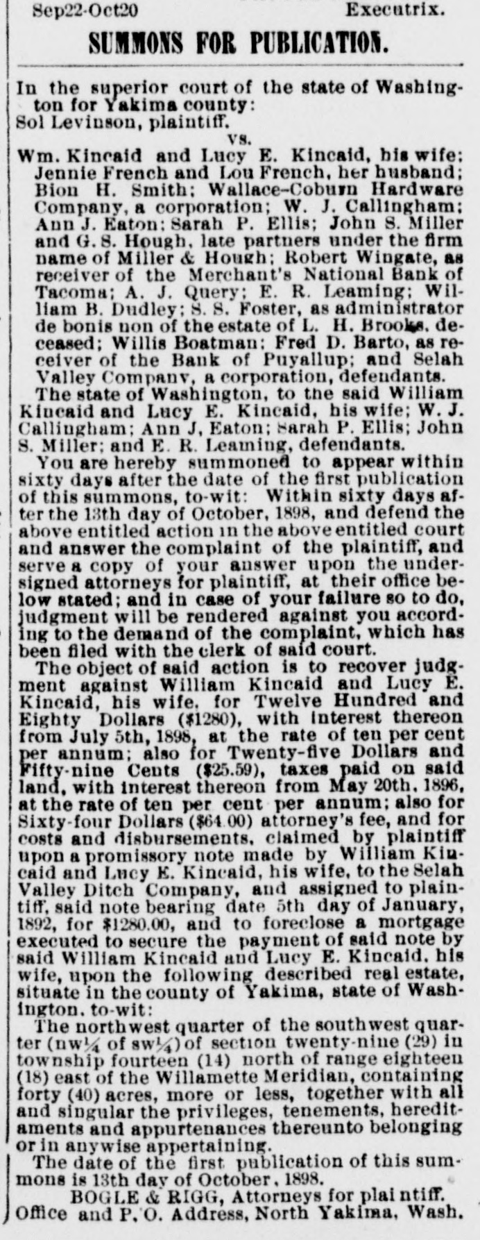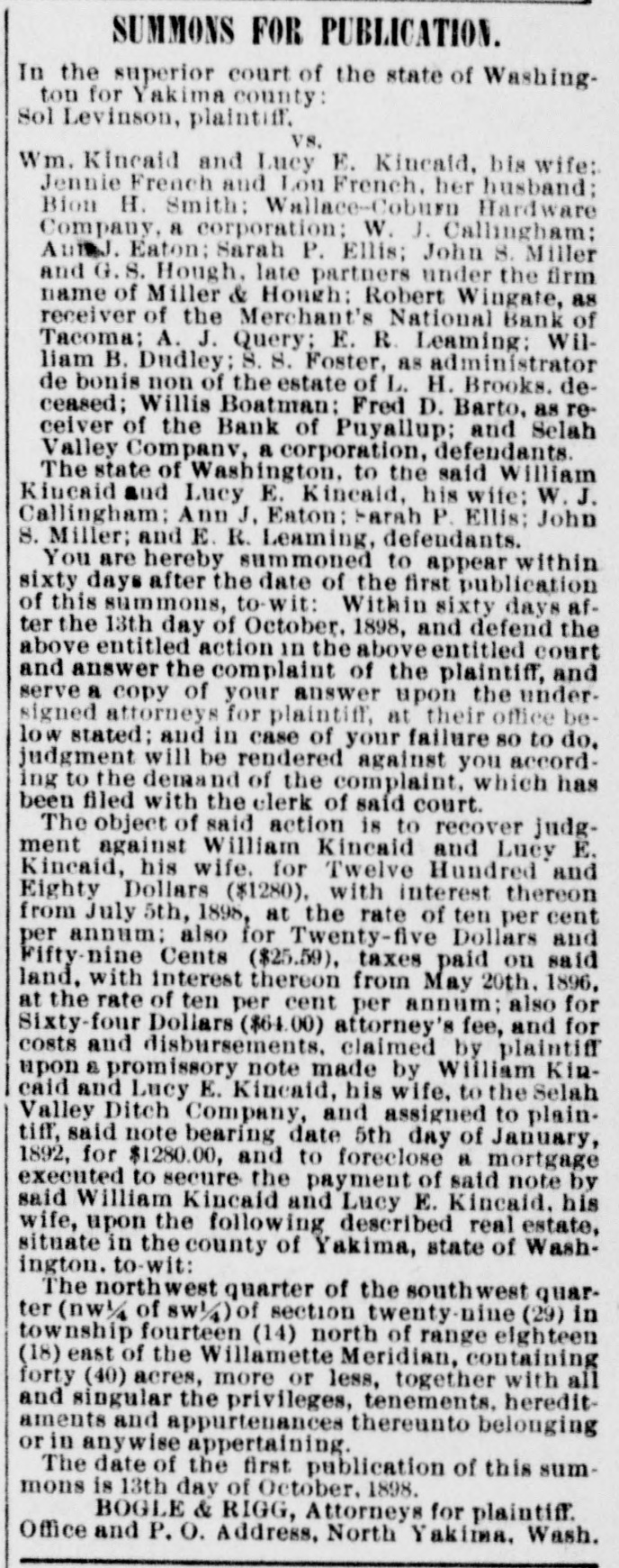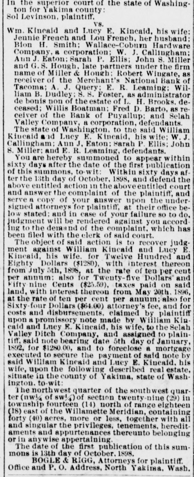 Executrix. Sep22-Oct20 SUMMONS FOR PUBLICATION. In the superior court of the state of Washington for Yakima county: Sol Levinson, plaintiff. vs. Wm. Kincaid and Lucy E. Kincaid, his wife: Jennie French and Lou French. her husband; Bion H. Smith: Wallace-Cobum Hardware Company, a corporation; W. J. Callingham: Ann J. Eaton: Sarah P. Ellis; John S. Miller and G. S. Hough. late partners under the firm name of Miller & Hough: Robert Wingate, as receiver of the Merchant's National Bank of Tacoma; A. J. Query: E. R. Leaming; William B. Dudley; S. S. Foster, as administrator de bonis non of the estate of L. H. Brooks. deceased: Willis Boatman: Fred D. Barto, as receiver of the Bank of Puyallup; and Selah Valley Company, a corporation, defendants. The state of Washington, to the said William Kincaid and Lucy E. Kincaid, his wife; W. J. Callingham: Ann J, Eaton; Sarah P. Ellis; John S. Miller: and E. R. Leaming, defendants. You are hereby summoned to appear within sixty days after the date of the first publication of this summons, to-wit: Within sixty days after the 13th day of October, 1898, and defend the above entitled action in the above entitled court and answer the complaint of the plaintiff, and serve a copy of your answer upon the undersigned attorneys for plaintiff, at their office below stated; and in case of your failure 80 to do, judgment will be rendered against you according to the demand of the complaint, which has been filed with the clerk of said court. The object of said action is to recover judgment against William Kincaid and Lucy E. Kincaid, his wife. for Twelve Hundred and Eighty Dollars ($1280), with interest thereon from July 5th, 1898, at the rate of ten per cent per annum; also for Twenty-five Dollars and Fifty-nine Cents ($25.59), taxes paid on said land. with interest thereon from May 20th. 1896, at the rate of ten per cent per annum; also for Sixty-four Dollars ($64.00) attorney's fee, and for costs and disbursements. claimed by plaintiff upon a promissory note made by William Kincaid and Lucy E. Kincaid, his wife, to the Selah Valley Ditch Company, and assigned to plaintiff, said note bearing date 5th day of January, 1892, for $1280.00, and to foreclose a mortgage executed to secure the payment of said note by said William Kincaid and Lucy E. Kincaid. his wife, upon the following described real estate, situate in the county of Yakima, state of Washington. to-wit: The northwest quarter of the southwest quarter (nw1/4 of sw1/4) of section twenty-nine (29) in township fourteen (14) north of range eighteen (18) east of the Willamette Meridian, containing forty (40) acres, more or less, together with all and singular the privileges, tenements, hereditaments and appurtenances thereunto belonging or in anywise appertaining. The date of the first publication of this summons is 13th day of October. 1898. BOGLE & RIGG, Attorneys for plai ntiff. Office and P. O. Address, North Yakima, Wash.
