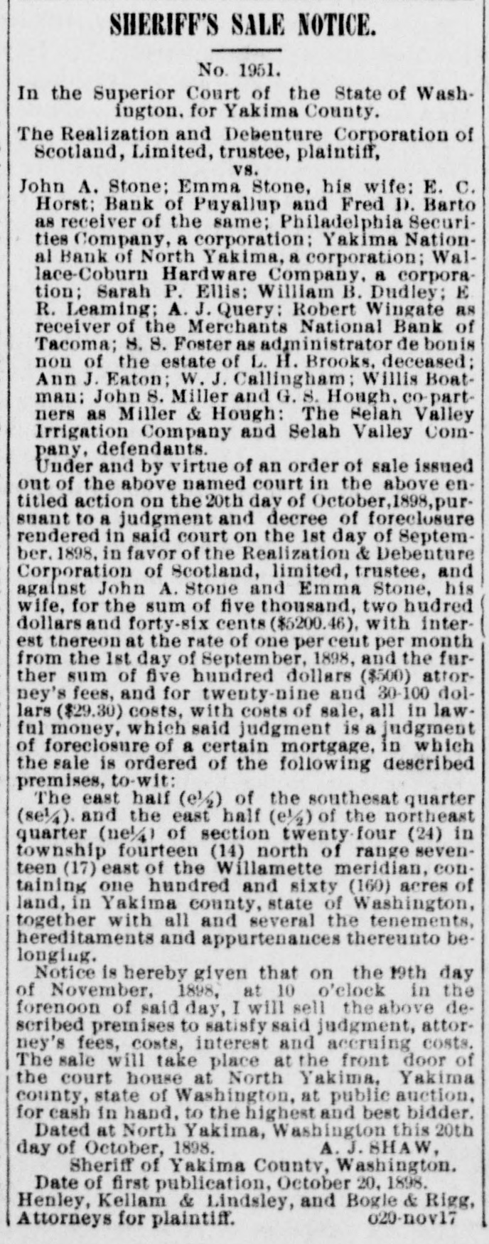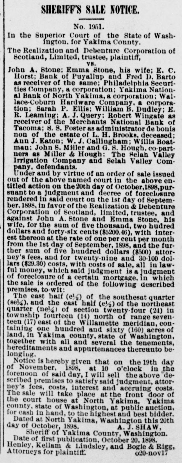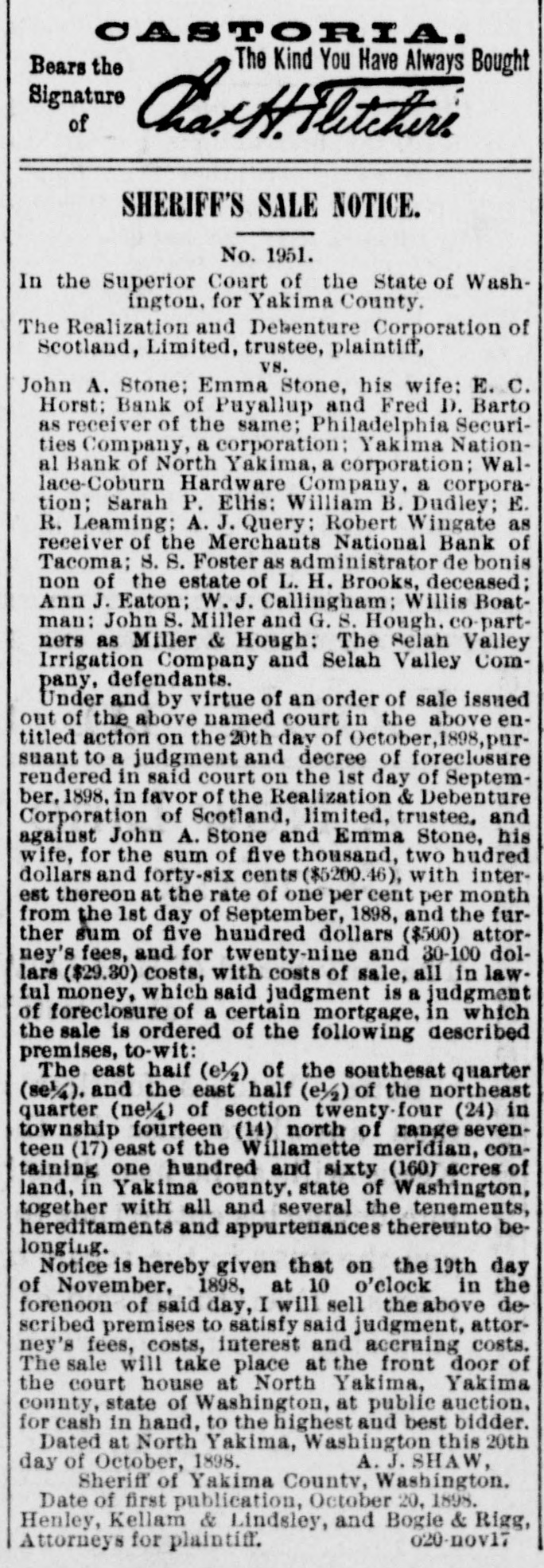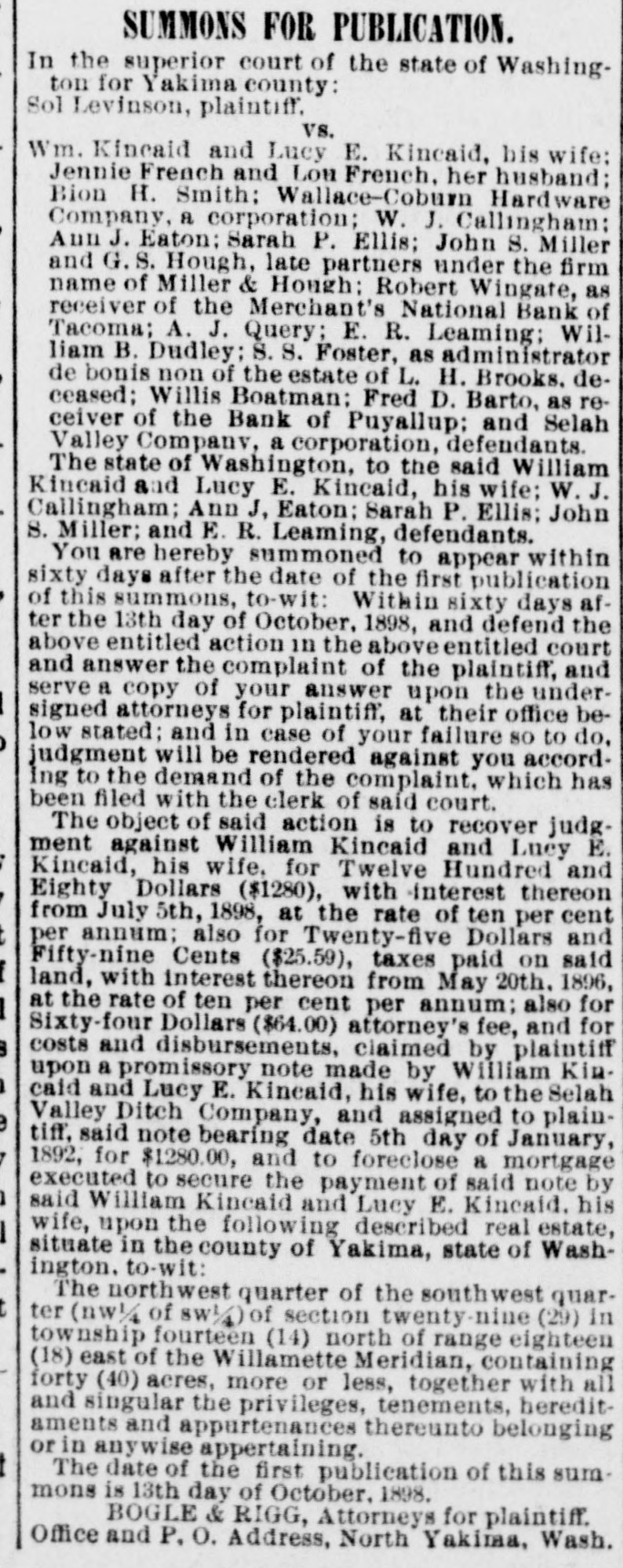 Executrix. Sep22-Oct20 SUMMONS FOR PUBLICATION. In the superior court of the state of Washington for Yakima county: Sol Levinson, plaintiff. vs. Wm. Kincaid and Lucy E. Kincaid, his wife: Jennie French and Lou French. her husband; Bion H. Smith: Wallace-Cobum Hardware Company, a corporation; W. J. Callingham: Ann J. Eaton: Sarah P. Ellis; John S. Miller and G. S. Hough. late partners under the firm name of Miller & Hough: Robert Wingate, as receiver of the Merchant's National Bank of Tacoma; A. J. Query: E. R. Leaming; William B. Dudley; S. S. Foster, as administrator de bonis non of the estate of L. H. Brooks. deceased: Willis Boatman: Fred D. Barto, as receiver of the Bank of Puyallup; and Selah Valley Company, a corporation, defendants. The state of Washington, to the said William Kincaid and Lucy E. Kincaid, his wife; W. J. Callingham: Ann J, Eaton; Sarah P. Ellis; John S. Miller: and E. R. Leaming, defendants. You are hereby summoned to appear within sixty days after the date of the first publication of this summons, to-wit: Within sixty days after the 13th day of October, 1898, and defend the above entitled action in the above entitled court and answer the complaint of the plaintiff, and serve a copy of your answer upon the undersigned attorneys for plaintiff, at their office below stated; and in case of your failure 80 to do, judgment will be rendered against you according to the demand of the complaint, which has been filed with the clerk of said court. The object of said action is to recover judgment against William Kincaid and Lucy E. Kincaid, his wife. for Twelve Hundred and Eighty Dollars ($1280), with interest thereon from July 5th, 1898, at the rate of ten per cent per annum; also for Twenty-five Dollars and Fifty-nine Cents ($25.59), taxes paid on said land. with interest thereon from May 20th. 1896, at the rate of ten per cent per annum; also for Sixty-four Dollars ($64.00) attorney's fee, and for costs and disbursements. claimed by plaintiff upon a promissory note made by William Kincaid and Lucy E. Kincaid, his wife, to the Selah Valley Ditch Company, and assigned to plaintiff, said note bearing date 5th day of January, 1892, for $1280.00, and to foreclose a mortgage executed to secure the payment of said note by said William Kincaid and Lucy E. Kincaid. his wife, upon the following described real estate, situate in the county of Yakima, state of Washington. to-wit: The northwest quarter of the southwest quarter (nw1/4 of sw1/4) of section twenty-nine (29) in township fourteen (14) north of range eighteen (18) east of the Willamette Meridian, containing forty (40) acres, more or less, together with all and singular the privileges, tenements, hereditaments and appurtenances thereunto belonging or in anywise appertaining. The date of the first publication of this summons is 13th day of October. 1898. BOGLE & RIGG, Attorneys for plai ntiff. Office and P. O. Address, North Yakima, Wash.