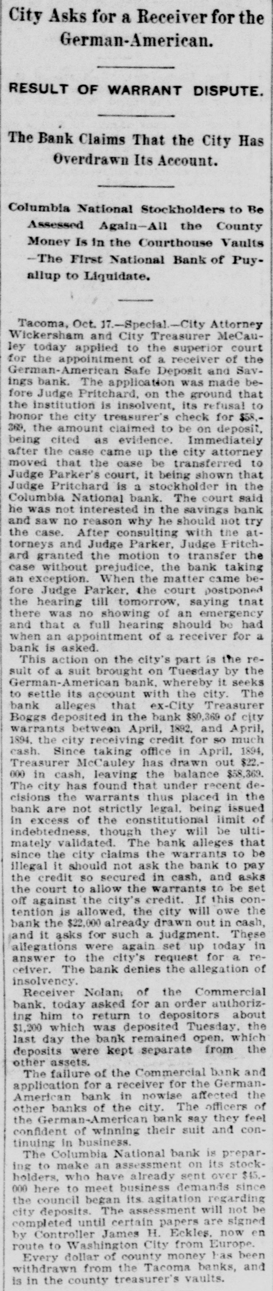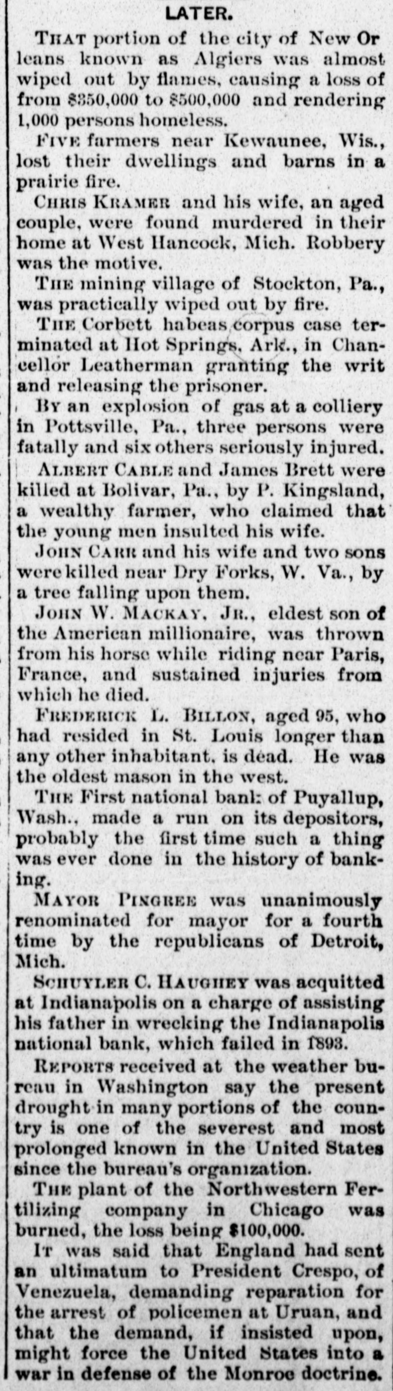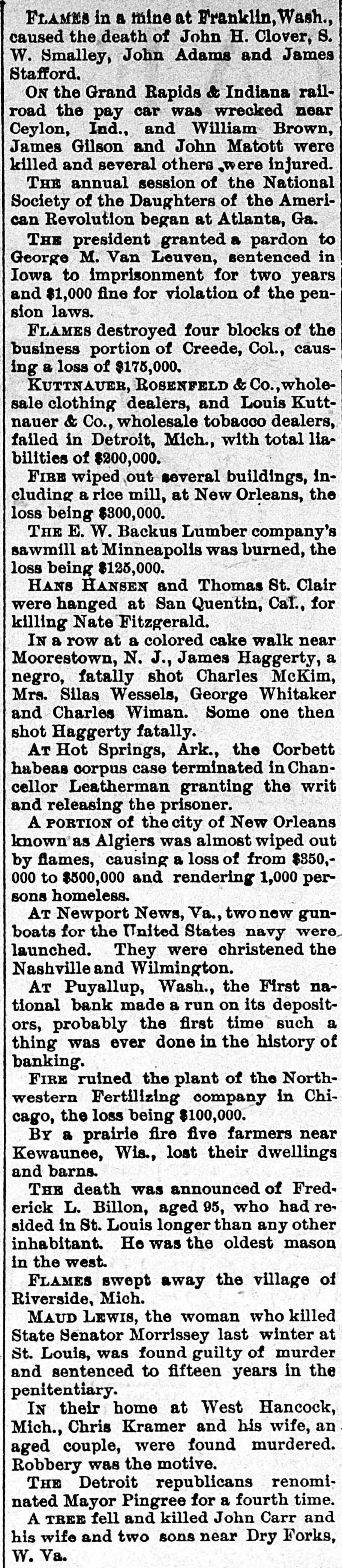FLAMES in a mine at Franklin, Wash., caused the death of John H. Clover, S. W. Smalley, John Adams and James Stafford. ON the Grand Rapids & Indiana railroad the pay car was wrecked near Ceylon, Ind., and William Brown, James Gilson and John Matott were killed and several others ,were injured. THE annual session of the National Society of the Daughters of the American Revolution began at Atlanta, Ga. THE president granted a pardon to George M. Van Leuven, sentenced in Iowa to imprisonment for two years and $1,000 fine for violation of the pension laws. FLAMES destroyed four blocks of the business portion of Creede, Col., causing a loss of $175,000. KUTTNAUER, ROSENFELD & Co., wholesale clothing dealers, and Louis Kuttnauer & Co., wholesale tobacco dealers, failed in Detroit, Mich., with total liabilities of $200,000. FIRE wiped out several buildings, including a rice mill, at New Orleans, the loss being $300,000. THE E. W. Backus Lumber company's sawmill at Minneapolis was burned, the loss being $125,000. HANS HANSEN and Thomas St. Clair were hanged at San Quentin, Cal., for killing Nate Fitzgerald. IN a row at a colored cake walk near Moorestown, N. J., James Haggerty, a negro, fatally shot Charles McKim, Mrs. Silas Wessels, George Whitaker and Charles Wiman. Some one then shot Haggerty fatally. AT Hot Springs, Ark., the Corbett habeas corpus case terminated in Chancellor Leatherman granting the writ and releasing the prisoner. A PORTION of the city of New Orleans known as Algiers was almost wiped out by flames, causing a loss of from $350,000 to $500,000 and rendering 1,000 persons homeless. AT Newport News, Va., twonew gunboats for the United States navy were, launched. They were christened the Nashvilleand Wilmington. AT Puyallup, Wash., the First national bank made a run on its depositors, probably the first time such a thing was ever done in the history of banking. FIRE ruined the plant of the Northwestern Fertilizing company in Chicago, the loss being $100,000. By a prairie fire five farmers near Kewaunee, Wis., lost their dwellings and barns. THE death was announced of Frederick L. Billon, aged 95, who had resided in St. Louis longer than any other inhabitant. He was the oldest mason in the west. FLAMES swept away the village of Riverside, Mich. MAUD LEWIS, the woman who killed State Senator Morrissey last winter at St. Louis, was found guilty of murder and sentenced to fifteen years in the penitentiary. IN their home at West Hancock, Mich., Chris Kramer and his wife, an aged couple, were found murdered. Robbery was the motive. THE Detroit republicans renominated Mayor Pingree for a fourth time. A TREE fell and killed John Carr and his wife and two sons near Dry Forks, W. Va.