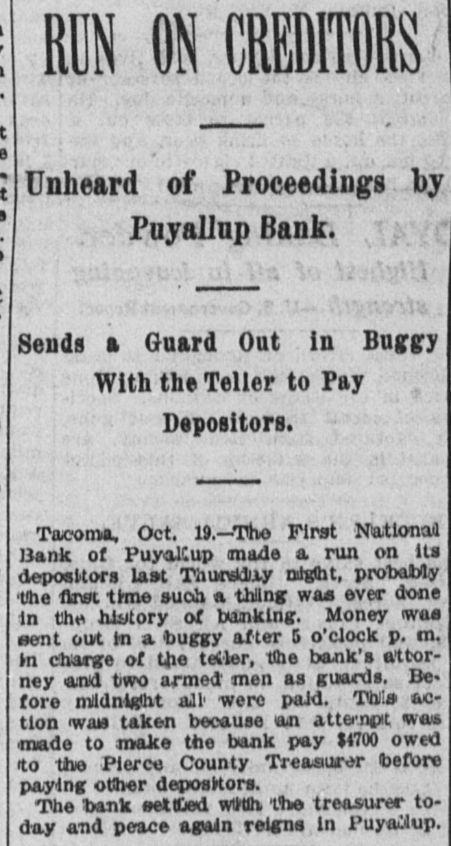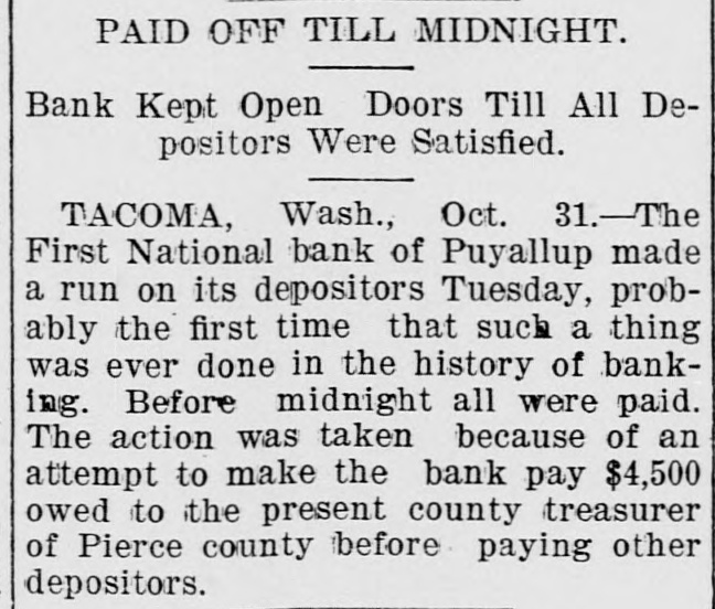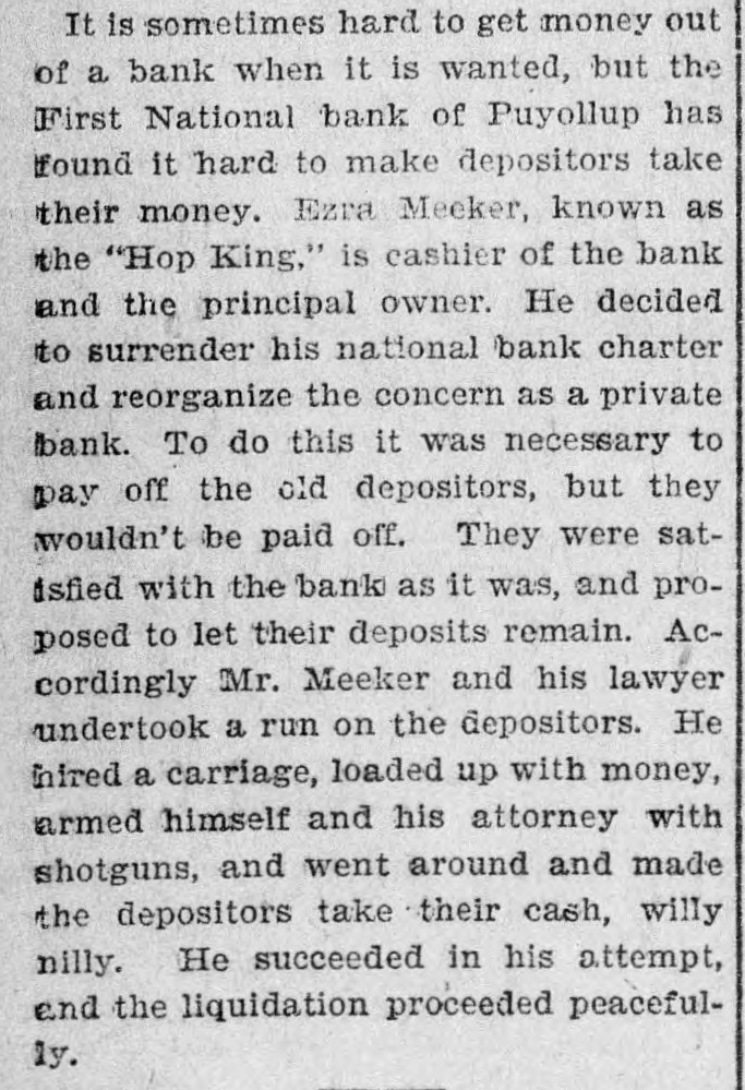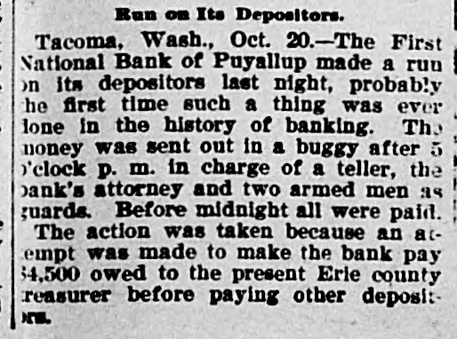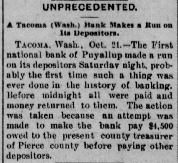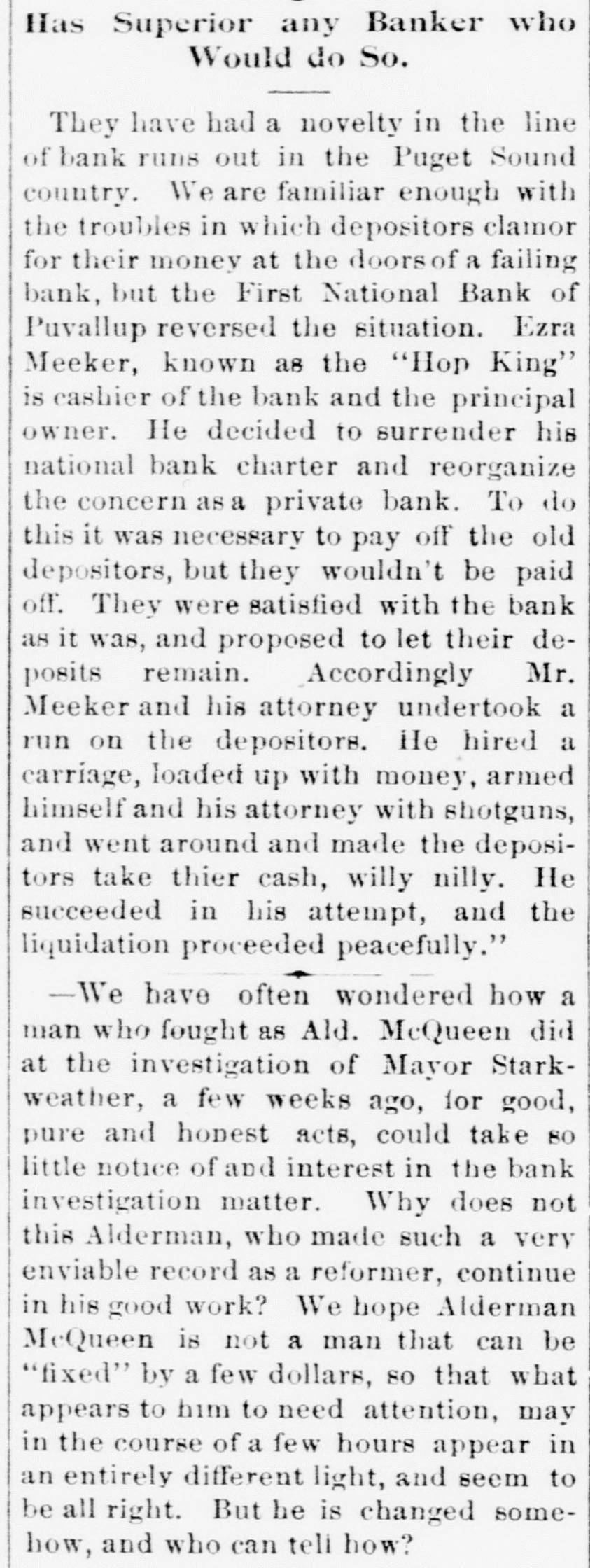 FLAMES in a mine at Franklin, Wash., caused the death of John H. Clover, S. W. Smalley, John Adams and James Stafford. ON the Grand Rapids & Indiana railroad the pay car was wrecked near Ceylon, Ind., and William Brown, James Gilson and John Matott were killed and several others ,were injured. THE annual session of the National Society of the Daughters of the American Revolution began at Atlanta, Ga. THE president granted a pardon to George M. Van Leuven, sentenced in Iowa to imprisonment for two years and $1,000 fine for violation of the pension laws. FLAMES destroyed four blocks of the business portion of Creede, Col., causing a loss of $175,000. KUTTNAUER, ROSENFELD & Co., wholesale clothing dealers, and Louis Kuttnauer & Co., wholesale tobacco dealers, failed in Detroit, Mich., with total liabilities of $200,000. FIRE wiped out several buildings, including a rice mill, at New Orleans, the loss being $300,000. THE E. W. Backus Lumber company's sawmill at Minneapolis was burned, the loss being $125,000. HANS HANSEN and Thomas St. Clair were hanged at San Quentin, Cal., for killing Nate Fitzgerald. IN a row at a colored cake walk near Moorestown, N. J., James Haggerty, a negro, fatally shot Charles McKim, Mrs. Silas Wessels, George Whitaker and Charles Wiman. Some one then shot Haggerty fatally. AT Hot Springs, Ark., the Corbett habeas corpus case terminated in Chancellor Leatherman granting the writ and releasing the prisoner. A PORTION of the city of New Orleans known as Algiers was almost wiped out by flames, causing a loss of from $350,000 to $500,000 and rendering 1,000 persons homeless. AT Newport News, Va., twonew gunboats for the United States navy were, launched. They were christened the Nashvilleand Wilmington. AT Puyallup, Wash., the First national bank made a run on its depositors, probably the first time such a thing was ever done in the history of banking. FIRE ruined the plant of the Northwestern Fertilizing company in Chicago, the loss being $100,000. By a prairie fire five farmers near Kewaunee, Wis., lost their dwellings and barns. THE death was announced of Frederick L. Billon, aged 95, who had resided in St. Louis longer than any other inhabitant. He was the oldest mason in the west. FLAMES swept away the village of Riverside, Mich. MAUD LEWIS, the woman who killed State Senator Morrissey last winter at St. Louis, was found guilty of murder and sentenced to fifteen years in the penitentiary. IN their home at West Hancock, Mich., Chris Kramer and his wife, an aged couple, were found murdered. Robbery was the motive. THE Detroit republicans renominated Mayor Pingree for a fourth time. A TREE fell and killed John Carr and his wife and two sons near Dry Forks, W. Va.