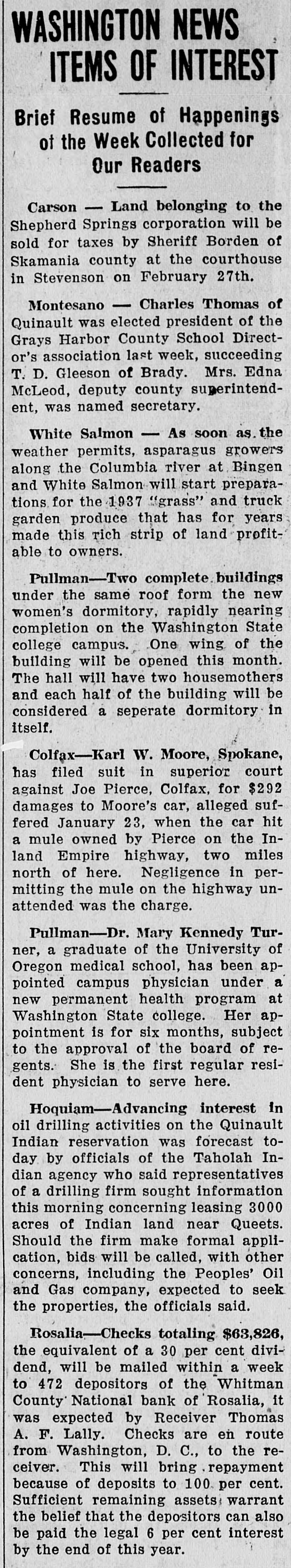 WASHINGTON NEWS ITEMS OF INTEREST Brief Resume of Happenings of the Week Collected for Our Readers Carson Land belonging to the Shepherd Springs corporation will be sold for taxes by Sheriff Borden of Skamania county at the courthouse in Stevenson on February 27th. Montesano - Charles Thomas of Quinault was elected president of the Grays Harbor County School Director's association last week, succeeding T. D. Gleeson of Brady. Mrs. Edna McLeod, deputy county superintendent, was named secretary. White Salmon - As soon as. the weather permits, asparagus growers along the Columbia river at Bingen and White Salmon-will start preparations for the 1937 "grass" and truck garden produce that has for years made this rich strip of land profitable to owners. Pullman-Two complete buildings under the same roof form the new women's dormitory, rapidly nearing completion on the Washington State college campus. One wing of the building will be opened this month. The hall will have two housemothers and each half of the building will be considered a seperate dormitory in itself. Colfax-Karl W. Moore, Spokane, has filed suit in superior court against Joe Pierce, Colfax, for $292 damages to Moore's car, alleged suffered January 23, when the car hit a mule owned by Pierce on the Inland Empire highway, two miles north of here. Negligence in permitting the mule on the highway unattended was the charge. Pullman-Dr. Mary Kennedy Turner, a graduate of the University of Oregon medical school, has been appointed campus physician under a new permanent health program at Washington State college. Her appointment is for six months, subject to the approval of the board of regents. She is the first regular resident physician to serve here. Hoquiam-Advancing interest in oil drilling activities on the Quinault Indian reservation was forecast today by officials of the Taholah Indian agency who said representatives of a drilling firm sought information this morning concerning leasing 3000 acres of Indian land near Queets. Should the firm make formal application, bids will be called, with other concerns, including the Peoples' Oil and Gas company, expected to seek the properties, the officials said. Rosalia-Checks totaling $63,826, the equivalent of a 30 per cent dividend, will be mailed within a week to 472 depositors of the Whitman County National bank of Rosalia, it was expected by Receiver Thomas A. F. Lally. Checks are en route from Washington, D. C., to the receiver. This will bring repayment because of deposits to 100. per cent. Sufficient remaining assets warrant the belief that the depositors can also be paid the legal 6 per cent interest by the end of this year.