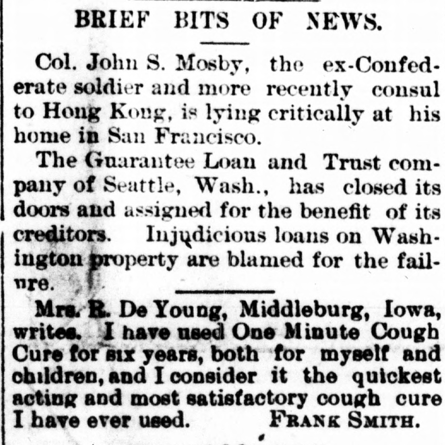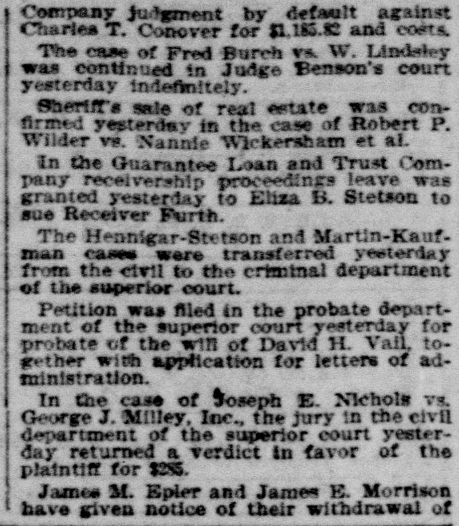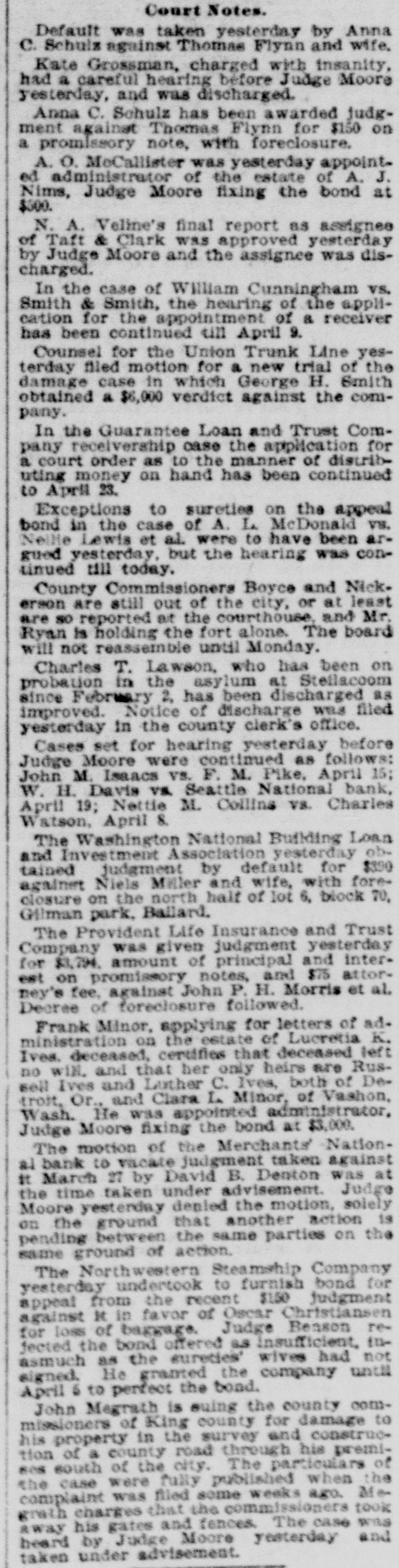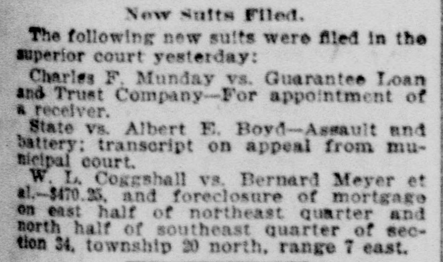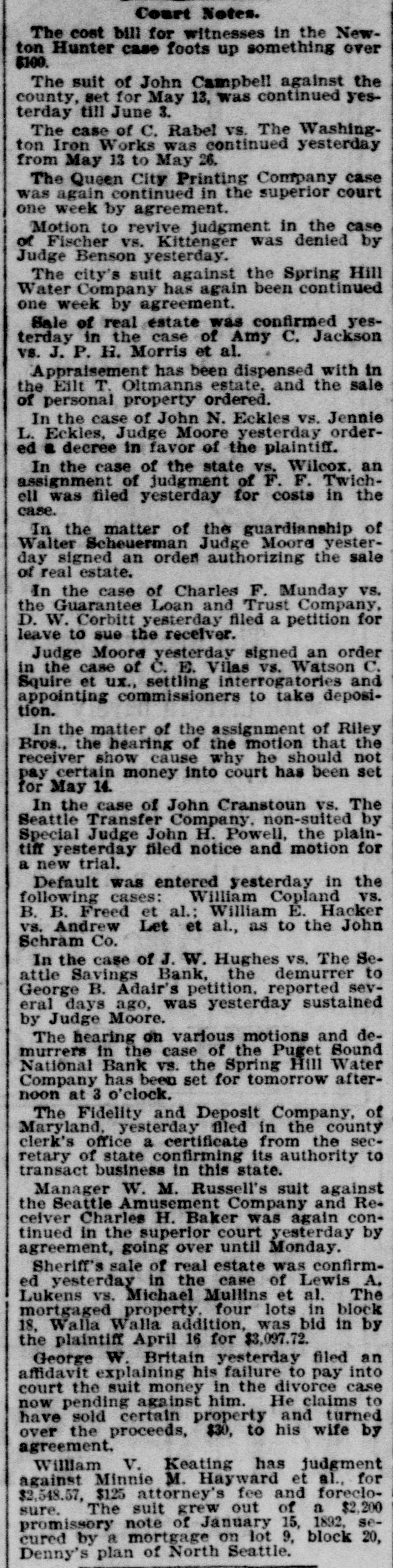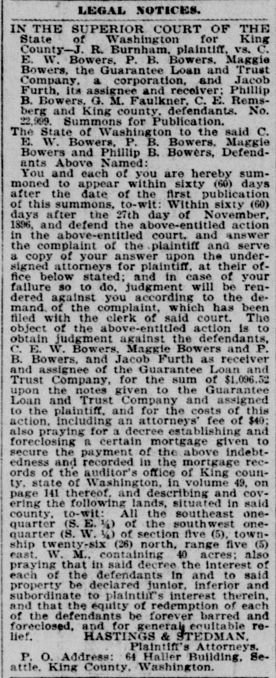 LEGAL NOTICES. IN THE SUPERIOR COURT OF THE State of Washington for King County-J. R. Burnham, plaintiff, vs. C. E. W. Bowers, P. B. Bowers, Maggie Bowers, the Guarantee Loan and Trust Company, a corporation, and Jacob Furth, its assignee and receiver: Phillip B. Bowers, G. M. Faulkner, C. E. Remsberg and King county, defendants. No. 22,999. Summons for Publication. The State of Washington to the said C. E. W. Bowers, P. B. Bowers. Maggie Bowers and Phillip B. Bowers, Defendants Above Named: You and each of you are hereby summoned to appear within sixty (60) days after the date of the first publication of this summons, to-wit: Within sixty (60) days after the 27th day of November, 1896, and defend the above-entitled action in the above-entitled court, and answer the complaint of the plaintiff and serve a copy of your answer upon the undersigned attorneys for plaintiff, at their office below stated; and in case of your failure so to do, judgment will be rendered against you according to the demand. of the complaint, which has been filed with the clerk of said court. The object of the above-entitled action is to obtain judgment against the defendants, C. E. W. Bowers, Maggie Bowers and P. B. Bowers, and Jacob Furth as receiver and assignee of the Guarantee Loan and Trust Company, for the sum of $1,096.52 upon the notes given to the Guarantee Loan and Trust Company and assigned to the plaintiff, and for the costs of this action, including an attorneys' fee of $40; also praying for a decree establishing and foreclosing a certain mortgage given to secure the payment of the above indebtedness and recorded in the mortgage records of the auditor's office of King county, state of Washington, in volume 49, on page 141 thereof, and describing and covering the following lands, situated in said county, to-wit: All the southeast onequarter (S. E. 1/4) of the southwest onequarter (S. W. 1/4) of section five (5), township twenty-six (26) north, range five (5) east, W. M., containing 40 acres; also praying that in said decree the Interest of each of the defendants in and to said property be declared junior, inferior and subordinate to plaintif's interest therein, and that the equity of redemption of each of the defendants be forever barred and foreclosed, and for generale equitable relief. HASTINGS & STEDMAN. Plaintiff's Attorneys. P. O. Address: 64 Haller Building, Seattle. King County, Washington.