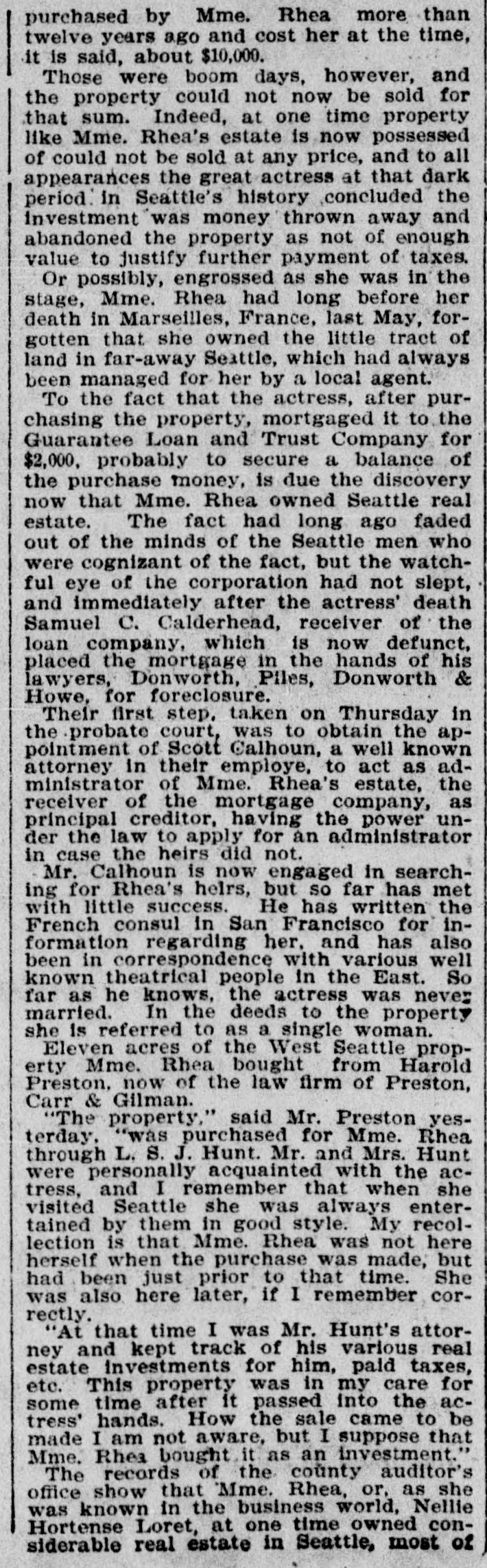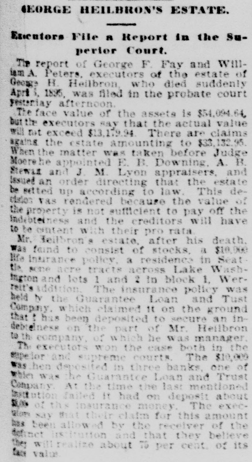 # GEORGE HEILBRON'S ESTATE. Excutors File a Report in the Superior Court. The report of George F. Fay and William A. Peters, executors of the estate of George H. Heilbron, who died suddenly April 1, 1835, was filed in the probate court yesterday afternoon. The face value of the assets is $54.094.64 but the executors say that the actual value will not exceed $13.179.94. There are claims againg the estate amounting to $33,132.95. When the matter was taken before Judge Moore he appointed E. B. Downing, A. B. Stewart and J. M. Lyon appraisers, and issued an order directing that the estate be setted up according to law. This dedados vas rendered because the value of the property is not sufficient to pay off the indebtedness and the creditors will have to be ontent with their pro rata. Mr. Heilbron's estate, after his death, was find to consist of stocks, a $10.000 life insurance policy, a residence in Seattle sone acre tracts across Lake Washington and lots 1 and 2 in block 1, Werreit's addition. The insurance policy was held by the Guarantee Loan and Tust Company, which claimed it on the ground that has been deposited to secure an indebtedness on the part of Mr. Heilbron to the company, of which he was manager. The executors won the case both in the supelor and supreme courts. The $10,000 was hen deposited in three banks, one of whier was the Guarantee Loan and Trust Company. At the time the last mentioned sttution failed it had on deposit about of the insurance money. The exec-los say that their claim for this amount has been allowed by the receiver of the cinct institution and that they believe they will realize about 5 per cent of its