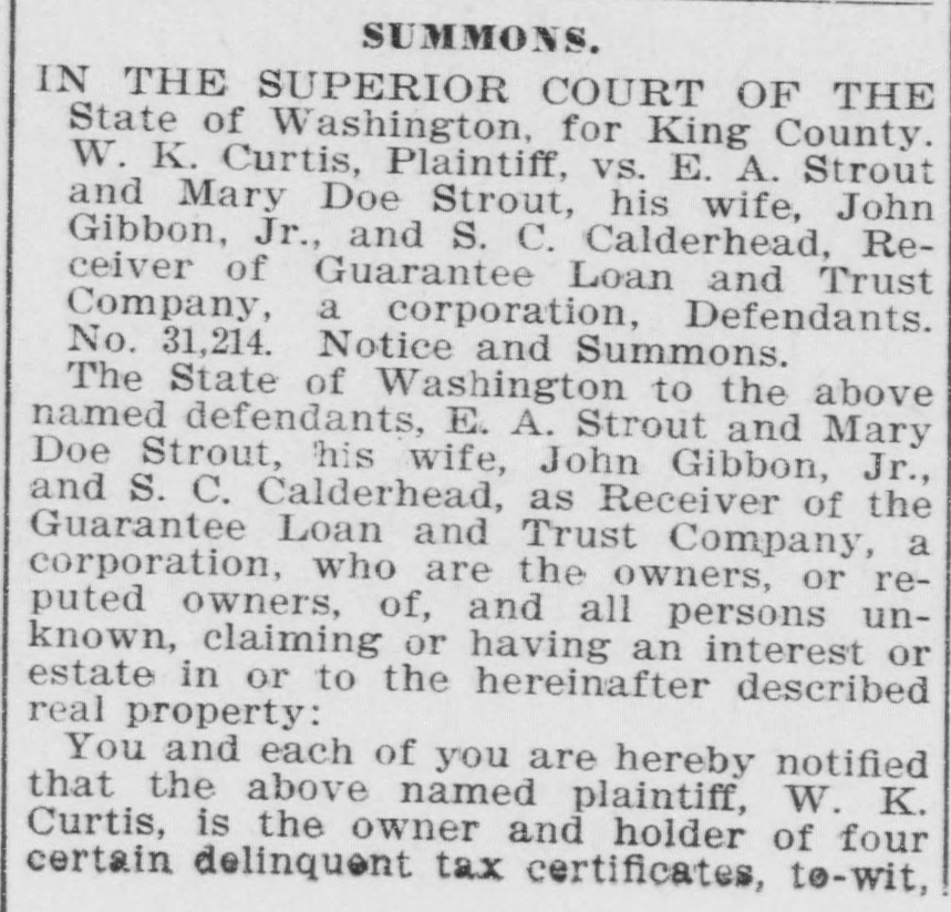 SUMMONS. IN THE SUPERIOR COURT OF THE State of Washington, for King County. W. K. Curtis, Plaintiff, vs. E. A. Strout and Mary Doe Strout, his wife, John Gibbon, Jr., and S. C. Calderhead, Receiver of Guarantee Loan and Trust Company, a corporation, Defendants. No. 31,214. Notice and Summons. The State of Washington to the above named defendants, E. A. Strout and Mary Doe Strout, his wife, John Gibbon, Jr., and S. C. Calderhead, as Receiver of the Guarantee Loan and Trust Company, a corporation, who are the owners, or reputed owners, of, and all persons unknown, claiming or having an interest or estate in or to the hereinafter described real property: You and each of you are hereby notified that the above named plaintiff, W. K. Curtis, is the owner and holder of four certain delinquent tax certificates, to-wit,