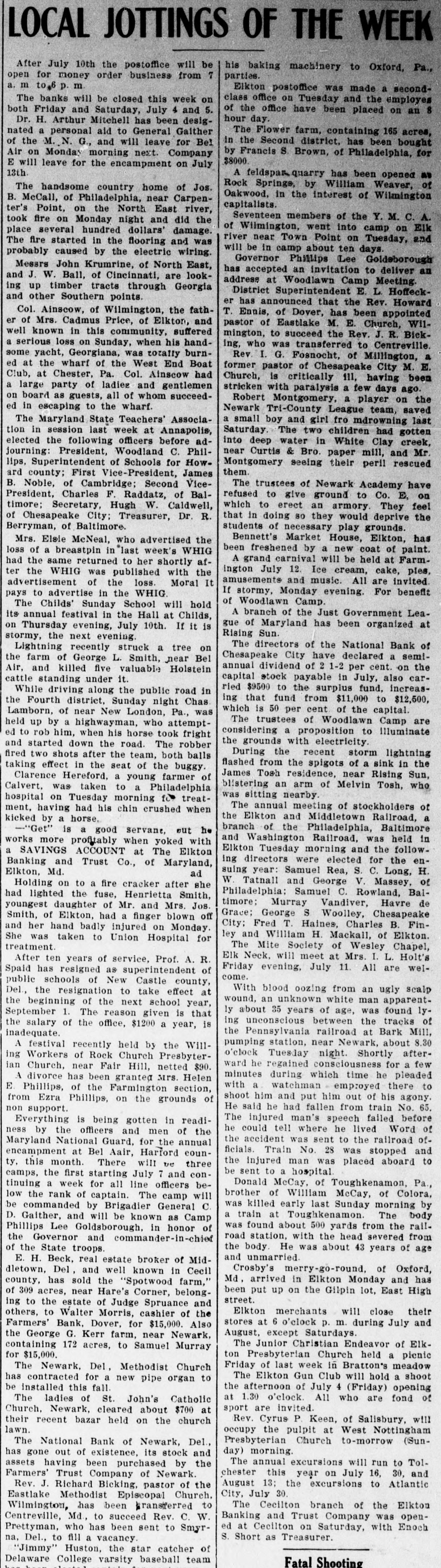 LOCAL JOTTINGS OF THE WEEK After July 10th the postoffice will be his baking machinery to Oxford, Pa., parties. open for money order business from 7 a. m to.6 p. m Elkton postoffice was made a secondThe banks will be closed this week on class office on Tuesday and the employes of the office have been placed on an 8 both Friday and Saturday, July 4 and 5. hour day. Dr. H. Arthur Mitchell has been designated a personal aid to General Gaither The Flower farm, containing 165 acres, in the Second district, has been bought of the M. N. G., and will leave for Bel Air on Monday morning next. Company by Francis S. Brown, of Philadelphia, for $8000. E will leave for the encampment on July 13th A feldspar-quarry has been opened as Rock Springs, by William Weaver, of The handsome country home of Jos. Oakwood, in the interest of Wilmington B. McCall, of Philadelphia, near Carpencapitalists. ter's Point, on the North East river, Seventeen members of the Y. M. A. took fire on Monday night and did the of Wilmington, went into camp on Elk place several hundred dollars' damage. river near Town Point on Tuesday, and The fire started in the flooring and was will be in camp about ten days. probably caused by the electric wiring. Governor Phillips Lee Goldsborough Messrs John Krumrine, of North East, has accepted an invitation to deliver an and J. W. Ball, of Cincinnati, are lookaddress at Woodlawn Camp Meeting. ing up timber tracts through Georgia District Superintendent E. L. Hoffeckand other Southern points. er has announced that the Rev. Howard Col. Ainscow, of Wilmington, the fathT. Ennis, of Dover, has been appointed er of Mrs. Cadmus Price, of Elkton, and pastor of Eastlake M. E. Church, Wilwell known in this community, suffered mington, to succeed the Rev. J. R. Bicka serious loss on Sunday, when his handing, who was transferred to Centreville. some yacht, Georgiana, was totally burnRev. I. G. Fosnocht, of Millington, a ed at the wharf of the West End Boat former pastor of Chesapeake City M. E. Club, at Chester, Pa. Col. Ainscow had Church, is critically ill, having been a large party of ladiez and gentlemen stricken with paralysis a few days ago. on board as guests, all of whom succeedRobert Montgomery, a player on the ed in escaping to the wharf. Newark Tri-County League team, saved The Maryland State Teachers' Associaa small boy and girl fro mdrowning last tion in session last week at Annapolis, Saturday. The two children had gotten elected the following officers before adinto deep water in White Clay creek, near Curtis & Bro. paper mill, and Mr. journing: President, Woodland C. PhilMontgomery seeing their peril rescued lips, Superintendent of Schools for Howthem. ard county; First Vice-President, James The trustees of Newark Academy have B. Noble, of Cambridge; Second Vicerefused to give ground to Co. E, on President, Charles F. Raddatz, of Balwhich to erect an armory. They feel timore; Secretary, Hugh W. Caldwell, that in doing so they would deprive the of Chesapeake City: Treasurer, Dr. R. Berryman, of Baltimore. students of necessary play grounds. Bennett's Market House, Elkton, has Mrs. Elsie McNeal, who advertised the been freshened by a new coat of paint. loss of a breastpin in "last week's WHIG A grand carnival will be held at Farmhad the same returned to her shortly af ington July 12. Ice cream, cake, pies, ter the WHIG was published with the amusements and music. All are invited advertisement of the loss. Moral It If stormy, Monday evening. For benefit pays to advertise in the WHIG. of Woodlawn Camp. The Childs' Sunday School will hold A branch of the Just Government Leaits annual festival in the Hall at Childs, gue of Maryland has been organized at on Thursday evening, July 10th. If it is Rising Sun. stormy, the next evening The directors of the National Bank of Lightning recently struck a tree on Chesapeake City have declared a semithe farm of George L. Smith, ,near Bel annual dividend of 1-2 per cent. on the Air, and killed five valuable Holstein capital stock payable in July, also carcattle standing under it. ried $9500 to the surplus fund, increasWhile driving along the public road in ing that fund from $11,000 to $12,500, the Fourth district, Sunday night Chas which is 50 per cent of the capital. Lamborn, of near New London, Pa., was The trustees of Woodlawn Camp are held up by a highwayman, who attemptconsidering a proposition to Illuminate ed to rob him, when his horse took fright the grounds with electricity. and started down the road. The robber During the recent storm lightning fired two shots after the team, both balls flashed from the spigots of a sink in the taking effect in the seat of the buggy. James Tosh residence, near Rising Sun, Clarence Hereford, a young farmer of blistering an arm of Melvin Tosh, who Calvert. was taken to a Philadelphia was sitting nearby hospital on Tuesday morning fc. treatThe annual meeting of stockholders of ment. having had his chin crushed when the Elkton and Middletown Railroad, a kicked by a horse. branch of the Philadelphia, Baltimore ""Get" is a good servant, out he and Washington Railroad, was held in works more profitably when yoked with Elkton Tuesday morning and the followa SAVINGS ACCOUNT at The Elkton ing directors were elected for the enBanking and Trust Co., of Maryland, Elkton, Md. suing year: Samuel Rea, S. C. Long, H. ad W. Tatnall and George V. Massey, of Holding on to a fire cracker after she Philadelphia Samuel C. Rowland, Balhad lighted the fuse, Henrietta Smith, timore: Murray Vandiver, Havre de youngest daughter of Mr. and Mrs. Jos. Grace: George S Woolley, Chesapeake Smith, of Elkton, had a finger blown off City: Fred T. Haines, Charles B. Finand her hand badly injured on Monday ley and William H. Mackall, of Elkton. She was taken to Union Hospital for treatment. The Mite Society of Wesley Chapel, Elk Neck, will meet at Mrs. I. L. Holt's After ten years of service, Prof. A. R Friday evening, July 11. All are welSpaid has 