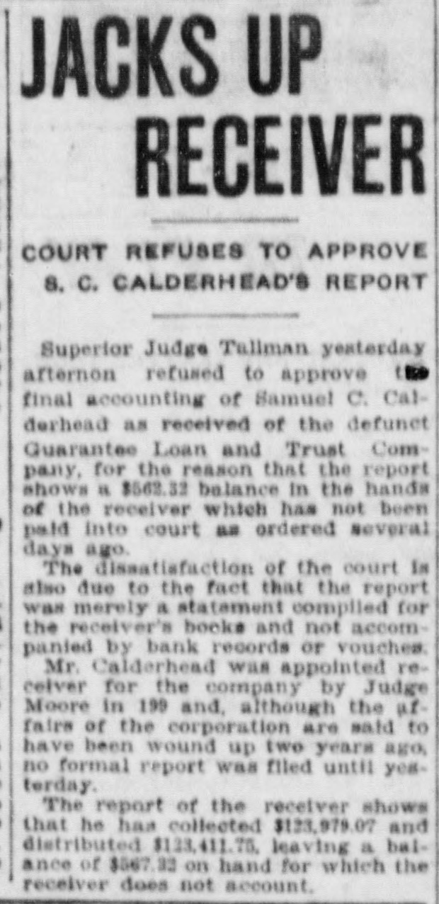 JACKS UP RECEIVER COURT REFUSES TO APPROVE 8. c. CALDERHEAD'S REPORT Superior Judge Tallman yesterday afternon refused to approve 11 final accounting of Samuel C. Calderhead as received of the defunct Guarantee Loan and Trust Company, for the reason that the report shows a $563.32 balance in the hands of the receiver which has not been paid into court as ordered several days ago. The disaatisfaction of the court In also due to the fact that the report was merely a statement complied for the receiver's books and not accompanied by bank records or vouches. Mr. Calderhead was appointed recelver for the company by Judge Moore in 199 and, although the usfairs of the corporation are said to have been wound up two years ago, no formal report was filed until yesterday. The report of the receiver shows that he has collected $123,979.07 and distributed $123,411.75. leaving a balance of $567.33 on hand for which the receiver does not account.