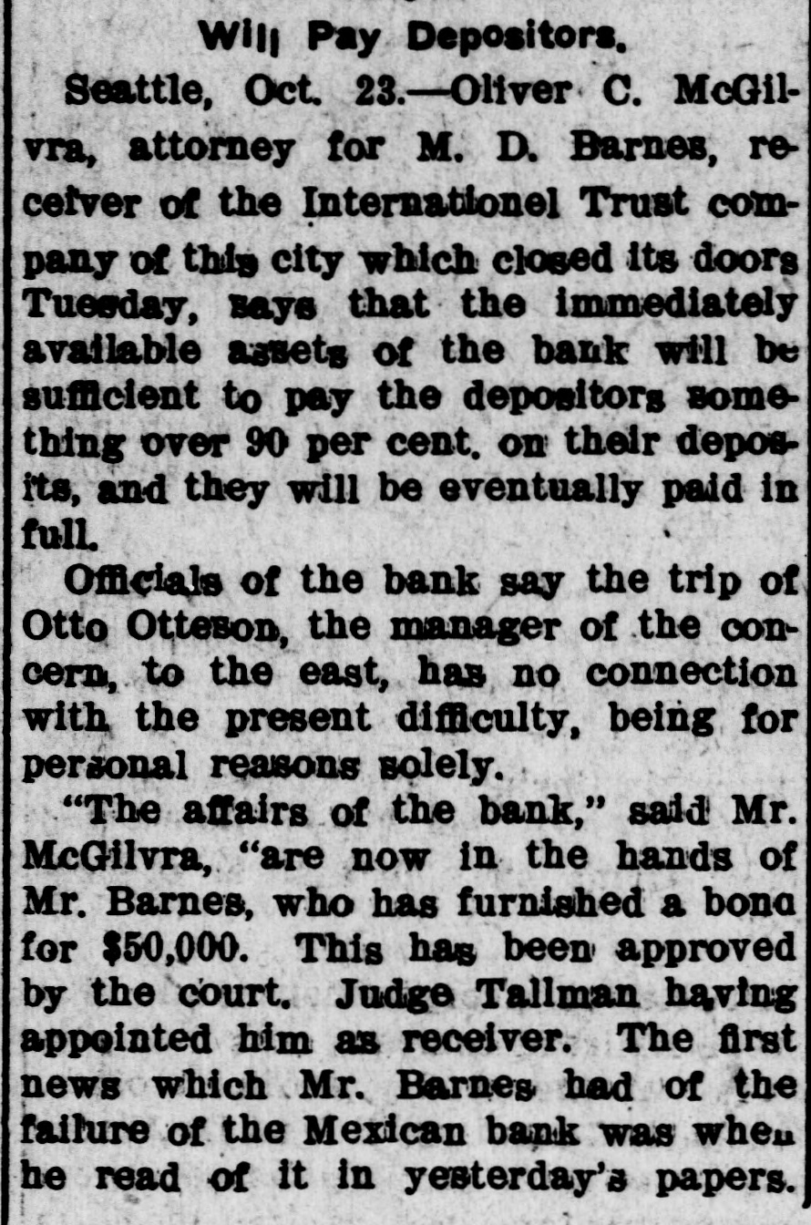 Will Pay Depositors. Seattle, Oct. 23.-Oliver C. McGilvra, attorney for M. D. Barnes, receiver of the Internationel Trust company of this city which closed its doors Tuesday, says that the immediately available assets of the bank will be sufficient to pay the depositors something over 90 per cent. on their deposits, and they will be eventually paid in full. Officials of the bank say the trip of Otto Otteson, the manager of the concern, to the east, has no connection with the present difficulty, being for personal reasons solely. "The affairs of the bank," said Mr. McGilvra, "are now in the hands of Mr. Barnes, who has furnished a bona for $50,000. This has been approved by the court. Judge Tallman having appointed him as receiver. The first news which Mr. Barnes had of the failure of the Mexican bank was when he read of it in yesterday's papers.