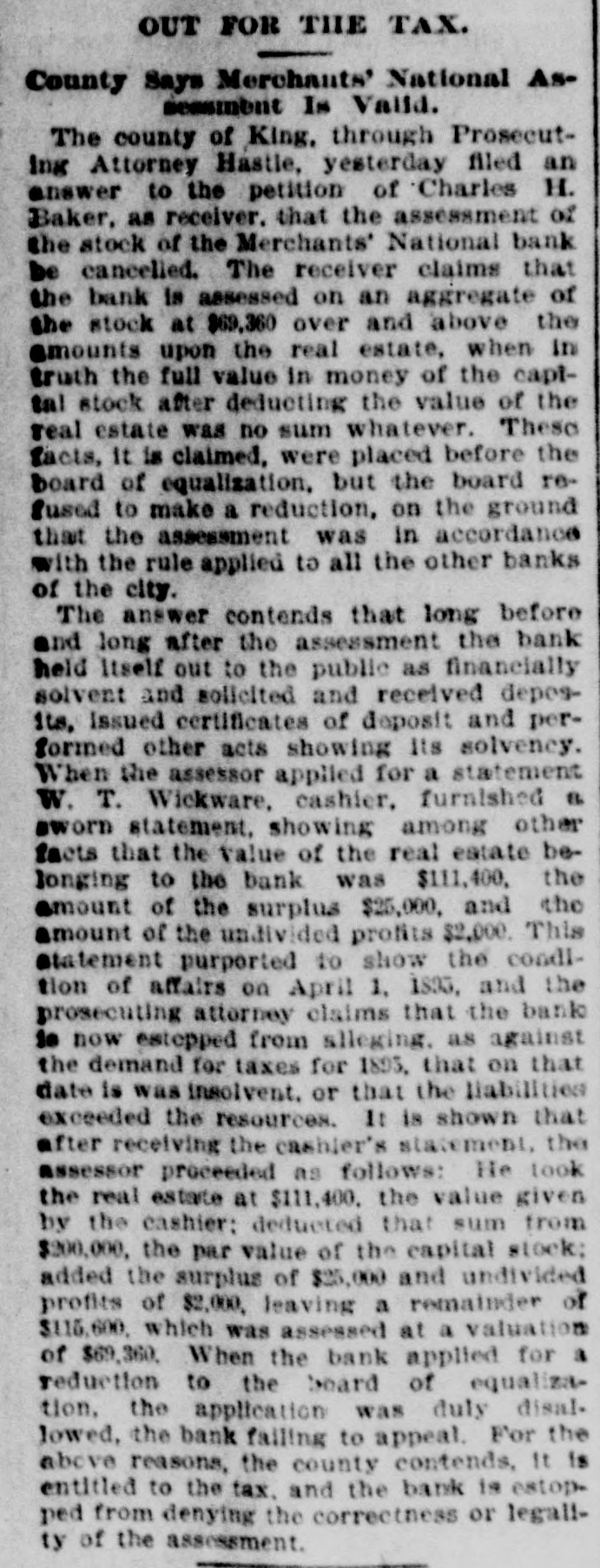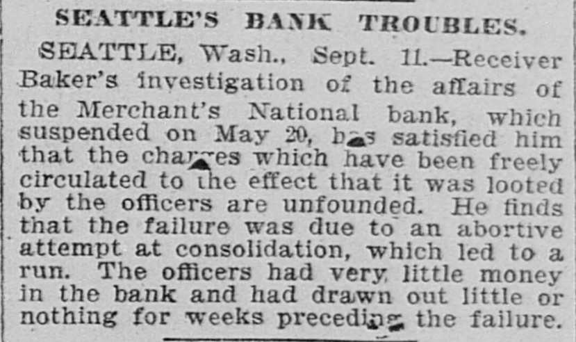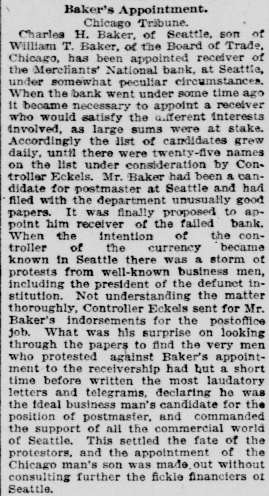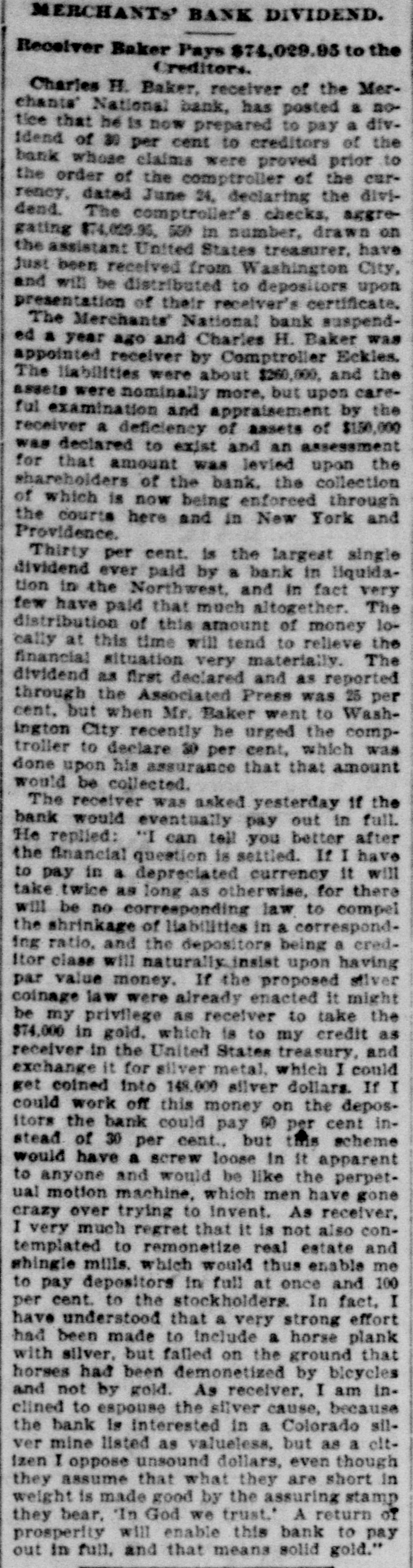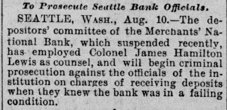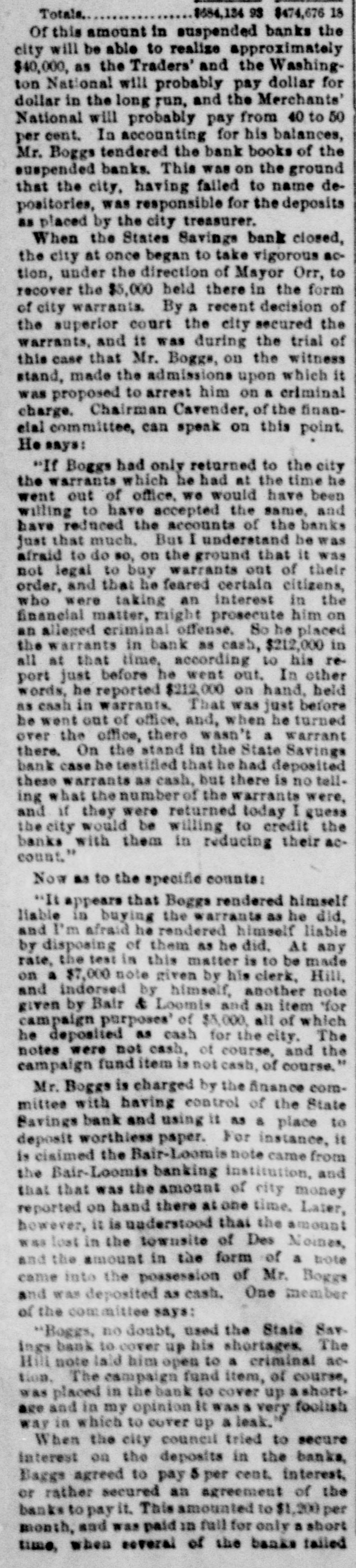 Totals. $684,134 93 $474,676 18 Of this amount in suspended banks the city will be able to realize approximately $40,000, as the Traders' and the Washington National will probably pay dollar for dollar in the long run, and the Merchants' National will probably pay from 40 to 50 per cent. In accounting for his balances, Mr. Boggs tendered the bank books of the suspended banks. This was on the ground that the city, having failed to name depositories, was responsible for the deposits as placed by the city treasurer. When the States Savings bank closed, the city at once began to take vigorous action, under the direction of Mayor Orr, to recover the $5,000 held there in the form of city warrants. By a recent decision of the superior court the city secured the warrants, and it was during the trial of this case that Mr. Boggs, on the witness stand, made the admissions upon which it was proposed to arrest him on a criminal charge. Chairman Cavender, of the financial committee, can speak on this point. He says: "If Boggs had only returned to the city the warrants which he had at the time he went out of office, we would have been willing to have accepted the same, and have reduced the accounts of the banks just that much, But I understand he was afraid to do so, on the ground that it was not legal to buy warrants out of their order, and that he feared certain citizens, who were taking an interest in the financial matter, might prosecute him on an alleged criminal offense. So he placed the warrants in bank as cash, $212,000 in all at that time, according to his report just before he went out, In other words, he reported $212,000 on hand, held as cash in warrants. That was just before he went out of office, and, when he turned over the office, there wasn't a warrant there. On the stand in the State Savings bank case he testified that he had deposited these warrants as cash, but there is no telling what the number of the warrants were, and if they were returned today I guess the city would be willing to credit the banks with them in reducing their account." Now as to the specific counts: "It appears that Boggs rendered himself liable in buying the warrants as he did, and I'm afraid he rendered himself liable by disposing of them as he did, At any rate, the test in this matter is to be made on a $7,000 note given by his clerk, Hill, and indorsed by himself, another note given by Bair & Loomis and an item for campaign purposes' of $5,000, all of which he deposited as cash for the city. The notes were not cash, of course, and the campaign fund item is not cash, of course." Mr. Boggs is charged by the finance committee with having control of the State Bavings bank and using it as & place to deposit worthless paper. For instance, it is cisimed the Bair-Loomis note came from the Bair-Loomis banking institution, and that that was the amount of city money reported on hand there at one time. Later, however, it is understood that the amount was lost in the townsite of Des Noines, and the amount in the form of a bote came into the possession of Mr. Boggs and was deposited as cash. One member of the committee says: "Boggs, no doubt, used the State SavIngs bank to cover up his shortages. The Hill note laid him open to a criminal action, The campaign fund item, of course, was placed in the bank to cover up ashort. age and in my opinion It was a very foolish way in which to cuver up a leak. When the city council tried to secure interest on the deposits in the banks, Baggs agreed to pay 5 per cent. interest, or rather secured an agreement of the banks to pay it. This amounted to $1,200 per month, and was paid in full for only a short time, when several of the banks failed