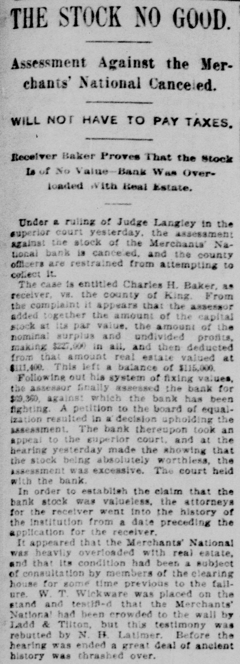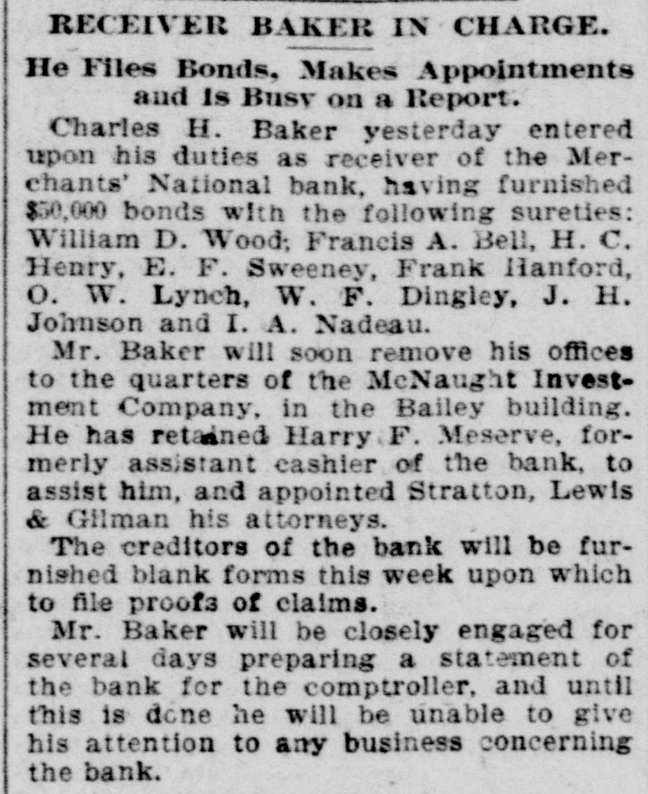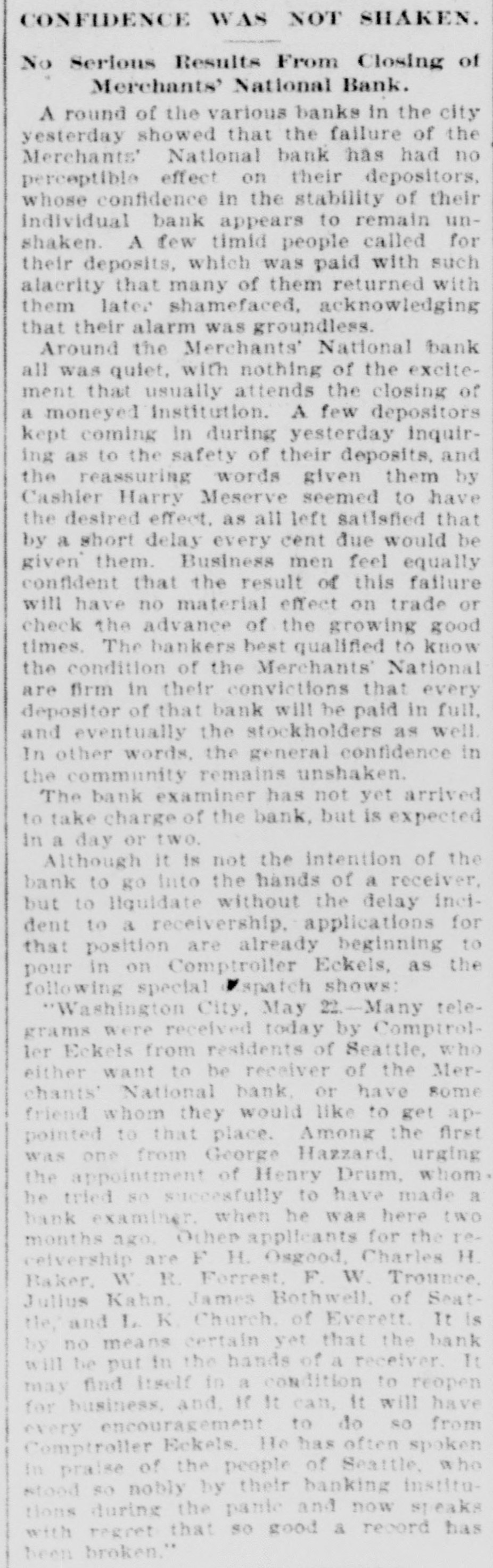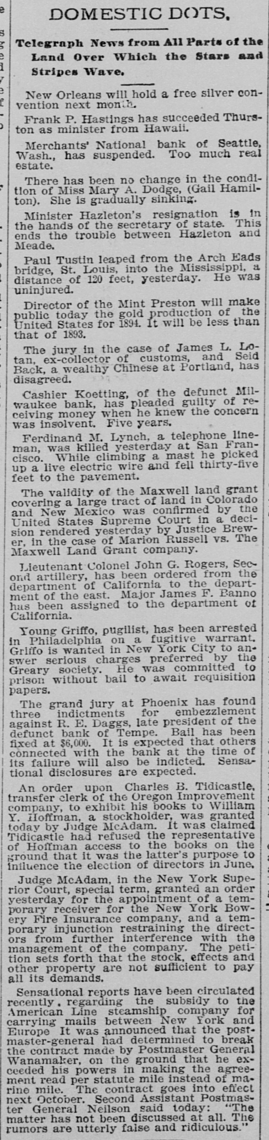 Totals. $684,134 93 $474,676 18 Of this amount in suspended banks the city will be able to realize approximately $40,000, as the Traders' and the Washington National will probably pay dollar for dollar in the long run, and the Merchants' National will probably pay from 40 to 50 per cent. In accounting for his balances, Mr. Boggs tendered the bank books of the suspended banks. This was on the ground that the city, having failed to name depositories, was responsible for the deposits as placed by the city treasurer. When the States Savings bank closed, the city at once began to take vigorous action, under the direction of Mayor Orr, to recover the $5,000 held there in the form of city warrants. By a recent decision of the superior court the city secured the warrants, and it was during the trial of this case that Mr. Boggs, on the witness stand, made the admissions upon which it was proposed to arrest him on a criminal charge. Chairman Cavender, of the financial committee, can speak on this point. He says: "If Boggs had only returned to the city the warrants which he had at the time he went out of office, we would have been willing to have accepted the same, and have reduced the accounts of the banks just that much, But I understand he was afraid to do so, on the ground that it was not legal to buy warrants out of their order, and that he feared certain citizens, who were taking an interest in the financial matter, might prosecute him on an alleged criminal offense. So he placed the warrants in bank as cash, $212,000 in all at that time, according to his report just before he went out, In other words, he reported $212,000 on hand, held as cash in warrants. That was just before he went out of office, and, when he turned over the office, there wasn't a warrant there. On the stand in the State Savings bank case he testified that he had deposited these warrants as cash, but there is no telling what the number of the warrants were, and if they were returned today I guess the city would be willing to credit the banks with them in reducing their account." Now as to the specific counts: "It appears that Boggs rendered himself liable in buying the warrants as he did, and I'm afraid he rendered himself liable by disposing of them as he did, At any rate, the test in this matter is to be made on a $7,000 note given by his clerk, Hill, and indorsed by himself, another note given by Bair & Loomis and an item for campaign purposes' of $5,000, all of which he deposited as cash for the city. The notes were not cash, of course, and the campaign fund item is not cash, of course." Mr. Boggs is charged by the finance committee with having control of the State Bavings bank and using it as & place to deposit worthless paper. For instance, it is cisimed the Bair-Loomis note came from the Bair-Loomis banking institution, and that that was the amount of city money reported on hand there at one time. Later, however, it is understood that the amount was lost in the townsite of Des Noines, and the amount in the form of a bote came into the possession of Mr. Boggs and was deposited as cash. One member of the committee says: "Boggs, no doubt, used the State SavIngs bank to cover up his shortages. The Hill note laid him open to a criminal action, The campaign fund item, of course, was placed in the bank to cover up ashort. age and in my opinion It was a very foolish way in which to cuver up a leak. When the city council tried to secure interest on the deposits in the banks, Baggs agreed to pay 5 per cent. interest, or rather secured an agreement of the banks to pay it. This amounted to $1,200 per month, and was paid in full for only a short time, when several of the banks failed