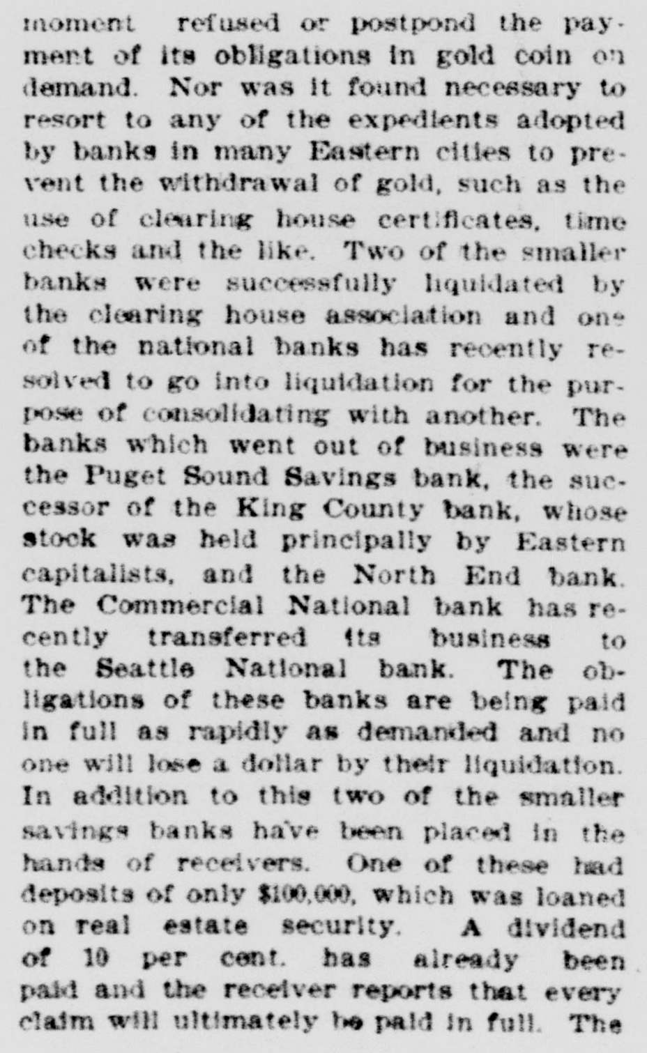 moment refused or postpond the pay. ment of its obligations In gold coin on demand. Nor was It found necessary to resort to any of the expedients adopted by banks in many Eastern cities to prevent the withdrawal of gold, such as the use of clearing house certificates, time checks and the like. Two of the smaller banks were successfully liquidated by the clearing house association and one of the national banks has recently resolved to go into liquidation for the purpose of consolidating with another. The banks which went out of business were the Puget Sound Savings bank, the successor of the King County bank, whose stock was held principally by Eastern capitalists, and the North End bank. The Commercial National bank has recently transferred 1ts business to the Seattle National bank. The obligations of these banks are being paid in full as rapidly as demanded and no one will lose a dollar by their liquidation. In addition to this two of the smaller savings banks have been placed in the hands of receivers. One of these had deposits of only $100,000, which was loaned on real estate security. A dividend of 10 per cent. has already been paid and the receiver reports that every claim will ultimately be paid in full. The
