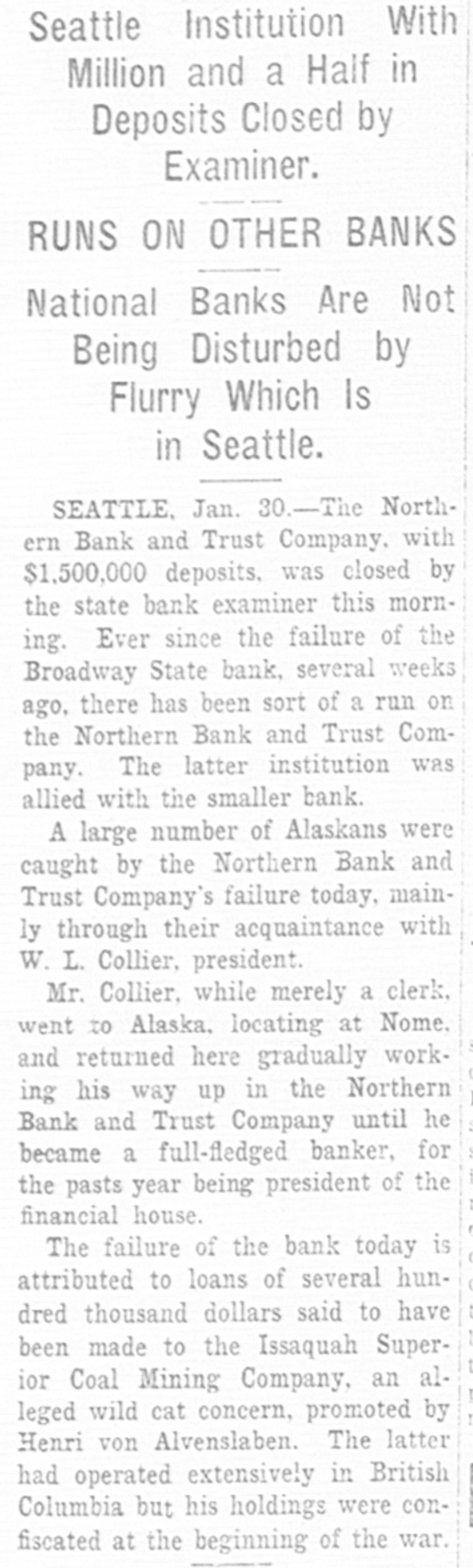 Seattle Institution With Million and a Half in Deposits Closed by Examiner. RUNS ON OTHER BANKS National Banks Are Not Being Disturbed by Flurry Which Is in Seattle. SEATTLE, Jan. 30.-The Northern Bank and Trust Company. with $1,500,000 deposits. was closed by the state bank examiner this morning. Ever since the failure of the Broadway State bank. several weeks ago, there has been sort of a run on the Northern Bank and Trust Company. The latter institution was allied with the smaller bank. A large number of Alaskans were caught by the Northern Bank and Trust Company's failure today, mainly through their acquaintance with W. L. Collier, president. Mr. Collier. while merely a clerk. went to Alaska, locating at Nome. and returned here gradually working his way up in the Northern Bank and Trust Company until he became a full-fledged banker. for the pasts year being president of the financial house. The failure of the bank today is attributed to loans of several hundred thousand dollars said to have been made to the Issaquah Superior Coal Mining Company, an alleged wild cat concern, promoted by Henri von Alvenslaben. The latter had operated extensively in British Columbia but his holdings were confiscated at the beginning of the war.