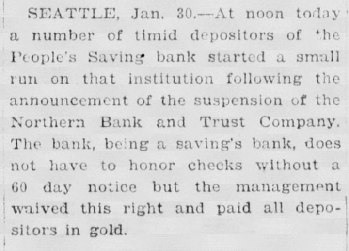 SEATTLE, Jan. 30.-At noon today a number of timid depositors of the People's Saving bank started a small run on that institution following the announcement of the suspension of the Northern Bank and Trust Company, The bank, being a saving's bank, does not have to honor checks without a 60 day notice but the management waived this right and paid all depositors in gold.