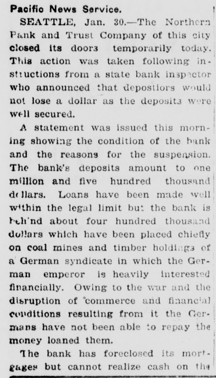 Pacific News Service. SEATTLE, Jan. 30.-The Northern Pank and Trust Company of this city closed its door3 temporarily today. This action was taken following in structions from a state bank inspector who announced that depostiors would not lose a dollar as the deposit. were well secured. A statement was issued this morning showing the condition of the bank and the reasons for the suspension. The bank's deposits amount to one million and five hundred thousand dollars. Loans have been made well within the legal limit but the bank is behind about four hundred thousand dollars which have been placed chiefly on coal mines and timber holdings of a German syndicate in which the German emperor is heavily interested financially. Owing to the war and the disruption of commerce and financial conditions resulting from it the Cermans have not been able to repay the money loaned them. The bank has foreclosed its mortgages but cannot realize cash on the