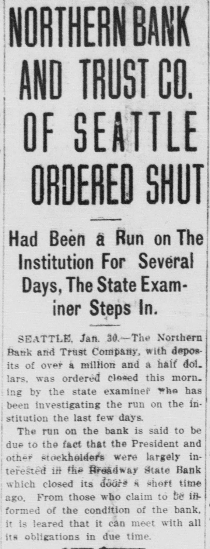 SEATTLE, Jan. 30.-The Northern Bank and Trust Company. with deposits of over a million and a half dollars. was ordered closed this morning by the state examiner who has been investigating the run on the institution the last few days. The run on the bank is said to be due to the fact that the President and other stockholders were largely interested in the Broadway State Bank which closed its doors a short time ago. From those who claim to be informed ci the condition of the bank, it is learned that it can meet with Ellies obligations in due time.