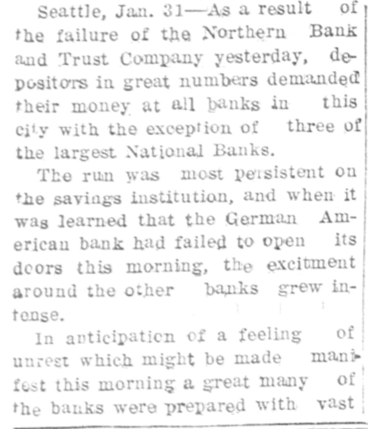 of Seattle, Jan. 31-As a result the failure of the Northern Bank and Trust Company yesterday, depositors in great numbers demanded their money at all banks in this city with the exception of three of the largest National Banks. The run was most persistent on the savings institution, and when it was learned that the German American bank had failed to open its doors this morning, the excitment around the other banks grew intense. In anticipation of a feeling of unrest which might be made manifest this morning a great many of the banks were prepared with vast