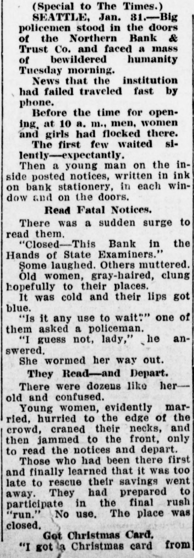 (Special to The Times.) SEATTLE, Jan. 31.-Big policemen stood in the doors of the Northern Bank & Trust Co. and faced a mass of bewildered humanity Tuesday morning. News that the institution had failed traveled fast by phone. Before the time for opening, at 10 a. m., men, women and girls had flocked there. The first few waited silently-expectantly. Then a young man on the inside posted notices, written in ink on bank stationery, in each window and on the doors. Read Fatal Notices. There was a sudden surge to read them. "Closed-This Bank in the Hands of State Examiners." Some laughed. Others muttered. Old women, gray-haired, clung hopefully to their places. It was cold and their lips got blue. "Is it any use to wait"" one of them asked a policeman. "I guess not, lady," he answered. She wormed her way out. They Read-and Depart. There were dozens like her-old and confused. Young women, evidently married, hurried to the edge of the crowd, craned their necks, and then jammed to the front, only to read the notices and depart. Those who had been there first and finally learned that it was too late to rescue their savings went away. They had prepared to participate in the final rush "run." No use. The place was closed. Got Christmas Card. "I got a Christmas card from