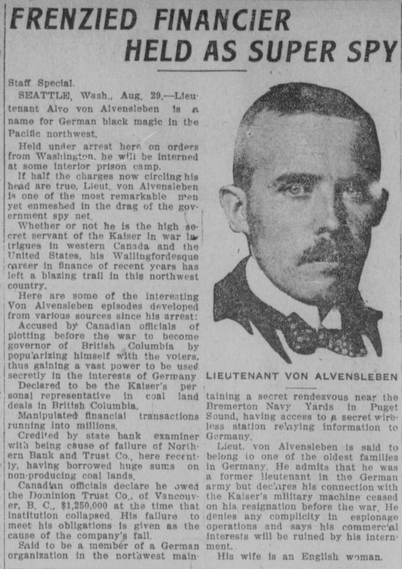 FRENZIED FINANCIER HELD AS SUPER SPY Staff Special SEATTLE, Wash., Aug. 29,-Lieutenant Alvo von Alvensleben is a name for German black magic in the Pacific northwest, Held under arrest here on orders from Washington, he will be interned at some interior prison camp. If half the charges now circling his head are true, Lieut, von Alvensleben is one of the most remarkable men yet enmeshed in the drag of the government spy net. Whether or not he is the high secret servant of the Kaiser in war in trigues in western Canada and the United States, his Wallingfordesque career in finance of recent years has left a blazing trail in this northwest country. Here are some of the interesting Von Alvensleben episodes developed from various sources since his arrest: Accused by Canadian officials of plotting before the war to become governor of British Columbia by popu'arizing himself with the voters, thus gaining a vast power to be used secretly in the interests of Germany LIEUTENANT VON ALVENSLEBEN Declared to be the Kaiser's per sonal representative in coal land taining a secret rendezvous near the deals in British Columbia, Bremerton Navy Yards in Puget Manipulated financial transactions Sound, having access to a secret wire. running into millions, less station relaying information to Credited by state bank examiner Germany, with being cause of failure of NorthLieut. von Alvensleben is said to ern Bank and Trust Co., here recent- belong to one of the oldest families ly, having borrowed huge sums on in Germany He admits that he was non-producing coal lands, a former lleutenant in the German Canadian officials declare he owed army but declares his connection with the Dominion Trust Co., of Vancouv- the Kaiser's military machine ceased er, B. C., $1,250,000 at the time that on his resignation before the war. He institution collapsed. His failure to denies any complicity in espionage meet his obligations is given as the operations and says his commercial cause of the company's fall. interests will be ruined by his internSaid to be a member of a German ment. organization in the northwest main- His wife is an English woman.