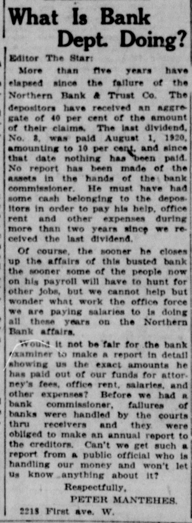 Of course, the sooner he closes up the affairs of this busted bank the sooner some of the people now on his payroll will have to hunt for other jobs, but we cannot help but wonder what work the office force we are paying salaries to is doing all these years on the Northern Bank affairs.
