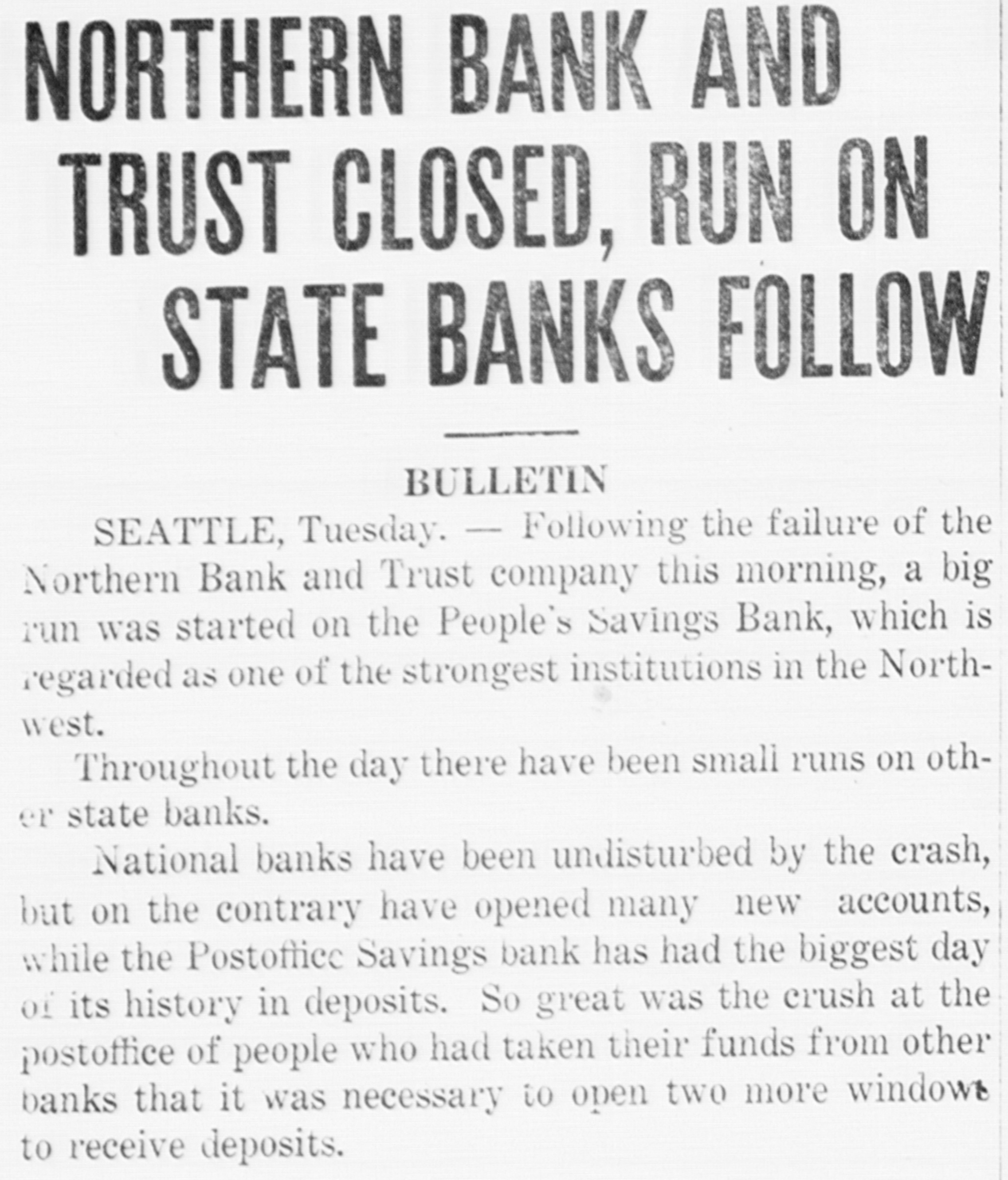NORTHERN BANK AND TRUST CLOSED, RUN ON STATE BANKS FOLLOW BULLETIN SEATTLE, Tuesday. - Following the failure of the Northern Bank and Trust company this morning, a big run was started on the People's Savings Bank, which is regarded as one of the strongest institutions in the Northwest. Throughout the day there have been small runs on other state banks. National banks have been undisturbed by the crash, but on the contrary have opened many new accounts, while the Postoffice Savings bank has had the biggest day of its history in deposits. So great was the crush at the postoffice of people who had taken their funds from other banks that it was necessary to open two more windows to receive deposits.