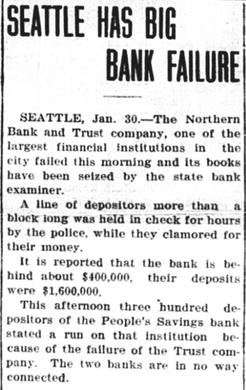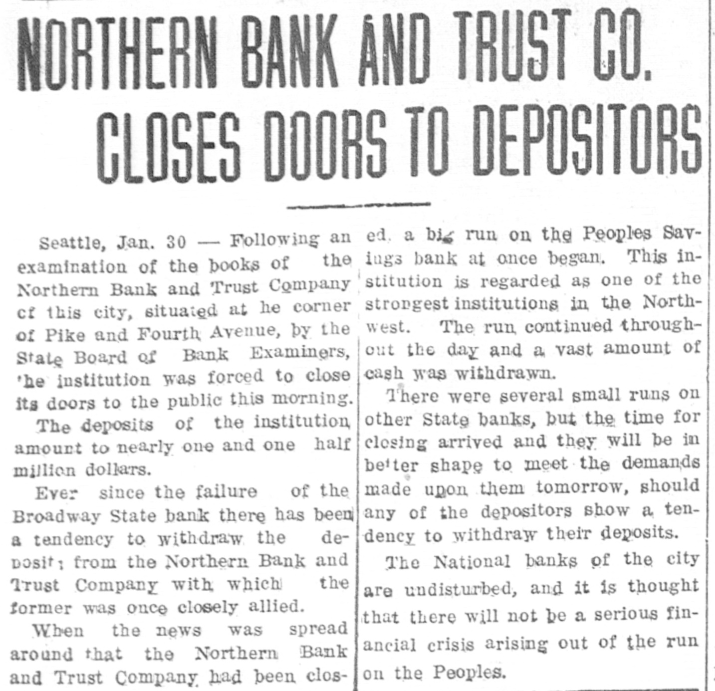 NORTHERN BANK AND TRUST CO. CLOSES DOORS TO DEPOSITORS Seattle, Jan. 30 - Following an ed. a big run on the Peoples Savexamination of the books of the ings bank at once began. This inNorthern Bank and Trust Company stitution is regarded as one of the of this city, situated at he corner strongest institutions in the Northof Pike and Fourth Avenue, by the west. The run continued throughState Board of Bank Examiners, out the day and a vast amount of cash was withdrawn. 'he institution was forced to close There were several small runs on its doors to the public this morning. other State banks, but the time for The deposits of the institution, closing arrived and they will be in amount to nearly one and one half better shape to meet the demands million dollars. of the made upon them tomorrow, should Ever since the failure any of the depositors show a tenBroadway State bank there has been dency to withdraw their deposits. a tendency to withdraw the deThe National banks of the city posit ; from the Northern Bank and Trust Company with which the are undisturbed, and it is thought former was once closely allied. that there will not be a serious finWhen the news was spread ancial crisis arising out of the run around that the Northern Bank on the Peoples. and Trust Company had been clos-
