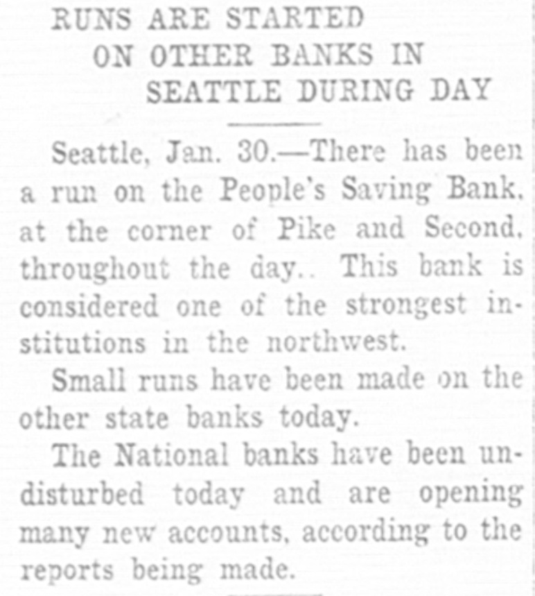 RUNS ARE STARTED ON OTHER BANKS IN SEATTLE DURING DAY Seattle, Jan. 30.-There has been a run on the People's Saving Bank. at the corner of Pike and Second. throughout the day This bank is considered one of the strongest institutions in the northwest. Small runs have been made on the other state banks today. The National banks have been undisturbed today and are opening many new accounts, according to the reports being made.