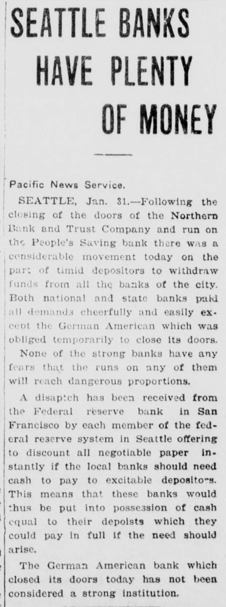 SEATTLE BANKS HAVE PLENTY OF MONEY Pacific News Service. SEATTLE, Jan. 31.-Following the closing of the doors of the Northern Bank and Trust Company and run on the People's Saving bank there was a considerable movement today on the part of timid depositors to withdraw funds from all the banks of the city. Both national and state banks paid all demanda cheerfully and easily except the German American which was obliged temporarily to close its doors. None of the strong banks have any fears that the runs on any of them will reach dangerous proportions. A disaptch has been received from the Federal reserve bank in San Francisco by each member of the federal reserve system in Seattle offering to discount all negotiable paper instantly if the local banks should need cash to pay to excitable depositors. This means that these banks would thus be put into possession of cash equal to their depoists which they could pay in full If the need should arise. The German American bank which closed its doors today has not been considered a strong institution.