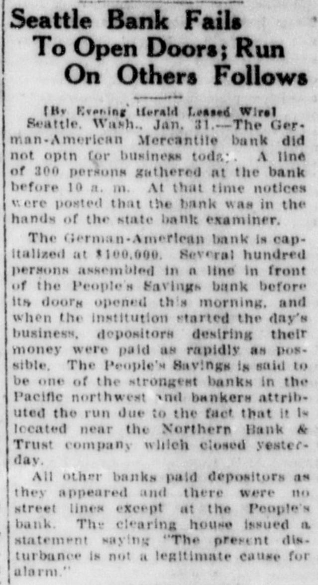 German-American Places Itself in Hands of State Examiner When Crowd of Depositors Appears. SUPPORT PROMISED. San Francisco, Jan. 31.-The federal reserve bank here telegraphed all Seattle banks today that it was prepared to support them. Seattle, Jan. 31.-The German-American Mercantile bank did not open for business today. The bank's officers had stated earlier in the day that the bank would open. A line of 300 persons gathered at the bank before 10 o'clock and at that time notices were posted that the bank was in the hands of the state bank examiner. The clearing house association, prior to. 10 o'clock issued a statement saying it "stands willing and able to assist all solvent banks of the city if occasion should arise." The banks of the city have resources totaling over $130,000,000. The association also said it knows the present disturbance is not a legitimate cause for alarm. The German-American Mercantile bank is capitalized at $100,000. No recent statement of its affairs has been published. The bank is not a member of the clearing house. RUN ON BIG BANK. Half an hour before the People's Savings bank opened 500 persons stretched in a long double line from the bank doors. Every effort was made by the bank, which is one of the strongest in the Pacific northwest to expedite payments. The run was regarded as due to the bank's location near the Northern bank. which failed yesterday. The lobbies of the ScandinavianAmerican bank and the Northwest Trust and Safe Deposit company were filled, but there was no crowd in the street. Both paid depositors without asking questions. The American Savings Bank and Trust company, which had more than the usual crowd in the lobby, demanded 60 days' notice of withdrawals of savings deposits.