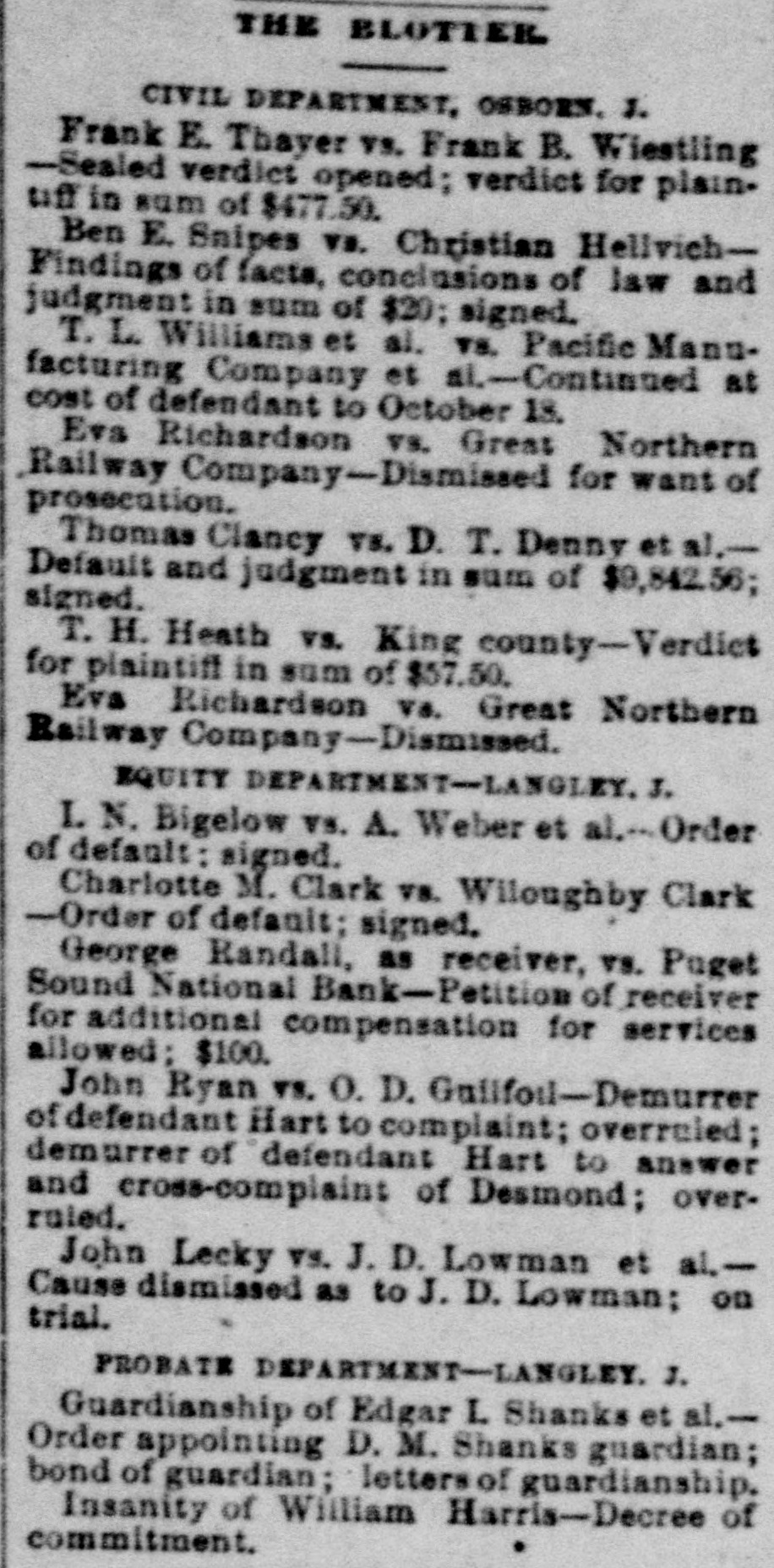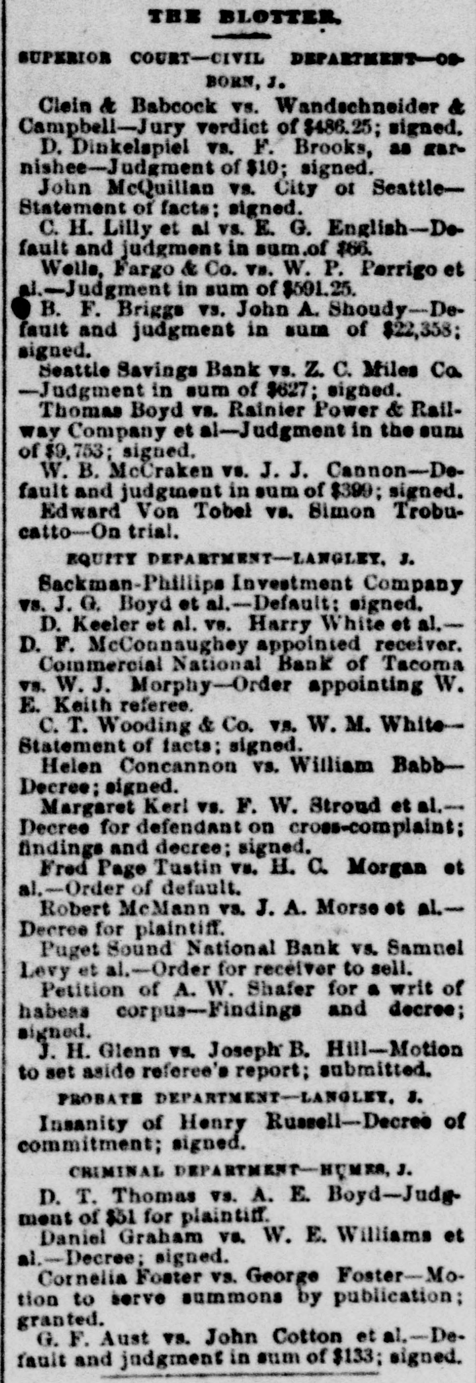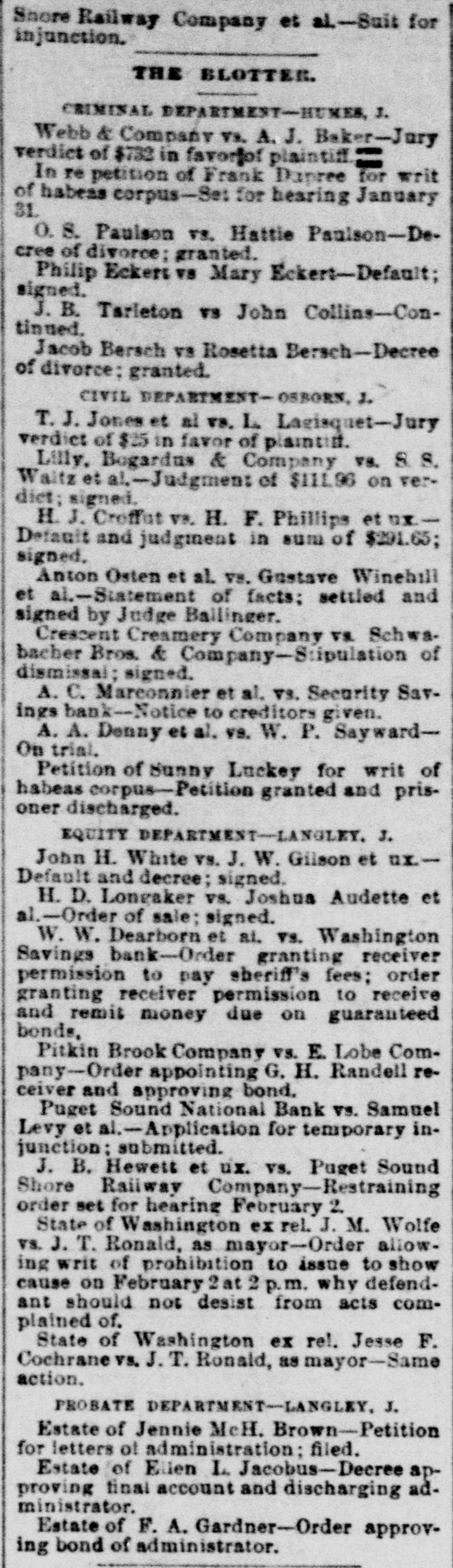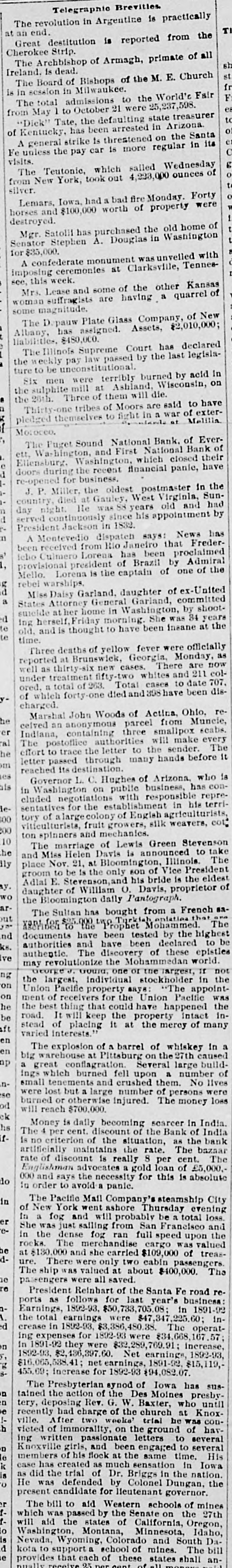 Telegraphic Brevities. The revolution in Argentine is practically 'pus UE 111 Great destitution is reported from the Cherokee Strip. The Archbishop of Armagh, primate of all Ireland. is dead. The Board of Bishops of the M. E. Church up up 81 The total admissions to the World's Fair from May 1 to October 21 were 25,237,598. "Dick" Tate, the defaulting state treasurer of Kentucky, has been arrested in Arizona. A general strike is threstened on the Santa Fe unless the pay car is more regular in its visits. The Teutonic, which salled Wednesday from New York, took out 4,233,000 ounces of silver. Lemars, Iowa, had a bad fire Monday. Forty horses and $100,000 worth of property destroyed. Mgr. Satolli has purchased the old home of Senator Stephen A. Douglas in Washington 000'98$ 401 A confederate monument was unvelled with imposing ceremonies at Clarksville, Tennes see, this week. Mrs. Lease and some of the other Kansas burner " Sujanq DIU amos The Depauw Plate Glass Company, of Albany, has assigned. Assets, $2,010,000 liabilities. $480,000. The Illinois Supreme Court has declared the weekly pay law passed by the last legisla eq 01 aim Six men were terribly burned by acid the sulphite mill at Ashland, Wisconsin, the 20th. Three of them will die. Thirty-one tribes of Moors are said to Melills 10 JO JUM U up or paspoid Motocco. The Puget Sound National Bank. of ett, Washington, and First National Bank Ellensburg. Washington, which closed thei doors during the recent financial panie, re-opened for business. J. P. Miller, the oldest postmaster in country, died at Gauley, West Virginla, puv PIO 88 WHAT PH 7q3pu Aup served continuously since his appointment 7881 us A Montevedio dispated says: News been received from Rio Janeiro that Frede icho Culmero Lorena has been proclaime provisional president of Brazil by Admir Mello. Lorena is the captain of one of require Miss Daisy Garland, daughter of ex-Unite States Attorney General Garland, committe suicide ather home in Washington, by Ing herself, Friday morning. She was 34 old, and is thought to have been insane at time. Three deaths of yellow fever were official reported at Brunswick, Georgia, Monday, well as thirty-six new cases. There are under treatment fifty-two whites and 211 ored. a total of 263. Total cases to date of which forty-one died and 398 have been charged. Marshal John Woods of Actina, Ohio. . celved an anonymous parcel from Munci J Indiana, containing three smallpox I The postoflice authorities will make as effort to trace the letter to the sender. letter passed through many hands before reached its destination. 8 Governor L. C. Hughes of Arizona, who S in Washington on public business, has cluded negotiations with responsible sentatives for the establishment in his 0 tory of alarge colony of English agriculturist 0 viticulturists, fruit growers, silk weavers, ton spinners and mechanics. ( The marriage of Lewis Green Stevens a and Miss Helen Davis is announced to A place Nov. 21, at Bloomington, Illinois. groom to be is the only son of Vice Preside Adiai E. Stevenson, and his bride is the daughter of William O. Davis, proprietor o the Bloomington daily Pantograph. The Sultan has bought from a French 1 1941 replated OMT 000 98$ aoj TUCA 991 01 I documents have been tested by the * authorities and have been declared to authentic. The discovery of these e may revolutionize the Mohammedan world. : 11 am TO auo 'pmon 'e arean 1 the largest, individual stockholder in 1 Union Pacific property says: "The appoin ment of receivers for the Union Pacific : the best thing that could have happened road. It will keep the property Intact stead of placing it at the mercy of varied interests." big The warehouse explosion of a barrel of whiskey In