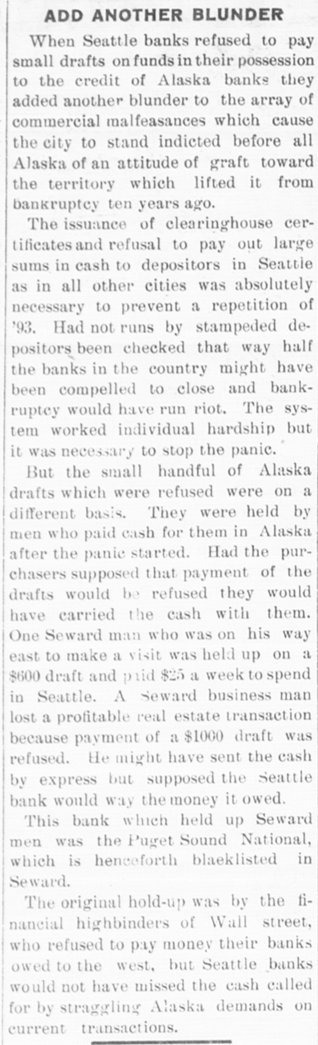 ADD ANOTHER BLUNDER When Seattle banks refused to pay small drafts on funds in their possession to the credit of Alaska banks they added another blunder to the array of commercial malfeasances which cause the city to stand indicted before all Alaska of an attitude of graft toward the territory which lifted it from bankruptcy ten years ago. The issuance of clearinghouse certificates and refusal to pay out large sums in cash to depositors in Seattle as in all other cities was absolutely necessary to prevent a repetition of '93. Had not runs by stampeded depositors been checked that way half the banks in the country might have been compelled to close and bankruptcy would have run riot. The system worked individual hardship but it was necessary to stop the panic. But the small handful of Alaska drafts which were refused were on a different basis. They were held by men who paid cash for them in Alaska after the panic started. Had the purchasers supposed that payment of the drafts would be refused they would have carried the cash with them. One Seward man who was on his way east to make a visit was held up on a $600 draft and paid $25 a week to spend in Seattle. A Seward business man lost a profitable real estate transaction because payment of a $1000 draft was refused. He might have sent the cash by express but supposed the Seattle bank would way the money it owed. This bank which held up Seward men was the Puget Sound National, which is henceforth blaeklisted in Seward. The original hold-up was by the financial highbinders of Wall street, who refused to pay money their banks owed to the west, but Seattle banks would not have missed the cash called for by straggling Alaska demands on current transactions.
