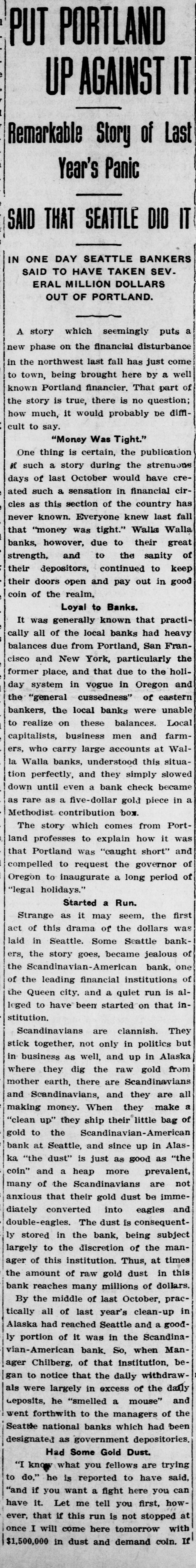 PUT PORTLAND UP AGAINST Remarkable Story of Last Year's Panic IT SAID THAT SEATTLE DID IN ONE DAY SEATTLE BANKERS SAID TO HAVE TAKEN SEVERAL MILLION DOLLARS OUT OF PORTLAND. A story which seemingly puts a new phase on the financial disturbance in the northwest last fall has just come to town, being brought here by a well known Portland financier. That part of the story is true, there is no question; how much, it would probably be difficult to say. "Money Was Tight." One thing is certain, the publication of such a story during the strenuous days of last October would have created such a sensation in financial circles as this section of the country has never known. Everyone knew last fall that "money was tight." Walla Walla banks, howover, due to their great of strength, and to the sanity their depositors, continued to keep their doors open and pay out in good coin of the realm. Loyal to Banks. It was generally known that practically all of the local banks had heavy balances due from Portland, San Franthe cisco and New York, particularly former place, and that due to the holiday system in vogue in Oregon and the "general cussedness" of eastern bankers, the local banks were unable to realize on these balances. Local capitalists, business men and farmers, who carry large accounts at Walla Walla banks, understood this situation perfectly, and they simply slowed down until even a bank check became a as rare as a five-dollar gold piece in Methodist contribution box. The story which comes from Portland professes to explain how it was that Portland was "caught short" and compelled to request the governor of Oregon to inaugurate a long period of "legal holidays." Started a Run. Strange as it may seem, the first act of this drama of the dollars was laid in Seattle. Some Seattle bankers, the story goes, became jealous of the Scandinavian-American bank, one of the leading financial institutions of the Queen city, and a quiet run is alleged to have been started on that institution. Scandinavians are clannish. They stick together, not only in politics but in business as well, and up in Alaska where they dig the raw gold from mother earth, there are Scandinavians all and Scandinavians, and they are making money. When they make a "clean up" they ship their little bag of gold to the Scandinavian-American bank at Seattle, and since up in Alaska "the dust" is just as good as "the coin" and a heap more prevalent, many of the Scandinavians are not anxious that their gold dust be immediately converted into eagles and double-eagles. The dust is consequently stored in the bank, being subject largely to the discretion of the manager of this institution. Thus, at times the amount of raw gold dust in this bank reaches many millions of dollars. By the middle of last October, practically all of last year's clean-up in Alaska had reached Seattle and a goodly portion of it was in the Scandinavian-American bank. So, when Manager Chilberg, of that institution, began to notice that the daily withdrawals were largely in excess of the daily and deposits, he "smelled a mouse" went forthwith to the managers of the Seattle national banks which had been designated as government depositories. Had Some Gold Dust. "I know what you fellows are trying to do," he is reported to have said, "and if you want a fight here you can it. Let me tell you have first, stopped how- at ever, that if this run is not once I will come here tomorrow with $1,500,000 in dust and demand coin. If
