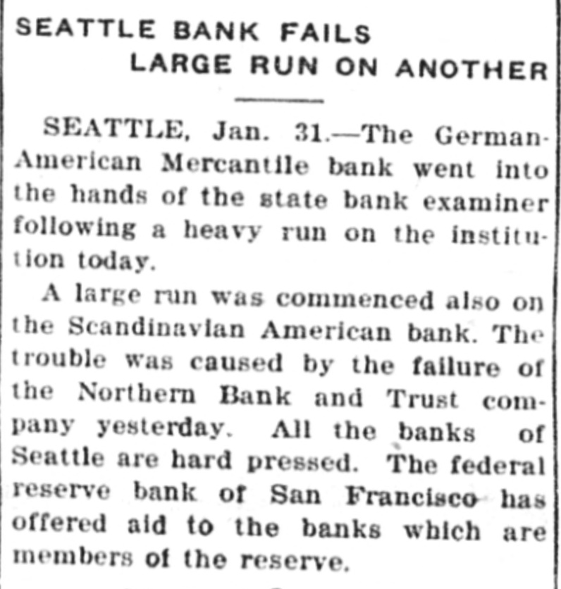Run began after failure/closure of Northern Bank & Trust Company and general runs on other Seattle banks; depositor nervousness spread from nearby bank failures.