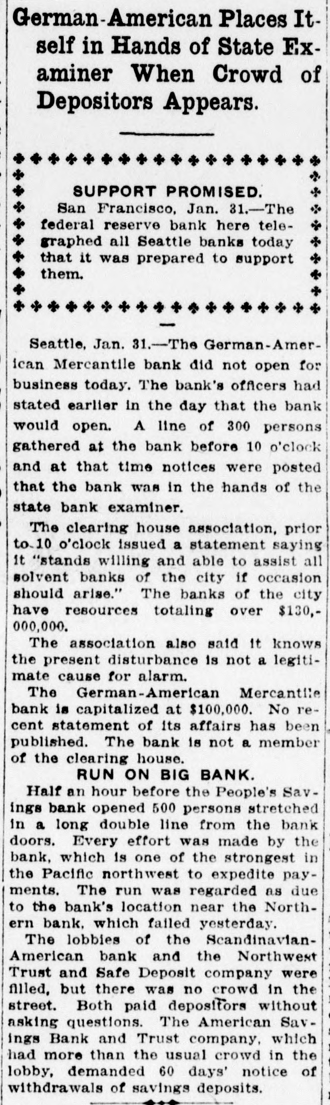 German-American Places Itself in Hands of State Examiner When Crowd of Depositors Appears. SUPPORT PROMISED. San Francisco, Jan. 31.-The federal reserve bank here telegraphed all Seattle banks today that it was prepared to support them. Seattle, Jan. 31.-The German-American Mercantile bank did not open for business today. The bank's officers had stated earlier in the day that the bank would open. A line of 300 persons gathered at the bank before 10 o'clock and at that time notices were posted that the bank was in the hands of the state bank examiner. The clearing house association, prior to. 10 o'clock issued a statement saying it "stands willing and able to assist all solvent banks of the city if occasion should arise." The banks of the city have resources totaling over $130,000,000. The association also said it knows the present disturbance is not a legitimate cause for alarm. The German-American Mercantile bank is capitalized at $100,000. No recent statement of its affairs has been published. The bank is not a member of the clearing house. RUN ON BIG BANK. Half an hour before the People's Savings bank opened 500 persons stretched in a long double line from the bank doors. Every effort was made by the bank, which is one of the strongest in the Pacific northwest to expedite payments. The run was regarded as due to the bank's location near the Northern bank. which failed yesterday. The lobbies of the ScandinavianAmerican bank and the Northwest Trust and Safe Deposit company were filled, but there was no crowd in the street. Both paid depositors without asking questions. The American Savings Bank and Trust company, which had more than the usual crowd in the lobby, demanded 60 days' notice of withdrawals of savings deposits.