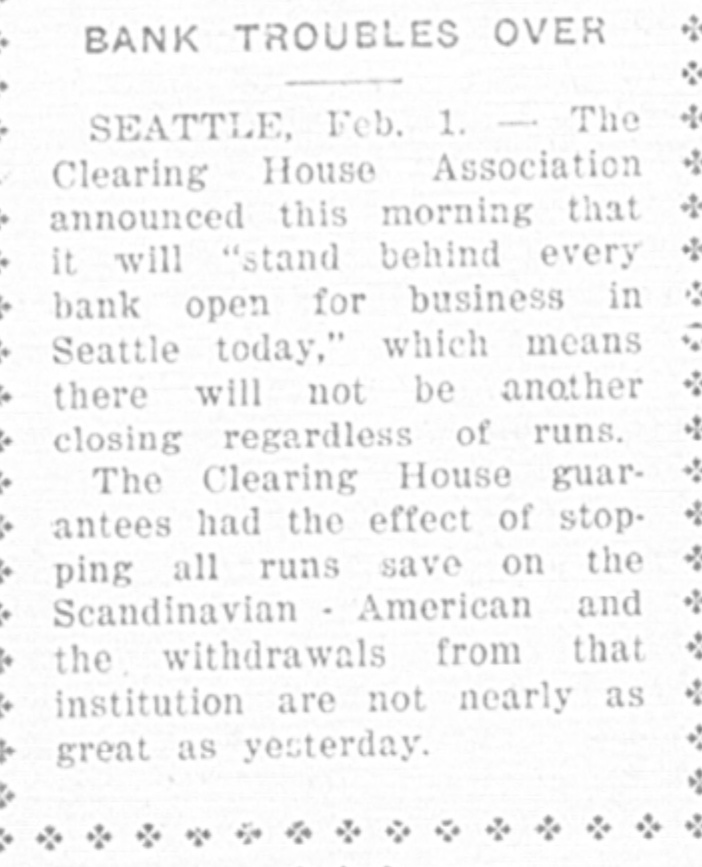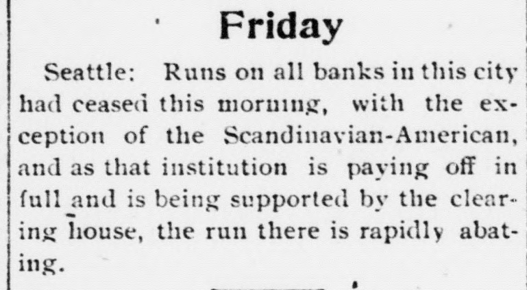 Friday Seattle: Runs on all banks in this city had ceased this morning, with the exception of the Scandinavian-American, and as that institution is paying off in full and is being supported by the clearing house, the run there is rapidly abating.