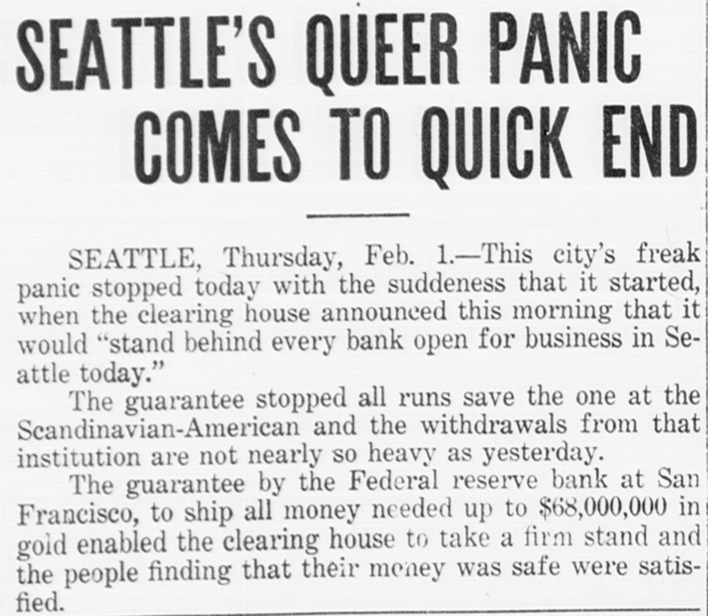 SEATTLE'S QUEER PANIC COMES TO QUICK END SEATTLE, Thursday, Feb. 1.-This city's freak panic stopped today with the suddeness that it started, when the clearing house announced this morning that it would "stand behind every bank open for business in Seattle today." The guarantee stopped all runs save the one at the Scandinavian-American and the withdrawals from that institution are not nearly so heavy as yesterday. The guarantee by the Federal reserve bank at San Francisco, to ship all money needed up to $68,000,000 in gold enabled the clearing house to take a firm stand and the people finding that their money was safe were satisfied.