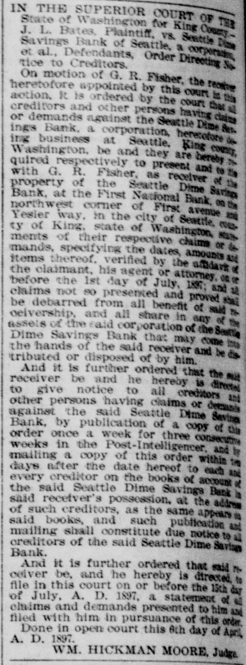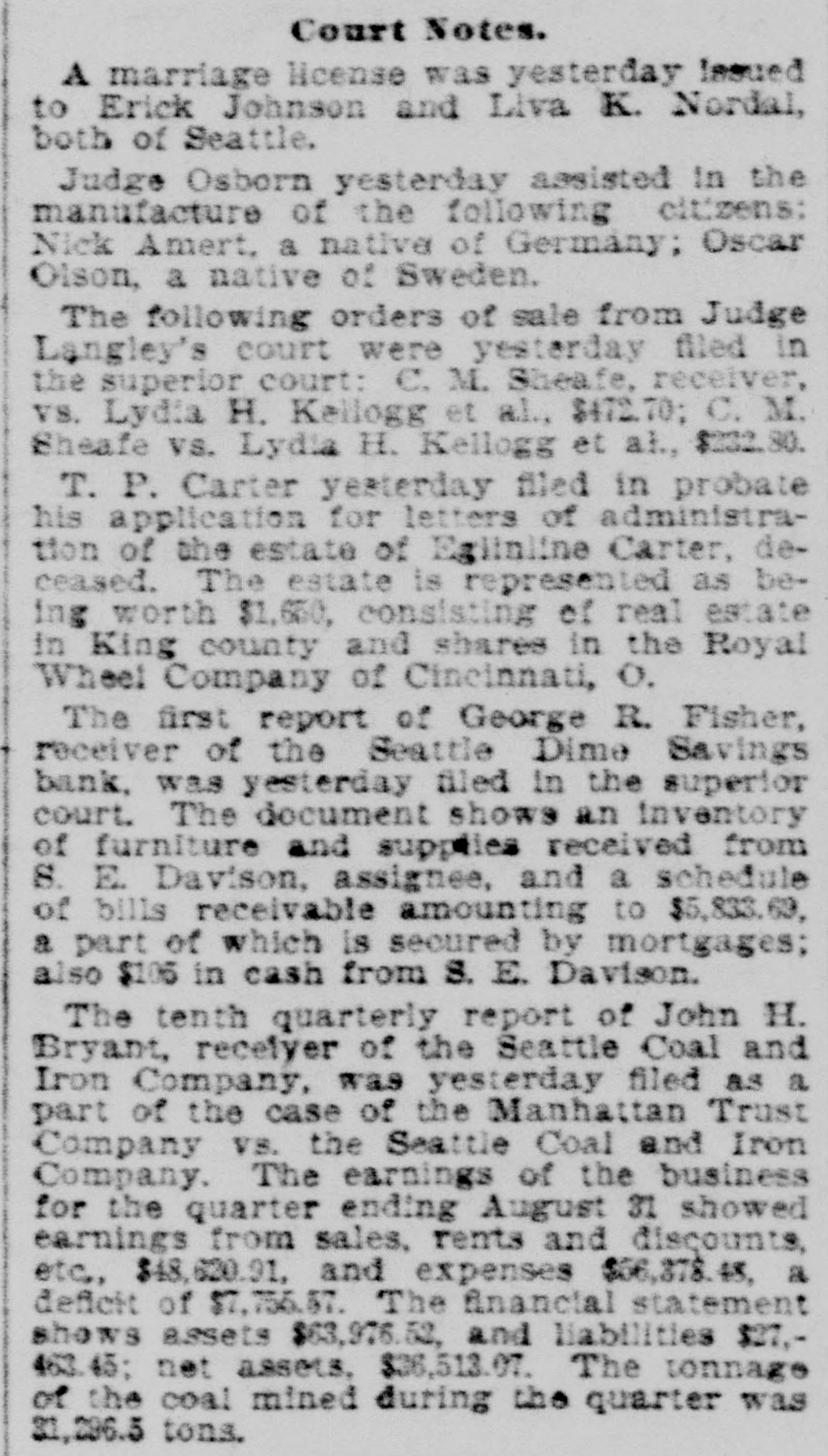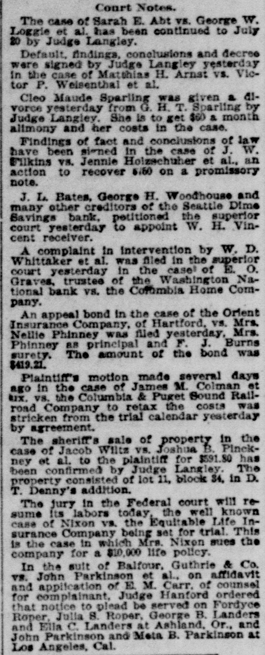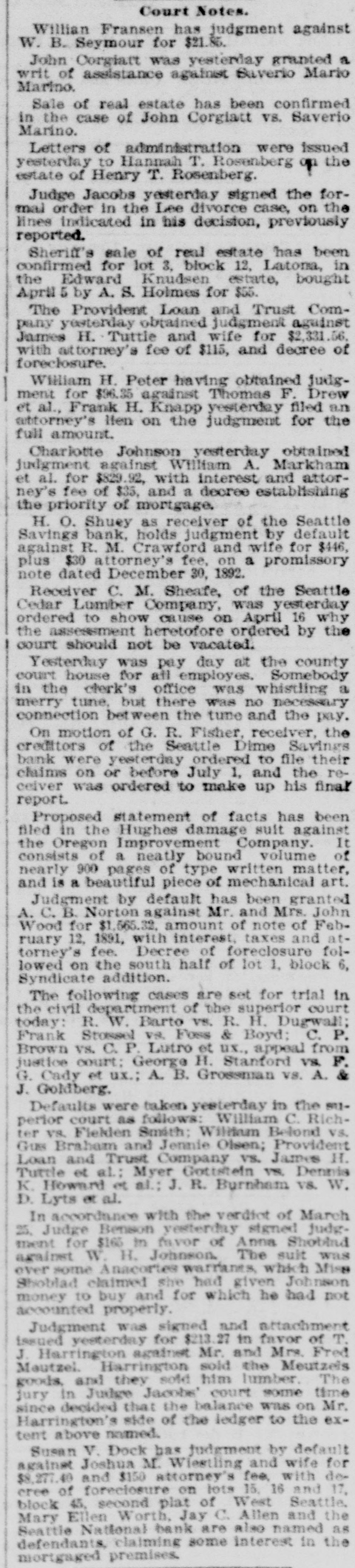 Court Notes. Willian Fransen has judgment against W. B. Seymour for $21.85. John Corgiatt was yesterday granted a writ of assistance against Suverio Mario Marino. Sale of real estate has been confirmed in the case of John Corgiatt vs. Saverio Marino. Letters of administration were issued yesterday to Hannah T. Rosenberg on the estate of Henry T. Rosenberg. Judge Jacobs yesterday signed the formai order in the Lee divorce case, on the lines indicated in his decision, previously reported. Sheriff's sale of real estate has been confirmed for lot 3, block 12, Latona, in the Edward Knudsen estate, bought April 5 by A. S. Holmes for $55. The Provident Loan and Trust Company yesterday obtained judgment against James H. Tuttle and wife for $2,331.56. with attorney's fee of $115, and decree of foreclosure. William H. Peter having obtained judgment for $96.35 against Thomas F. Drew et al., Frank H. Knapp yesterday filed an attorney's Hen on the judgment for the full amount. Charlotte Johnson yesterday obtained judgment against William A. Markham et al. for $829.92, with interest and attorney's fee of $35, and a decree establishing the priority of mortgage. H. O. Shuey as receiver of the Seattle Savings bank, holds judgment by default against R. M. Crawford and wife for $446, plus $30 attorney's fee, on a promissory note dated December 30, 1892. Receiver C. M. Sheafe, of the Seattle Cedar Lumber Company, was yesterday ordered to show cause on April 16 why the assessment heretofore ordered by the court should not be vacated. Yesterday was pay day at the county court house for all employes. Somebody in the clerk's office was whistling a merry tune, but there was no necessary connection between the tune and the pay. On motion of G. R. Fisher, receiver, the creditors of the Seattle Dime Savings bank were yesterday ordered to file their claims on or before July 1, and the receiver was ordered to make up his final report. Proposed statement of facts has been filed in the Hughes damage suit against the Oregon Improvement Company. It consists of a neatly bound volume of nearly 900 pages of type written matter, and is a beautiful piece of mechanical art. Judgment by default has been granted A. C. B. Norton against Mr. and Mrs. John Wood for $1,565.32. amount of note of February 12, 1891, with interest, taxes and attorney's fee. Decree of foreclosure followed on the south half of lot 1, block 6, Syndicate addition. The following cases are set for trial in the civil department of the superior court today: R. W. Barto VS. R. H. Dugwall; Frank Stossel VS. Foss & Boyd; C. P. Brown VS. C. P. Lutro et ux., appeal from justice court: George H. Stanford VS. F. G. Cady et ux.; A. B. Grossman vs. A. & J. Goldberg. Defaults were taken yesterday in the superior court as follows: William C. Richter VS. Fielden Smith: William Belond vs. Gus Braham and Jennie Olsen; Provident Loan and Trust Company vs. James H. Tuttle et al: Myer Gottstein VS. Dennis K. Howard et al.; J. R. Burnham vs. W. D. Lyts et al. In accordance with the verdiot of March 25, Judge Benson yesterday signed judgment for $165 in favor of Anna Shobled against W. H. Johnson. The suit was over some Anacortes warriants, which Miss Shoblad claimed she had given Johnson money to buy and for which he had not accounted properly. Judgment was signed and attachment issued yesterday for $213.27 in favor of T. J. Harrington against Mr. and Mrs. Fred Meutzel. Harrington sold the Meutzels goods, and they sold him lumber. The jury in Judge Jacobe' court some time since decided that the balance was on Mr. Harrington's side of the ledger to the extent above named. Susan V. Dock has judgment by default against Joshua M. Wiestling and wife for $8,277.40 and $150 attorney's fee, with decree of foreclosure on lots 15. 16 and 17, block 45, second plat of West Seattle, Mary Ellen Worth, Jay C. Allen and the Seattle National bank are also named as defendants, claiming some interest in the mortgaged premises.