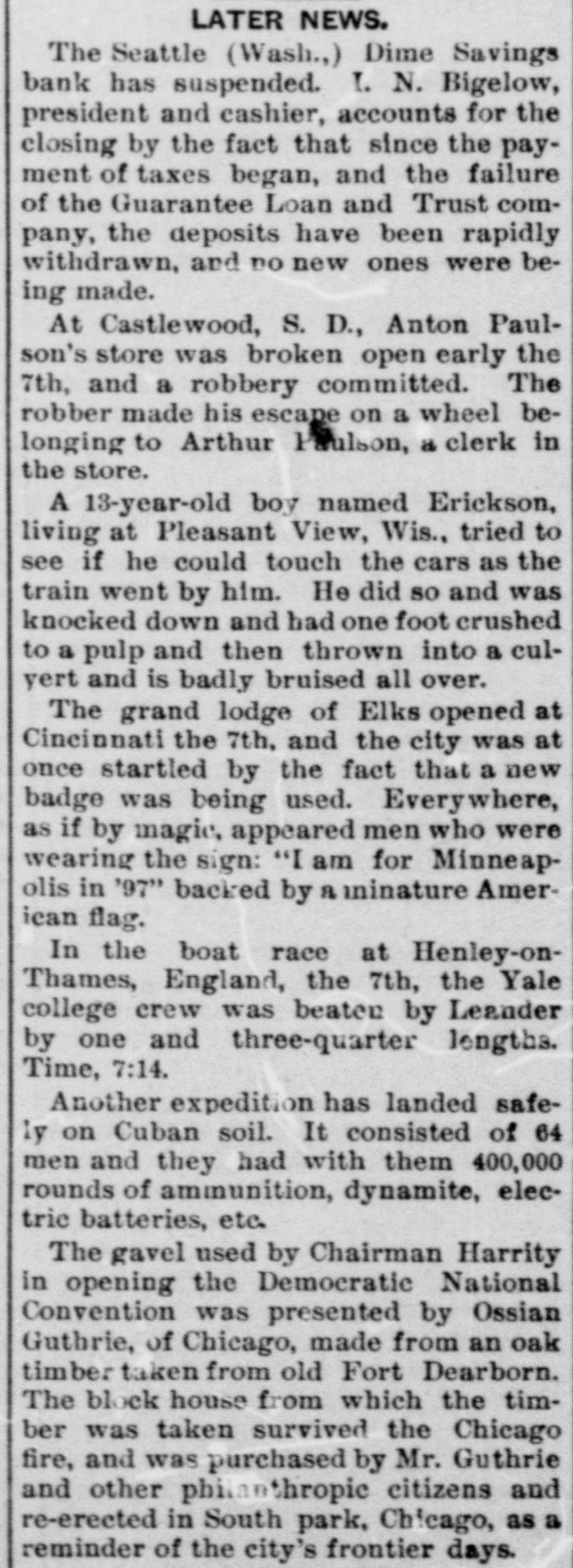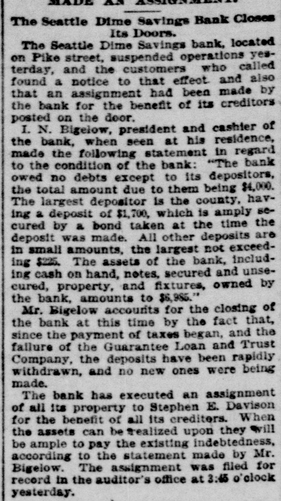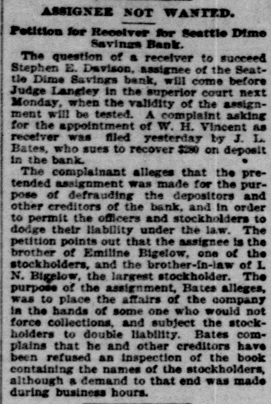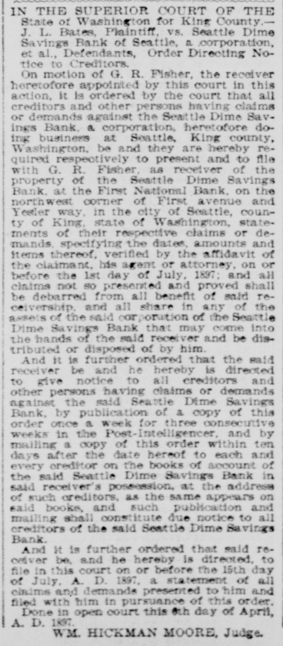 Court Notes. Willian Fransen has judgment against W. B. Seymour for $21.85. John Corgiatt was yesterday granted a writ of assistance against Suverio Mario Marino. Sale of real estate has been confirmed in the case of John Corgiatt vs. Saverio Marino. Letters of administration were issued yesterday to Hannah T. Rosenberg on the estate of Henry T. Rosenberg. Judge Jacobs yesterday signed the formai order in the Lee divorce case, on the lines indicated in his decision, previously reported. Sheriff's sale of real estate has been confirmed for lot 3, block 12, Latona, in the Edward Knudsen estate, bought April 5 by A. S. Holmes for $55. The Provident Loan and Trust Company yesterday obtained judgment against James H. Tuttle and wife for $2,331.56. with attorney's fee of $115, and decree of foreclosure. William H. Peter having obtained judgment for $96.35 against Thomas F. Drew et al., Frank H. Knapp yesterday filed an attorney's Hen on the judgment for the full amount. Charlotte Johnson yesterday obtained judgment against William A. Markham et al. for $829.92, with interest and attorney's fee of $35, and a decree establishing the priority of mortgage. H. O. Shuey as receiver of the Seattle Savings bank, holds judgment by default against R. M. Crawford and wife for $446, plus $30 attorney's fee, on a promissory note dated December 30, 1892. Receiver C. M. Sheafe, of the Seattle Cedar Lumber Company, was yesterday ordered to show cause on April 16 why the assessment heretofore ordered by the court should not be vacated. Yesterday was pay day at the county court house for all employes. Somebody in the clerk's office was whistling a merry tune, but there was no necessary connection between the tune and the pay. On motion of G. R. Fisher, receiver, the creditors of the Seattle Dime Savings bank were yesterday ordered to file their claims on or before July 1, and the receiver was ordered to make up his final report. Proposed statement of facts has been filed in the Hughes damage suit against the Oregon Improvement Company. It consists of a neatly bound volume of nearly 900 pages of type written matter, and is a beautiful piece of mechanical art. Judgment by default has been granted A. C. B. Norton against Mr. and Mrs. John Wood for $1,565.32. amount of note of February 12, 1891, with interest, taxes and attorney's fee. Decree of foreclosure followed on the south half of lot 1, block 6, Syndicate addition. The following cases are set for trial in the civil department of the superior court today: R. W. Barto VS. R. H. Dugwall; Frank Stossel VS. Foss & Boyd; C. P. Brown VS. C. P. Lutro et ux., appeal from justice court: George H. Stanford VS. F. G. Cady et ux.; A. B. Grossman vs. A. & J. Goldberg. Defaults were taken yesterday in the superior court as follows: William C. Richter VS. Fielden Smith: William Belond vs. Gus Braham and Jennie Olsen; Provident Loan and Trust Company vs. James H. Tuttle et al: Myer Gottstein VS. Dennis K. Howard et al.; J. R. Burnham vs. W. D. Lyts et al. In accordance with the verdiot of March 25, Judge Benson yesterday signed judgment for $165 in favor of Anna Shobled against W. H. Johnson. The suit was over some Anacortes warriants, which Miss Shoblad claimed she had given Johnson money to buy and for which he had not accounted properly. Judgment was signed and attachment issued yesterday for $213.27 in favor of T. J. Harrington against Mr. and Mrs. Fred Meutzel. Harrington sold the Meutzels goods, and they sold him lumber. The jury in Judge Jacobe' court some time since decided that the balance was on Mr. Harrington's side of the ledger to the extent above named. Susan V. Dock has judgment by default against Joshua M. Wiestling and wife for $8,277.40 and $150 attorney's fee, with decree of foreclosure on lots 15. 16 and 17, block 45, second plat of West Seattle, Mary Ellen Worth, Jay C. Allen and the Seattle National bank are also named as defendants, claiming some interest in the mortgaged premises.