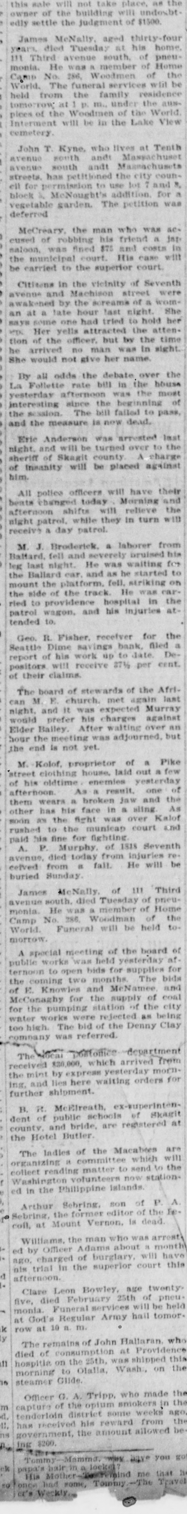 this sale will not take place. as the owner of the building will undesbt edly settle the judgment of $1500. James McNally, aged thirty-four years. died Tuesday at his home 111 Third avenue south. of pneumonta. He was member of Home Camp No. 286, Woodmen of the World. The funeral services wit be held from the family residence tomorrow at v. m., under the auspiece of the Woodmen of the World Interment will be in the Lake View cometery John T. Kyne, who lives at Tenth avenue south andt Massachuset avenue south andt Masrachusets streets. has petitioned the city counell for permission to use lot 7 and block a McNought's addition. for a vegetable garden. The petition was deferred McCreary. the man who was se. cused of robbing his friend a jap natoon, was fined $75 and costs in the municipal court. His case will be carried to the superior court Citizens in the vicinity of Seventh avenue and Machison street were awakened by the acreams of a woman at a late hour last night. She says some one had tried to hold her e Her vells attracted the attention of the officer. but by the time he arrived no man was In sight. She would not give her name. By all adds the debate over the La Follette rate bill in the house yesterday afternoon was the most of interesting since the beginning the session. The bill falled to pass, and the measure is now dead. Eric Anderson was arrested last night. and will be turned over to the sheriff of Skagit county A charge of trimanity will be placed against him. All police officers will have their beats changed today Morning and afternoon shifts will relieve the night patrol, while they in turn will receive a day patrol. M J. Broderick. a laborer from Ballard. fell and severely bruised h leg last night. He was waiting for the Ballard car and as he started to mount the platform. fell. striking on the side of the track He was carried to providence hospital in the patrol wagon. and his injuries attended to. Geo. R. Fisher. receiver for the Seattle Dime savings bank. filed a report of his work up to date Depositors will receive 27% per cent. of their claims. The board of stewards of the African M E church. met again last night. and it was expected Murray would prefer his charges against Elder Balley. After waiting over an hour the meeting was adjourned. but the end is not yet. M. Kolof. proprietor of a Pike "street clothing house. laid out a few of his oldtime enemies yesterday afternoon. As a result. one of them wears a broken jaw and the As other has his face in a aling soon 208 the fight was over Kalof rushed to the municap court and paid his fine for fighting A. P. Murphy. of 1818 Seventh avenue, died today from injuries recelved from a fall. He will be buried Sunday James McNally, of 111 Third avenue south. died Tuesday of pneumonia. He was a member of Home Camp No. 286. Woodman of the World. Funeral will be held tomorrow. A special meeting of the board of public works was held yesterday at ternoon to open bids for supplies for the coming two months The bids of E. Knowles and McNamee and McConagby for the supply of coal for the pumping station of the city water works were rejected as being oo high. The bid of the Denny Clay company was referred. The Vocai Dontoffice department received $20,000, which arrived from the mint by express yesterday morning. and lies here waiting orders for further shipment. B. R. McEtreath, ex-auperintendent of public schools of Skagit county. and bride, are registered at the Hotel Butler. The Indies of the Macabees are organizing a committee which will collect reading matter to send to the Washington volunteers now station ed in the Philippine Islands. Arthur Schring, son of P.A. - Sebrina, the former editor of the Fe coll, at Mount Vernon, is dead. Williams, the man who was arrest by Officer Adams about St. month ed ago. charged of burglary, will have nir trial In the superior court this a afternoon. Clare Leon Bowley, age twenty five, died February 25th of pneumonia. Funeral services will be held at God's Regular Army hall tomork row at a. m. y The remains of John Hallaran who died of consumption at Providence 11 hospitle on the 25th, was shipped the morning to Otalla, Wash., on is steamer Glide Officer G. A. Tripp. who made the m capture of the opium smokers in the d. tenderloin district some weeks ago the II. ham received his reward from ns government, the amount allowed be ing $200. Pie Tommy--Mamma. was waye you go k papa's hair.in a locket His Mother me that once had some, Towny The Travel cr's Weskly S