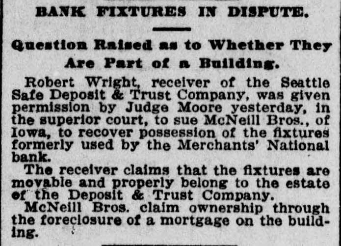BANK FIXTURES IN DISPUTE. Question Raised as to Whether They Are Part of a Building. Robert Wright, receiver of the Seattle Safe Deposit & Trust Company, was given permission by Judge Moore yesterday, in the superior court, to sue McNeill Bros., of Iowa, to recover possession of the fixtures formerly used by the Merchants' National bank. The receiver claims that the fixtures are movable and properly belong to the estate of the Deposit & Trust Company. McNeill Bros. claim ownership through the foreclosure of a mortgage on the building.