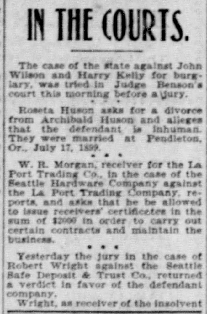 IN THE COURTS. The case of the state against John Wilson and Harry Kelly for burglary, was tried in Judge Benson's court this morning before a jury. Roseta Huson asks for a divorce from Archibald Huson and alleges that the defendant is Inhuman. They were married at Pendleton, Or., July 17, 1899. ... W. R. Morgan, receiver for the La Port Trading Co., in the case of the Beattle Hardware Company against the La Port Trading Company, reports, and asks that he be allowed to Issue receivers' certificates in the sum of $2000 in order to carry out certain contracts and maintain the business. ... Yesterday the jury in the case of Robert Wright against the Seattle Safe Deposit & Trust Co., returned a verdict in favor of the defendant company. Wright, as receiver of the insolvent