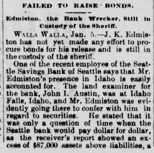 FAILED TO RAISE BONDS. Edmiston, the Bank Wrecker, Still in Custody of the Sheriff. WALLA Walla, Jan. 5.-J. K. Edmiston has not yet made any effort to procure bonds for his release and is still in the custody of the sheriff. One of the recent employes of the Seattle Savings Bank of Seattle says that Mr. Edmiston's presence in Idaho is easily accounted for. The land examiner for the bank, John L Austin, was at Idaho Falls, Idaho, and Mr. Edmiston was evidently going there to confer with him in regard to securities. He stated that it was only a question of time when the Seattle bank would pay dollar for dollar, as the receiver's report showed an excess of $87,000 assets above liabilities, a