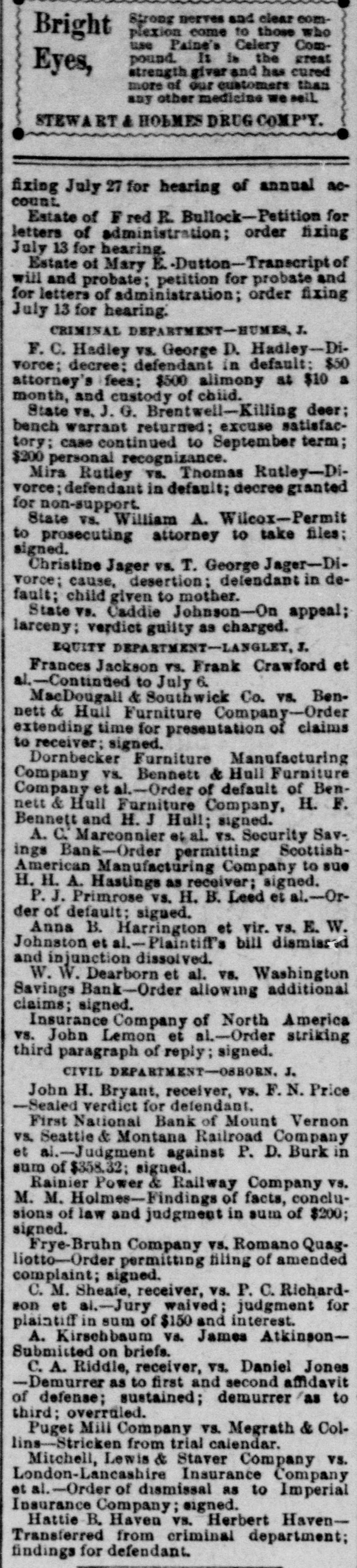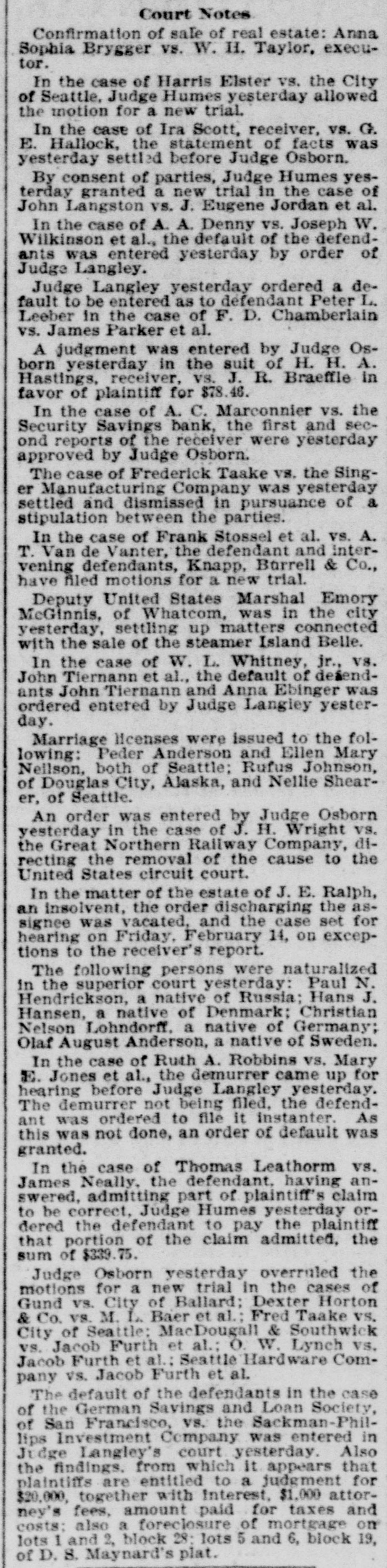 Notice is therefore hereby given that on Friday, the 28th day of June, 1896, at the hour of 10 o'clock a. m. of said day, at the front door of the court house, in the city of Seattle, King county, I will sell the above described property at public auction to the highest bidder for cash.