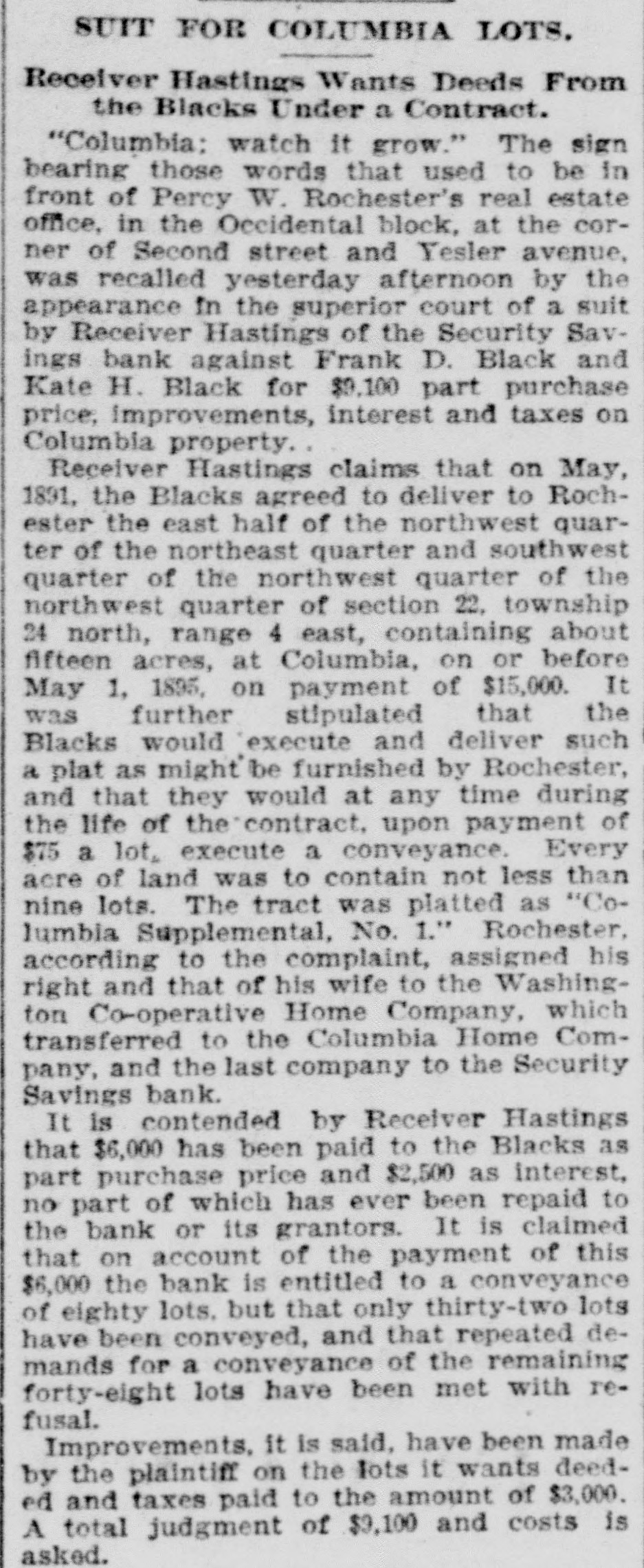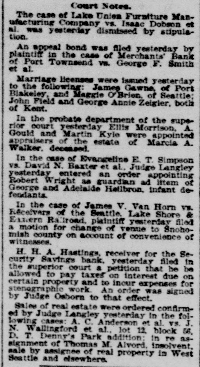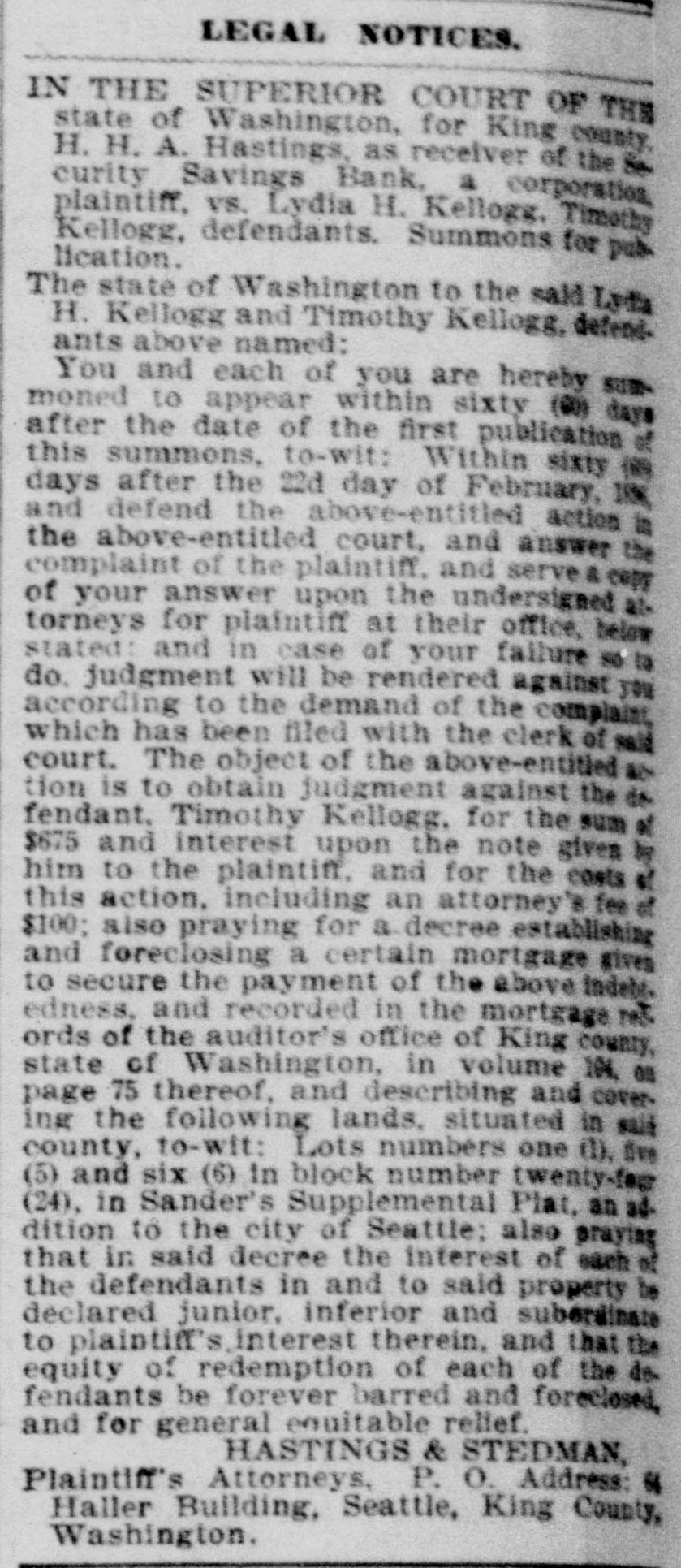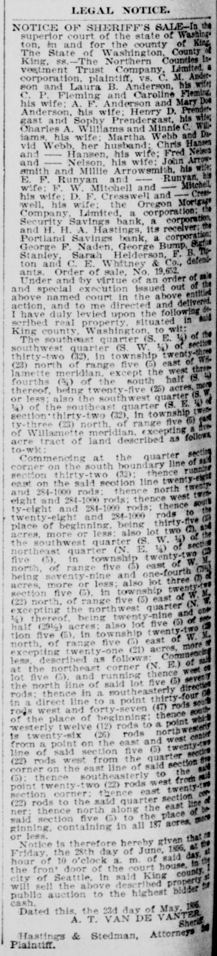 In the superior court of the state of Washing-ton, in and for the county of King. The State of Washington, County of King, ss. The Northern Counties In-vestment Trust Company, Limited, a corporation, plaintiff, vs. C. M. Ander-son and Laura B. Anderson, his wife; C. P. Fleming and Caroline Fleming, his wife; A. F. Anderson and Mary Doe Anderson, his wife; Henry D. Prender-gast and Sophy Prendergast, his wife; Charles A. Williams and Minnie C. Will-iams, his wife; Martha Webb and Da-vid Webb, her husband; Chris Hansen and- Hansen, his wife; Fred Nelson and Nelson, his wife; John Arrow-smith and Millie Arrowsmith, his wife; E. F. Runyan and - Runyan, his wife; F. W. Mitchell and - Mitchell, his wife; D. F. Cresswell and Cress-well, his wife; the Oregon Mortgage Company, Limited, a corporation; the Security Savings bank, a corporation, and H. H. A. Hastings, its receiver; the Portland Savings bank, a corporation; George F. Naden, George Bump, Sigfus Stanley, Sarah Helderson, F. B. Tipton and C. E. Whitney & Co., defendants. Order of sale, No. 19,652.