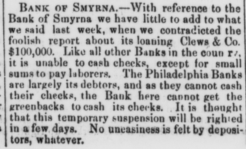BANK OF SMYRNA.- With reference to the Bank of Smyrna we have little to add to what we said last week, when we contradicted the foolish report about its loaning Clews & Co. $100,000. Like all other Banks in the coun r/, it is unable to cash checks, except for small sums to pay laborers. The Philadelphia Banks are largely its debtors, and as they cannot cash their checks, the Bank here cannot get the greenbacks to cash its checks. It is thought that this temporary suspension will be righted in a few days. No uneasiness is felt by depositors, whatever.