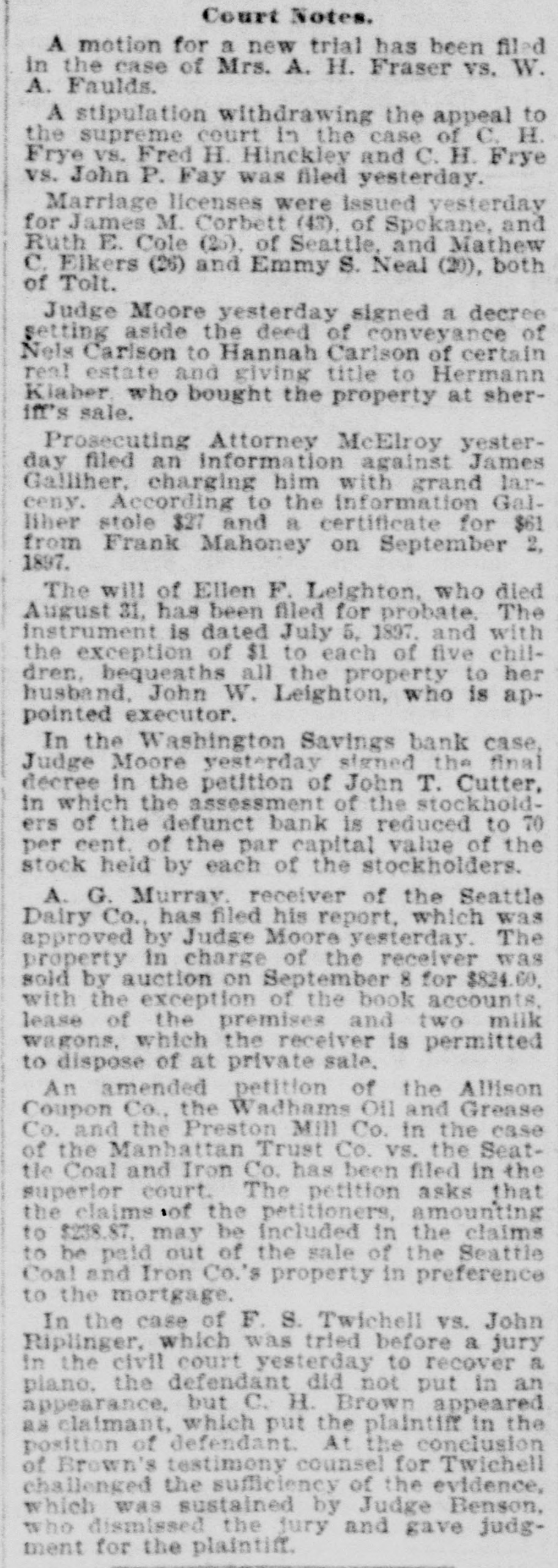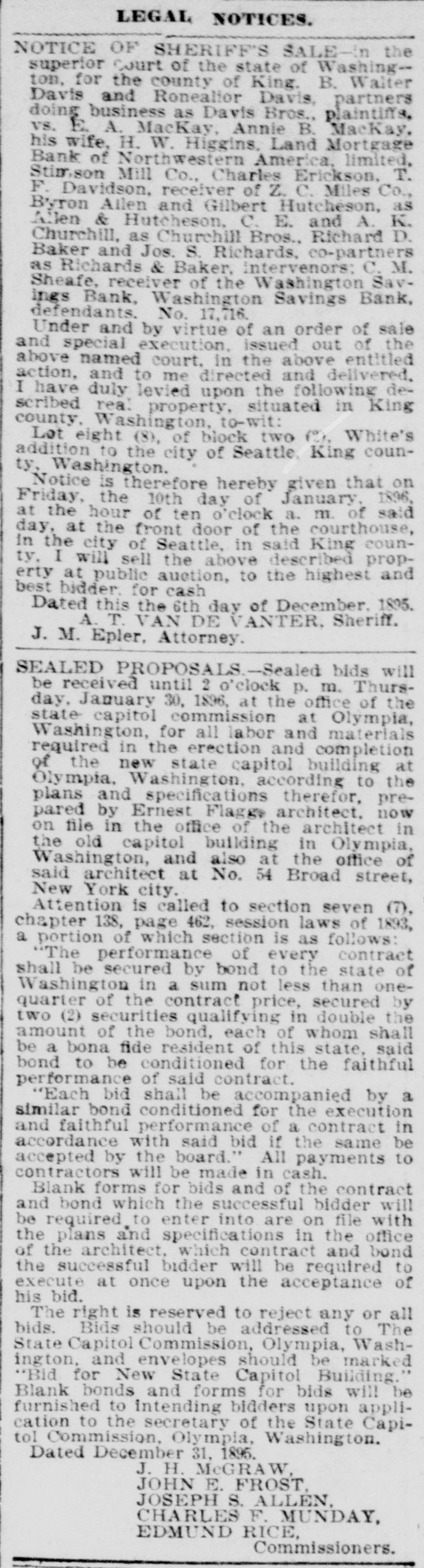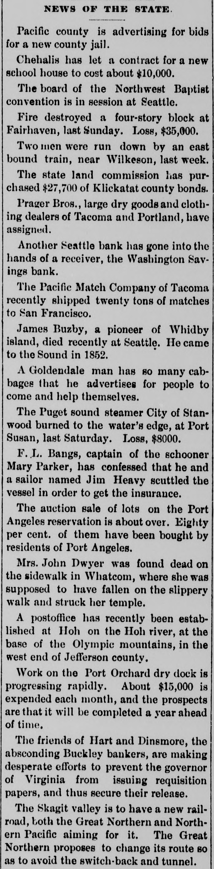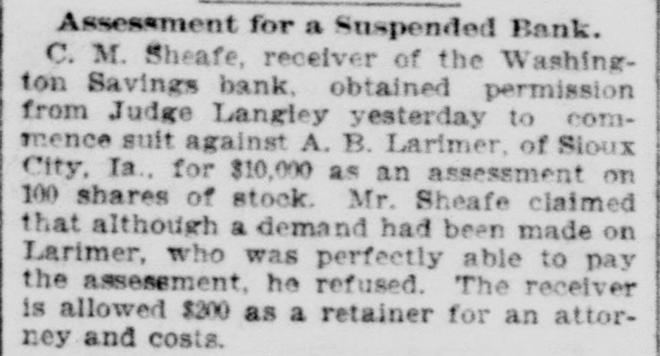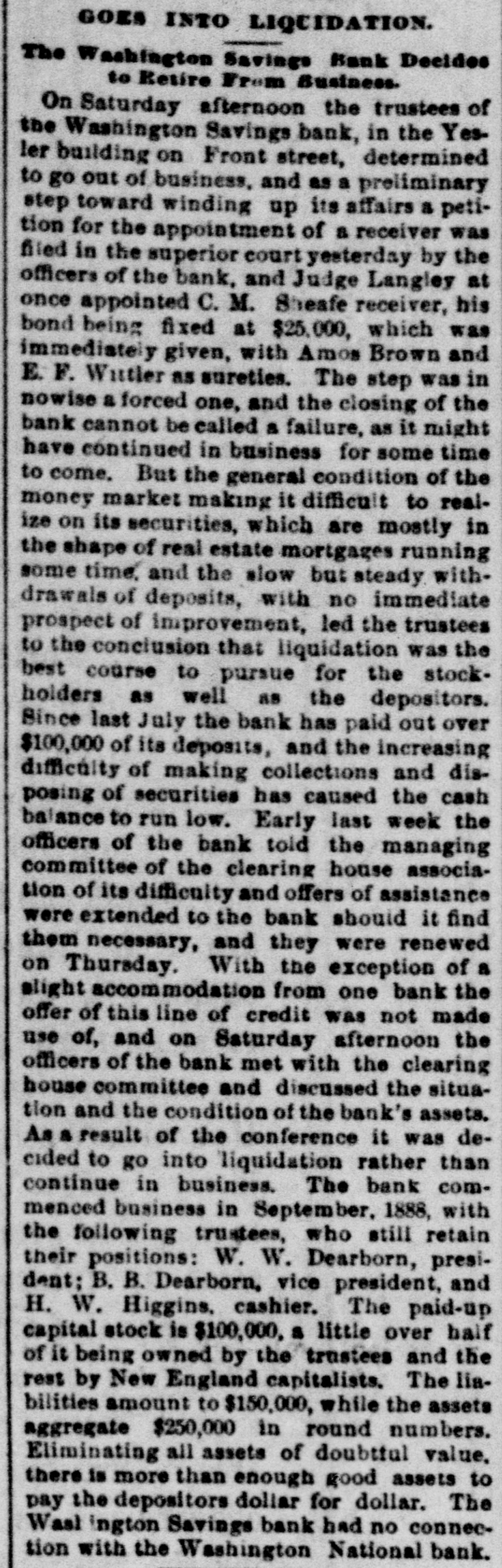 GOES INTO LIQUIDATION. The Washington Savings Bank Decides to Retire From Business. On Saturday afternoon the trustees of the Washington Savings bank, in the Yesler building on Front street, determined to go out of business, and as a preliminary step toward winding up its affairs a petition for the appointment of a receiver was filed in the superior court yesterday by the officers of the bank, and Judge Langley at once appointed C. M. Sheafe receiver, his bond being fixed at $25,000, which was immediately given, with Amos Brown and E. F. Wittler as sureties. The step was in nowise a forced one, and the closing of the bank cannot be called a failure, as it might have continued in business for some time to come. But the general condition of the money market making it difficult to realize on its securities, which are mostly in the shape of real estate mortgages running some time. and the slow but steady withdrawals of deposits, with no immediate prospect of improvement, led the trustees to the conclusion that liquidation was the best course to pursue for the stockholders as well as the depositors. Since last July the bank has paid out over $100,000 of its deposits, and the increasing difficulty of making collections and disposing of securities has caused the cash balance to run low. Early last week the officers of the bank told the managing committee of the clearing house association of its difficulty and offers of assistance were extended to the bank should it find them necessary, and they were renewed on Thursday. With the exception of a slight accommodation from one bank the offer of this line of credit was not made use of, and on Saturday afternoon the officers of the bank met with the clearing house committee and discussed the situation and the condition of the bank's assets. As a result of the conference it was decided to go into liquidation rather than continue in business. The bank commenced business in September, 1888, with the following trustees, who still retain their positions: W. W. Dearborn, president; B. B. Dearborn, vice president, and H. W. Higgins, cashier. The paid-up capital stock is $100,000, a little over half of it being owned by the trustees and the rest by New England capitalists. The liabilities amount to $150,000, while the assets aggregate $250,000 in round numbers. Eliminating all assets of doubtful value. there is more than enough good assets to pay the depositors dollar for dollar. The Wast ington Savings bank had no connection with the Washington National bank.