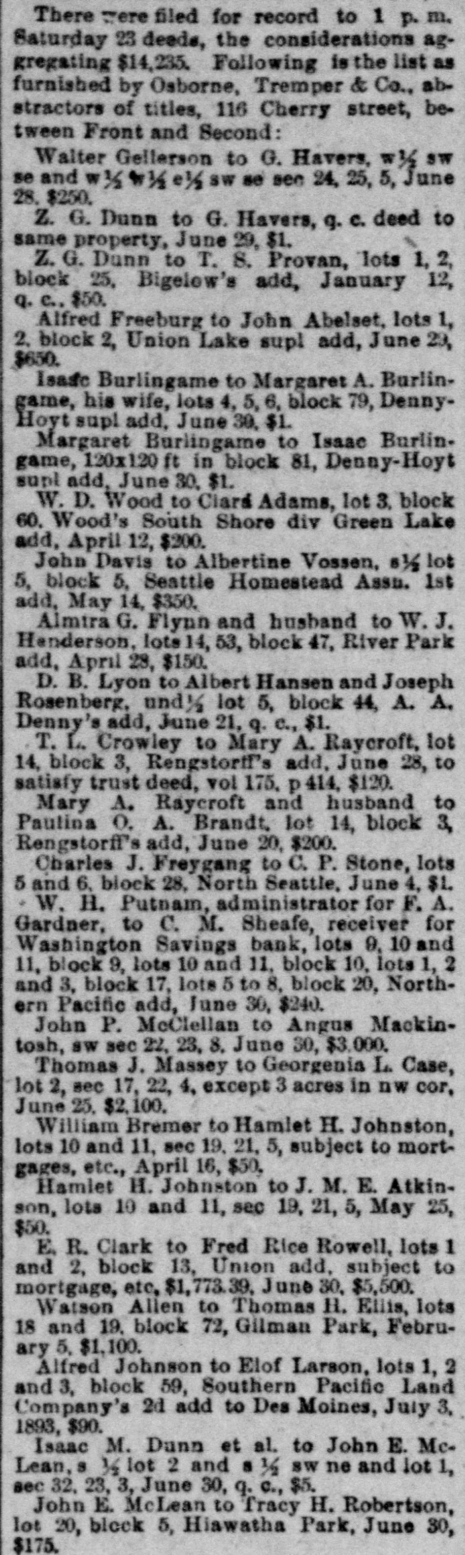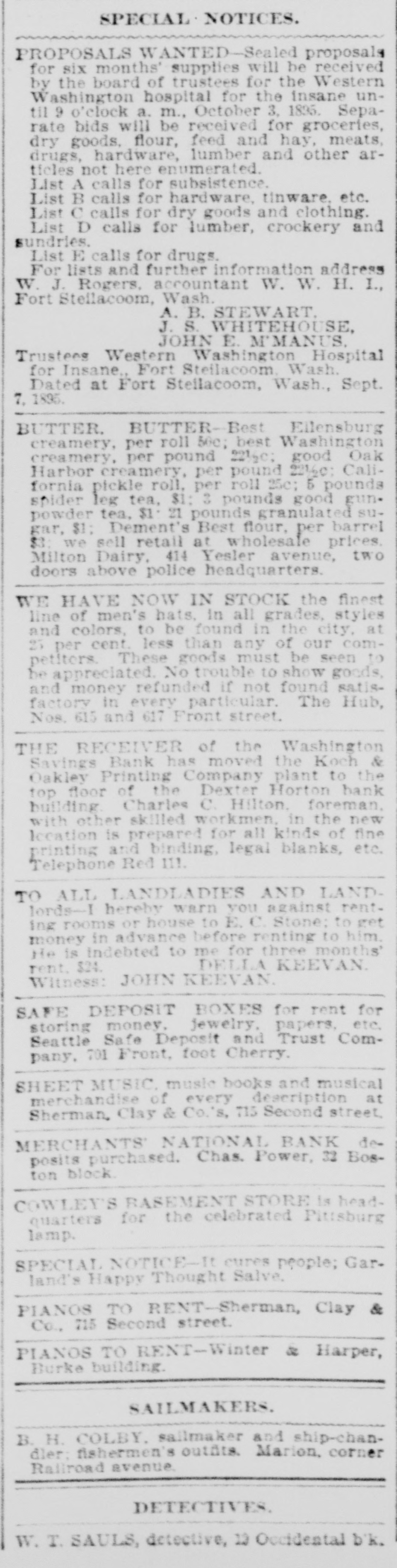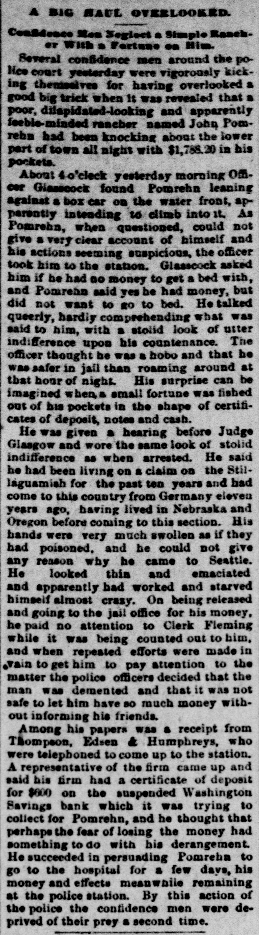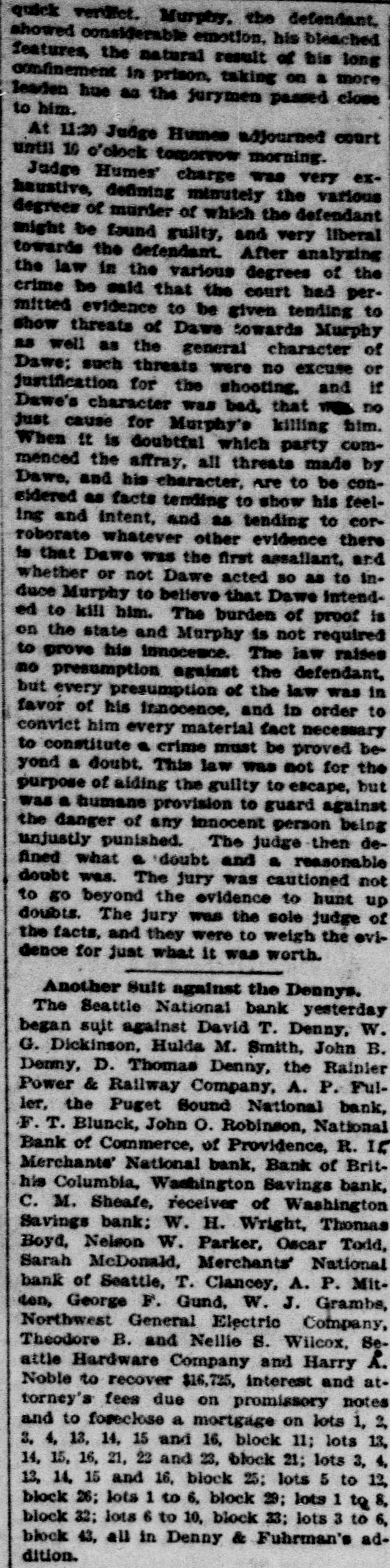 GOES INTO LIQUIDATION. The Washington Savings Bank Decides to Retire From Business. On Saturday afternoon the trustees of the Washington Savings bank, in the Yesler building on Front street, determined to go out of business, and as a preliminary step toward winding up its affairs a petition for the appointment of a receiver was filed in the superior court yesterday by the officers of the bank, and Judge Langley at once appointed C. M. Sheafe receiver, his bond being fixed at $25,000, which was immediately given, with Amos Brown and E. F. Wittler as sureties. The step was in nowise a forced one, and the closing of the bank cannot be called a failure, as it might have continued in business for some time to come. But the general condition of the money market making it difficult to realize on its securities, which are mostly in the shape of real estate mortgages running some time. and the slow but steady withdrawals of deposits, with no immediate prospect of improvement, led the trustees to the conclusion that liquidation was the best course to pursue for the stockholders as well as the depositors. Since last July the bank has paid out over $100,000 of its deposits, and the increasing difficulty of making collections and disposing of securities has caused the cash balance to run low. Early last week the officers of the bank told the managing committee of the clearing house association of its difficulty and offers of assistance were extended to the bank should it find them necessary, and they were renewed on Thursday. With the exception of a slight accommodation from one bank the offer of this line of credit was not made use of, and on Saturday afternoon the officers of the bank met with the clearing house committee and discussed the situation and the condition of the bank's assets. As a result of the conference it was decided to go into liquidation rather than continue in business. The bank commenced business in September, 1888, with the following trustees, who still retain their positions: W. W. Dearborn, president; B. B. Dearborn, vice president, and H. W. Higgins, cashier. The paid-up capital stock is $100,000, a little over half of it being owned by the trustees and the rest by New England capitalists. The liabilities amount to $150,000, while the assets aggregate $250,000 in round numbers. Eliminating all assets of doubtful value. there is more than enough good assets to pay the depositors dollar for dollar. The Wast ington Savings bank had no connection with the Washington National bank.