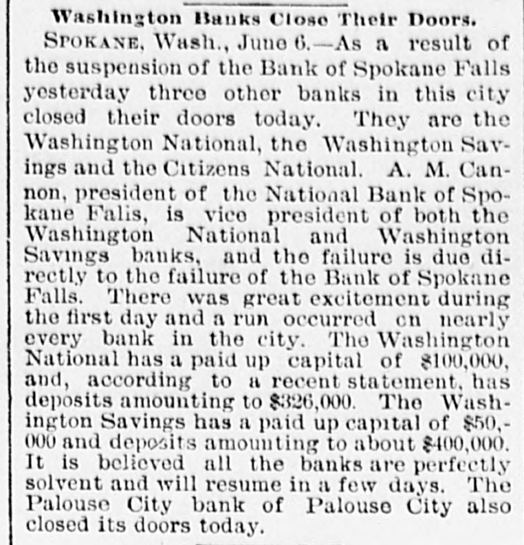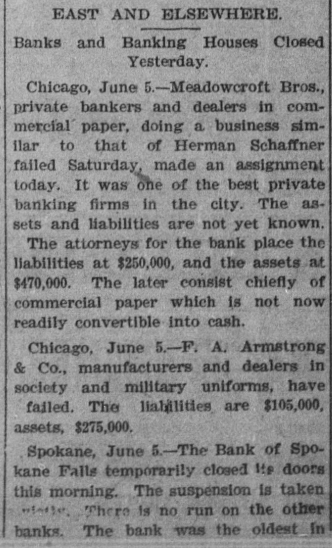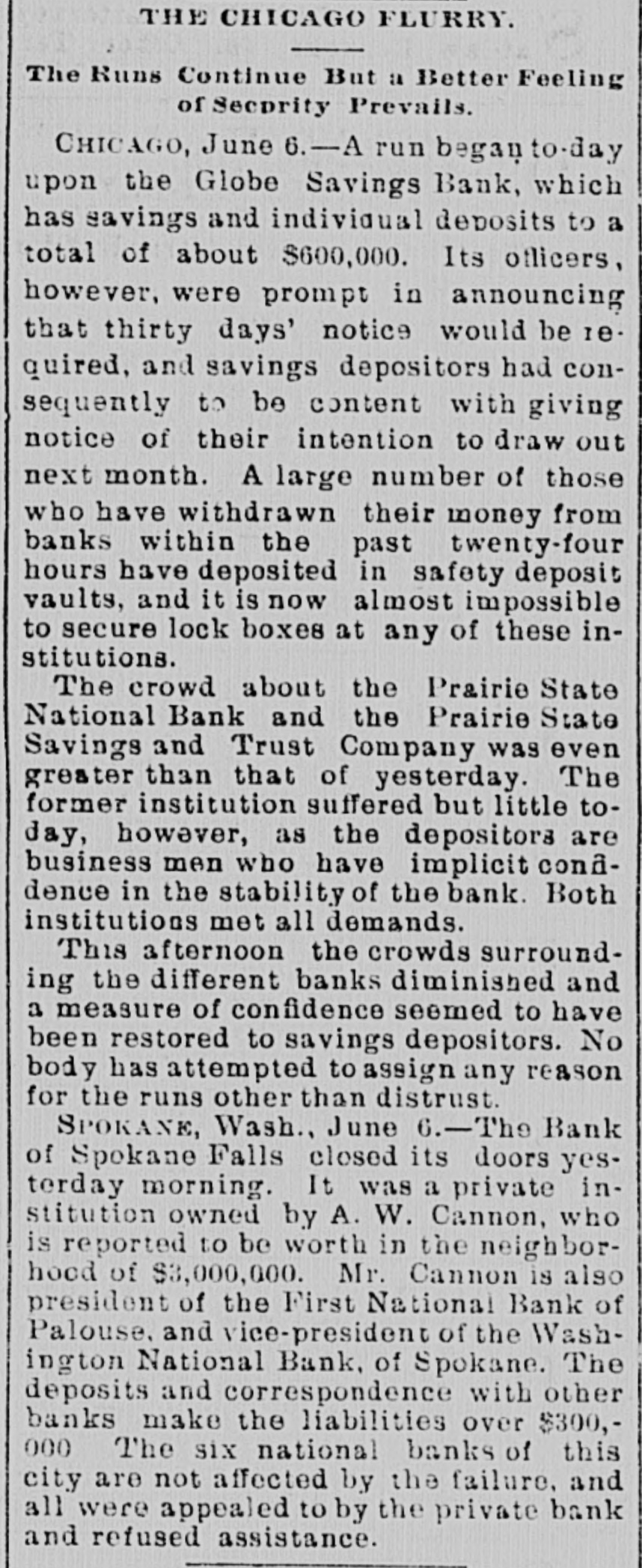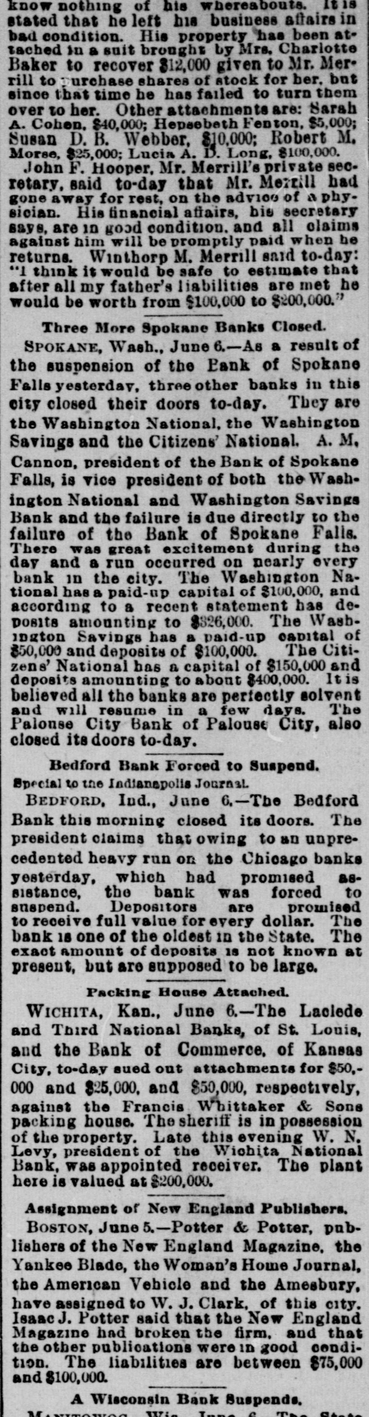 know nothing of his whereabouts. 1218 stated that he left his business affairs in bad condition. His property has been attached in a suit brought by Mrs. Charlotte Baker to recover $12,000 given to Mr. Merrill to urchase shares of stock for her. but since that time he has failed to turn them over to her. Other attachments are: Sarah A. Cohen. $40,000; Hepsebeth Fenton, $5,000; Susan D. B. Webber, $10,000; Robert M. Morse, $25,000; Lucia A. D. Long, $100,000. John F. Hooper. Mr. Merrill's private secretary, said to-day that Mr. Merrill had gone away for rest, on the advice of a physician. His financial affairs, his secretary says, are in good condition. and all claims against him will be promptly paid when he returns. Winthorp M. Merrill said to-day: "1 think it would be safe to estimate that after all my father's liabilities are met he would be worth from $100,000 to $200,000." Three More Spokane Banks Closed. SPOKANE, Wash., June 6.-As a result of the suspension of the Pank of Spokane Falls yesterday, three other banks in this city closed their doors to-day. They are the Washington National, the Washington Savings and the Citizens' National. A. M. Cannon, president of the Bank of Spokane Falls, is vice president of both the Washington National and Washington Savings Bank and the failure is due directly to the failure of the Bank of Spokane Falls. There great excitement during the run occurred on day and was a Washington nearly every Nabank in the city. The tional has a paid-up capital of $100,000, and according to a recent statement has deto $326,000. posits amounting The capital Wash- of 1D g ton Savings has a paid-up $50,000 and deposits of $100,000. The Citiof $150,000 and to about zens' deposits National amounting has a capital $400,000. It is believed all the banks are perfectly solvent and will resume in a few days. The Palonse City Bank of Palouse City, also closed its doors to-day. Bedford Bank Forced to Suspend. Special to the Indianapolis Journal BEDFORD, Ind., June 6.-The Bedford Bank this morning closed its doors. The president claims that owing to an unprecedented heavy run on the Chicago banks yesterday, which had promised assistance, the bank was forced to suspend. Depositors are promised to receive full value for every dollar. The bank 18 one of the oldest in the State. The exact amount of deposits 18 not known at present, but are supposed to be large. Packing House Attached. WICHITA, Kan., June 6.-The Laclede and Third National Banks, of St. Louis, and the Bank of Commerce, of Kansas City, to-day sued out attachments for $50.000 and $25,000, and $50,000, respectively, against the Francis Whittaker & Sone house. Late this evening N. packing of the property. The sheriff is in possession W. Levy, president of the Wichita National Bank, was appointed receiver. The plant here is valued at $200,000. Assignment of New England Publishers. BOSTON, June 5.-Potter & Potter, publishers of the New England Magazine, the Yankee Blade, the Woman's Home Journal, the American Vehicle and the Amesbury, have assigned to W. J. Clark, of this city. Isaac J. Potter said that the New England Magazine had broken the firm. and that the other publications were in good condition. The liabilities are between $75,000 and $100,000. A Wisconsin Bank Suspends. Lane The State
